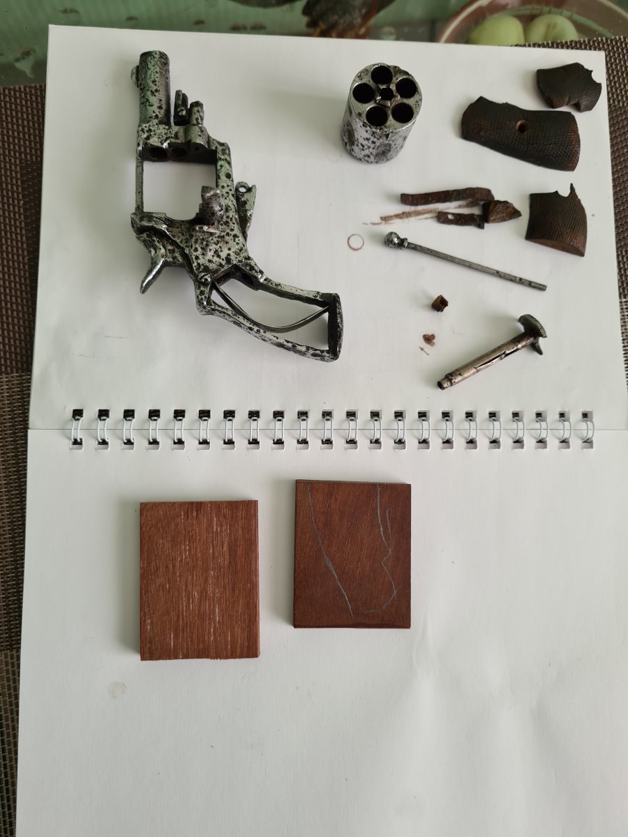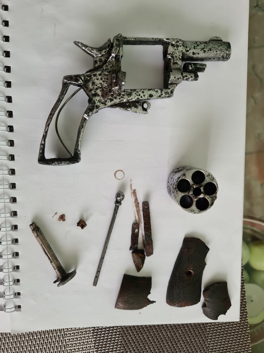Револьвер Бельгия форточка открывается и держится механика работает взводится баран снимается дальше не разбирал. Калибр 7 мм глубина барана 25 мм. . Пружина боевая не пружина просто ровная полоска стали.нужно согнуть правильно Родная и накладки убиты временем . Есть два куска красного дерева на накладки. Сломан удленнитель спускового крючка в месте соединения надо наварить или сделать новый. Клейма отполирован после продажи могу заворонить клевером. Всё что на фотонаварили утраченный фрагмент спускового крючка теперь в умелые руки. Придать форму и просверлить отверстие!! Фото добавил.