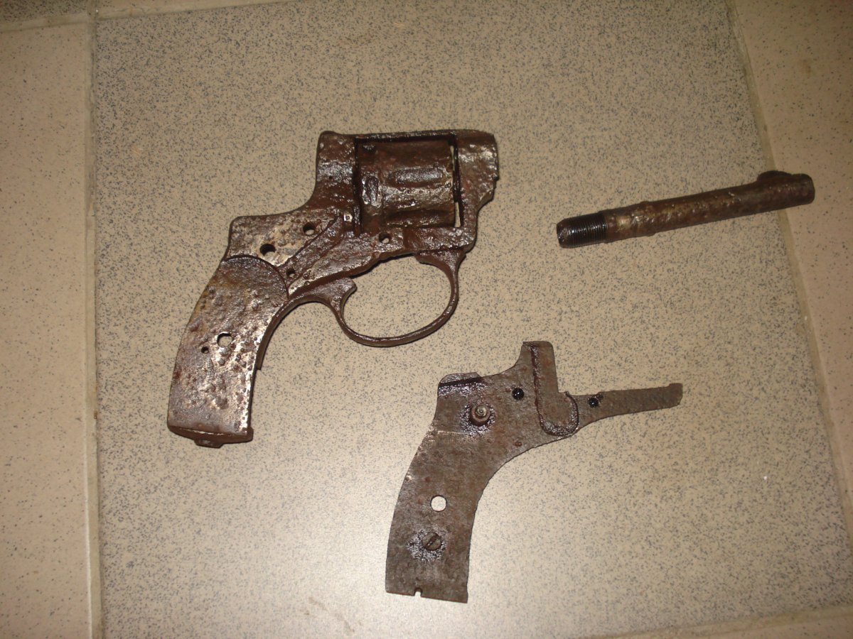 револьвер-наган. коп. почищений і змащений.частково розібраний.барабан крутиться.пустий. ствол трохи вичищений. відкручується.на стволі--клеймо--буква.напис*імператорський тульский оружейний завод * і рік--ледве видно.більше клейм не знайшов.в продажі все що на фото.некомплект.метал в хорошому стані--крепкий.