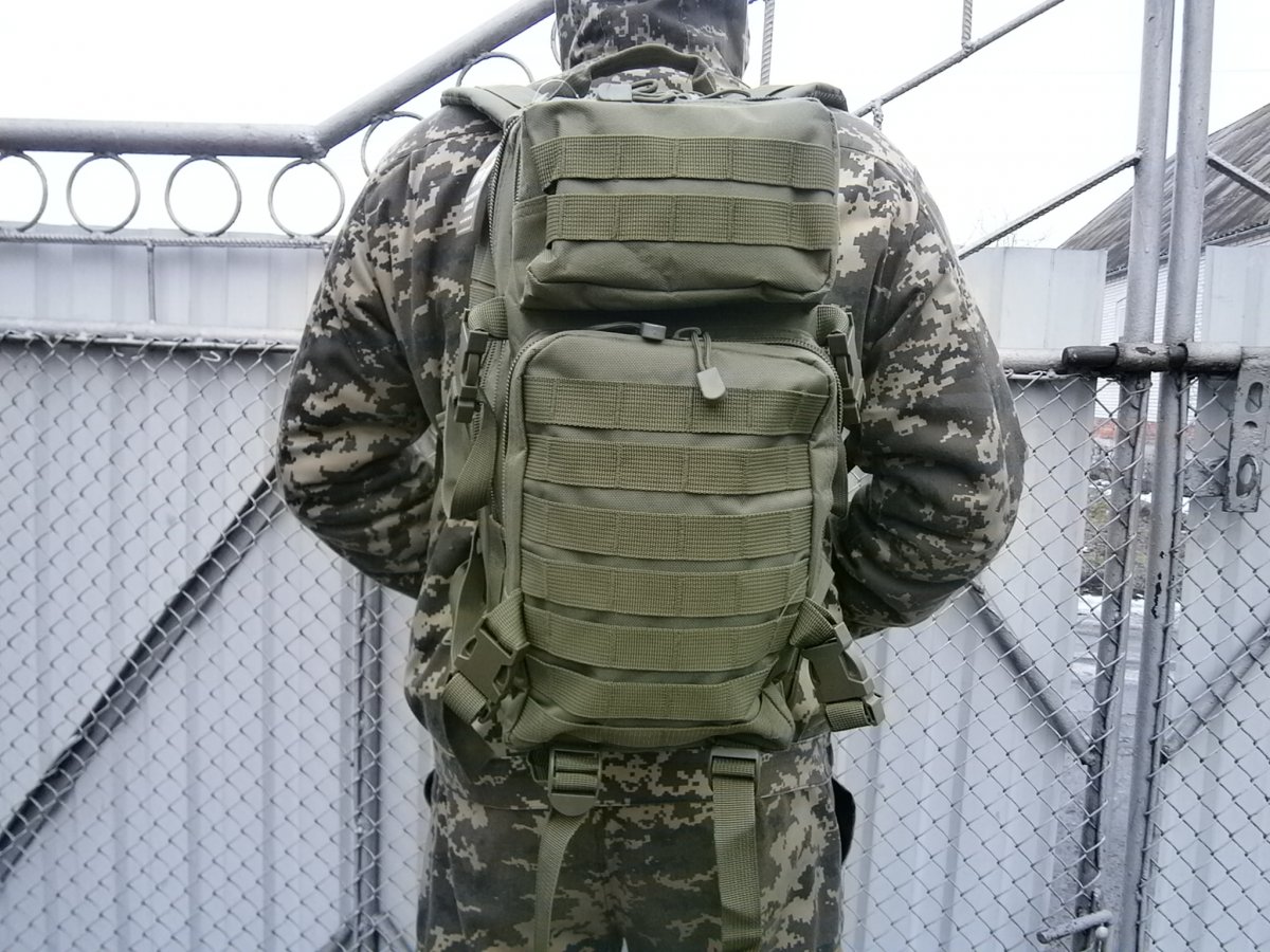 Прочный рюкзак с фронтальными карманами, поясным ремнём и вентилируемой спиной. Имеет большое основное отделение, открывающееся до самого дна и второе отделение – поменьше, открывающееся на 2/3 высоты рюкзака. Основное отделение вместительное, в нём есть небольшой карман на молнии и большой карман-сетка. Второе отделение имеет несколько сетчатых карманов. Фронтальная сторона оснащена небольшим карманом в верхней части и большим в нижней. Нижний карман имеет несколько внутренних отделений для удобного размещения мелких предметов. Основные отделения и карманы закрываются на молнии с удобными петлями для пальцев. Также имеется большой карман на стороне, прилегающей к спине и закрывающийся на липучку. Края его остаются свободными, для вывода шланга гидратора. По бокам рюкзака размещены регулируемые ремни-стяжки на фастексах, которыми можно закрепить дополнительное снаряжение или изменить толщину рюкзака. Наплечные лямки мягкие, регулируются и оборудованы D-кольцами. Поясной ремень закрывается на фастекс и регулируется по объёму талии. Рюкзак имеет множество Molle-строп, что позволяет закреплять необходимое снаряжение в самой удобной комбинации и менять набор необходимых аксессуаров и подсумков в зависимости от поставленных задач. Снизу расположены две регулируемые ленты-стяжки, которыми можно прикрепить спальник, коврик или другое снаряжение. Рюкзак имеет крепкую ручку для переноски. Спина и лямки оснащены мягкими подкладками с сетками для вентиляции и лучшего потоотделения. Все использованные пряжки жёсткие, лямки плотные, швы добротно простроченные, что увеличивает надёжность и прочность рюкзака. Ткань: 100% полиэстер Габариты: 45 х 25 х 20 см.