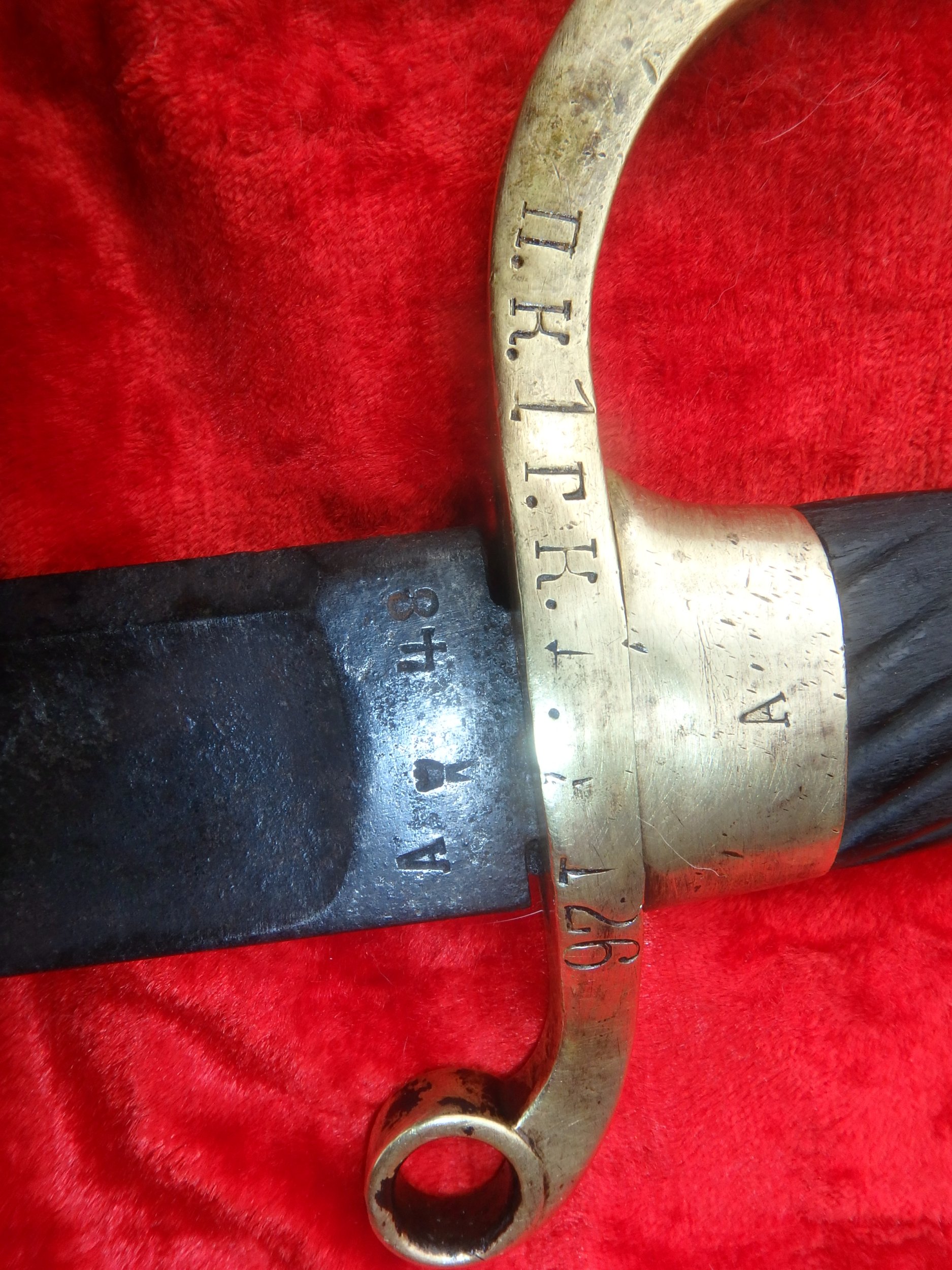 Гарда, рукоять в норме, дерево родное. Как на меня и крепежная гайка не откручивалась. Щель между клинком и гардой, это место , от толщины отгнившего кожаного амортизатора. Который по видимому, пересох и высыпался. Все надписи, клейма читаются хорошо.