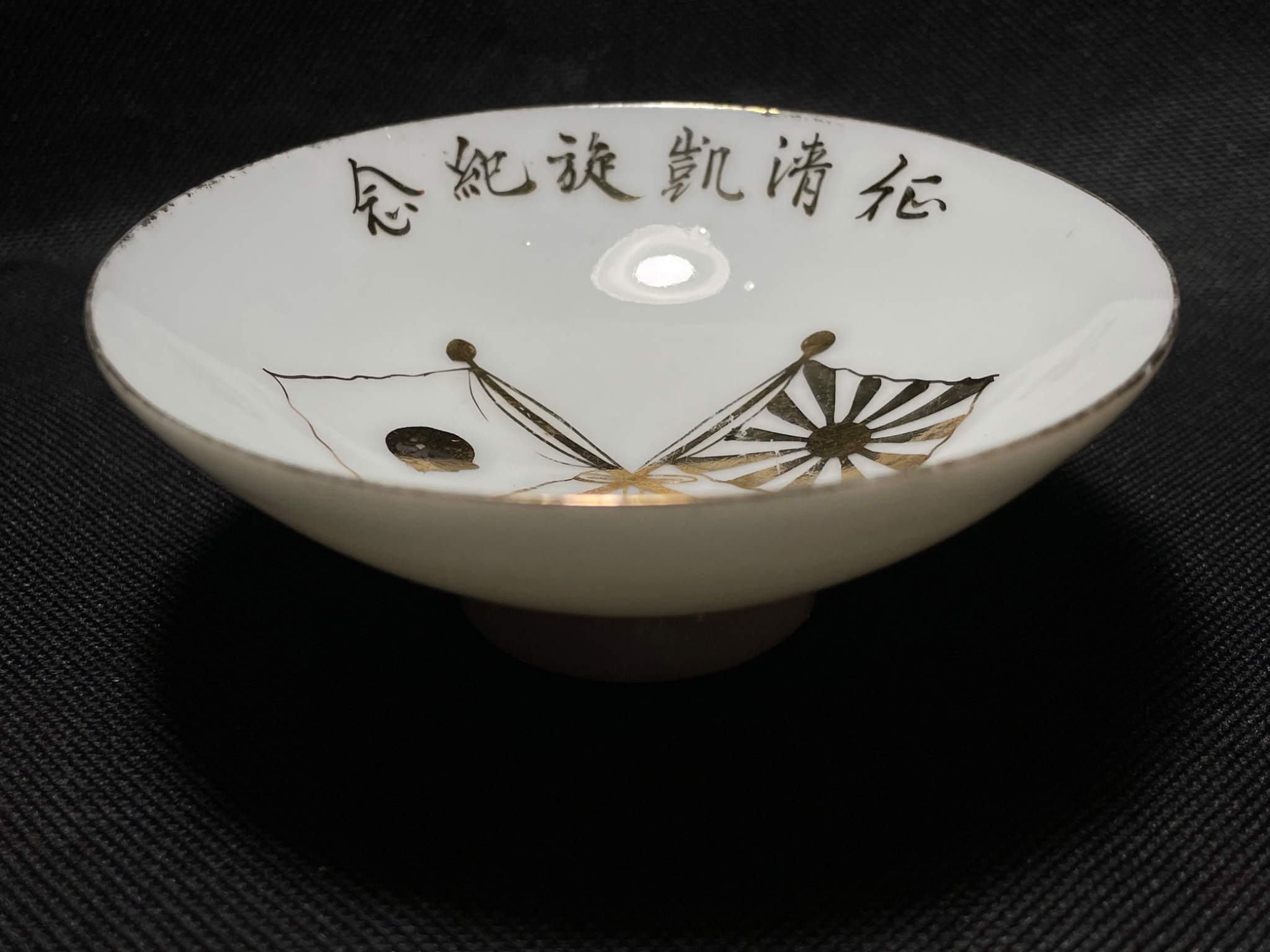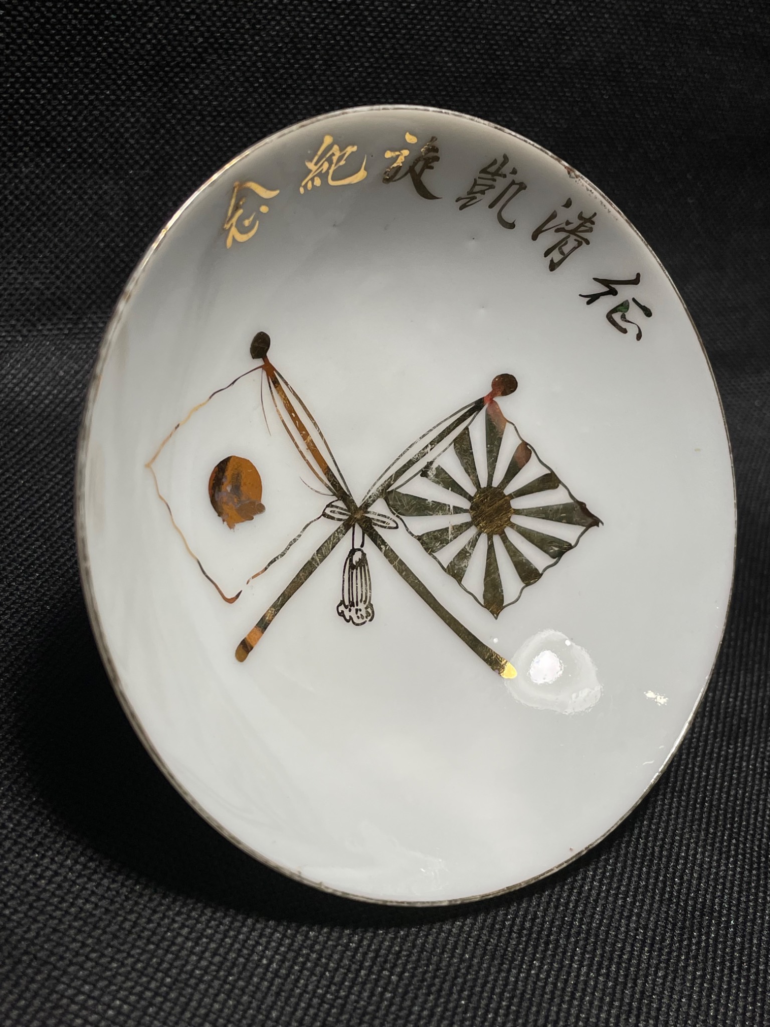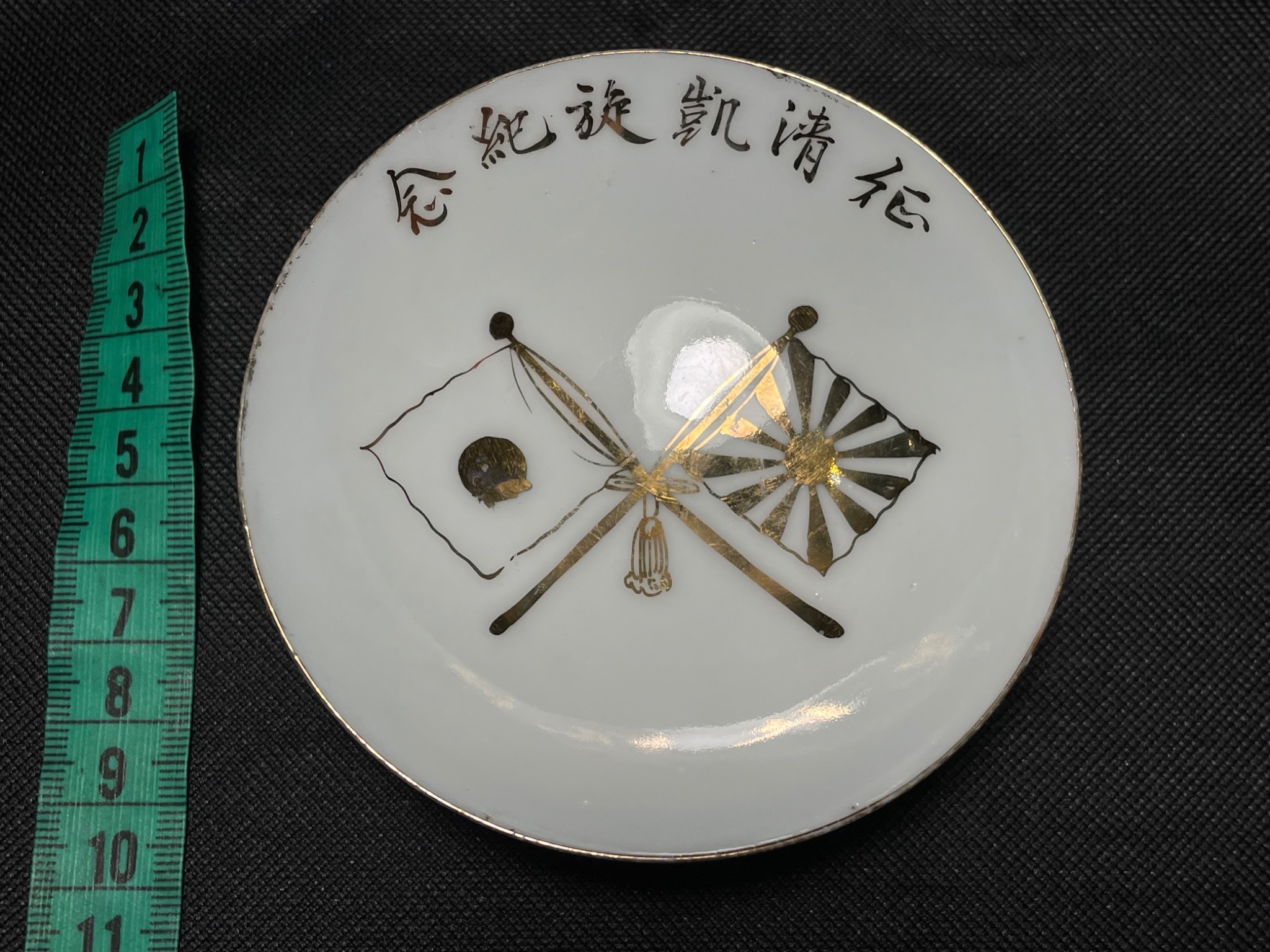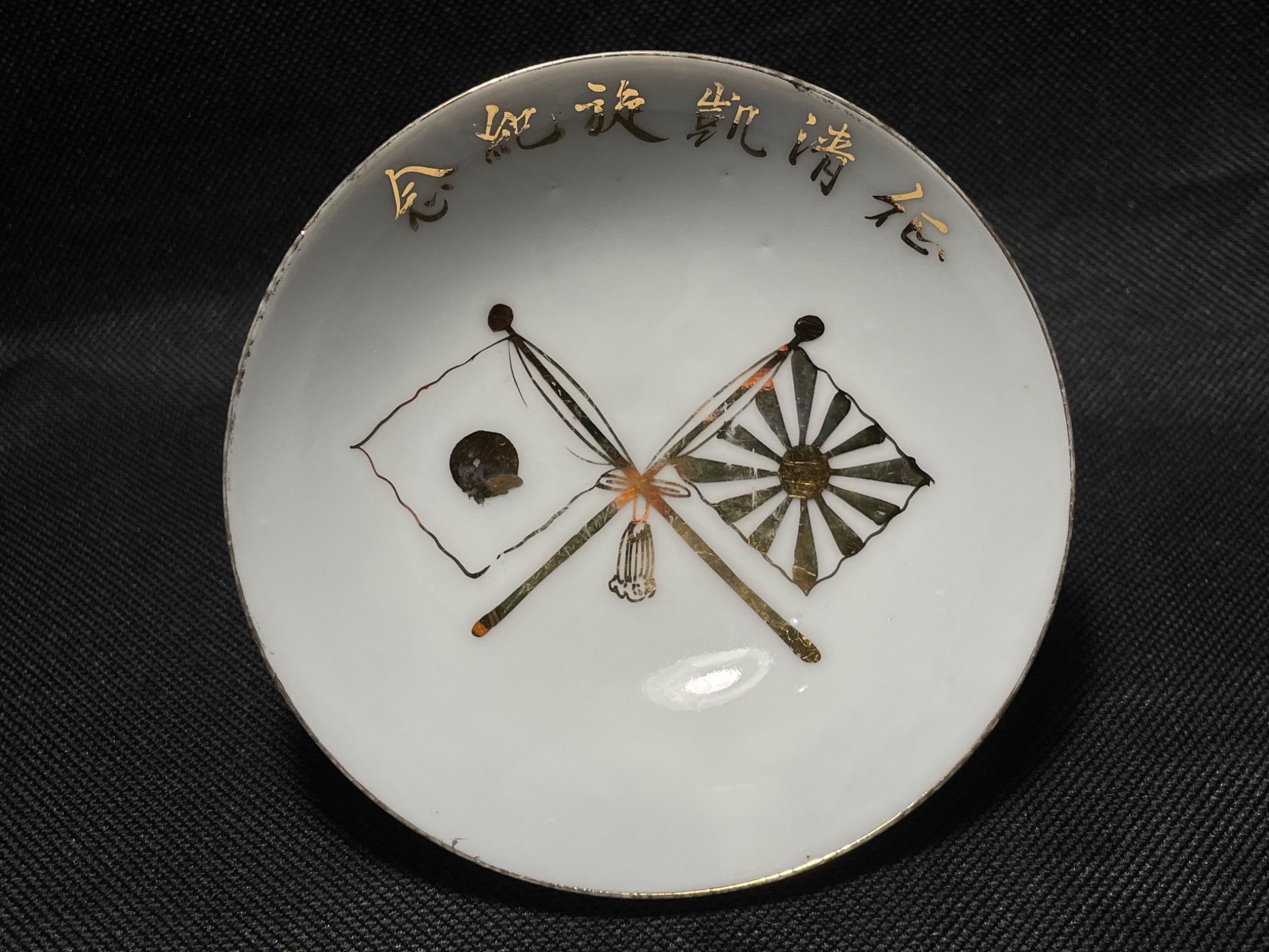 Стан задовільний, оригінал. Період Другої Світової війни. Виготовлено з порцеляни. Присутні ознаки часу та використання. Зображення схрещених прапорів, один з яких — японський прапор, а інший — прапор із зображенням висхідного сонця (Kyokujitsu-ki), що використовувався Імператорською армією. Чудове доповнення до колекції