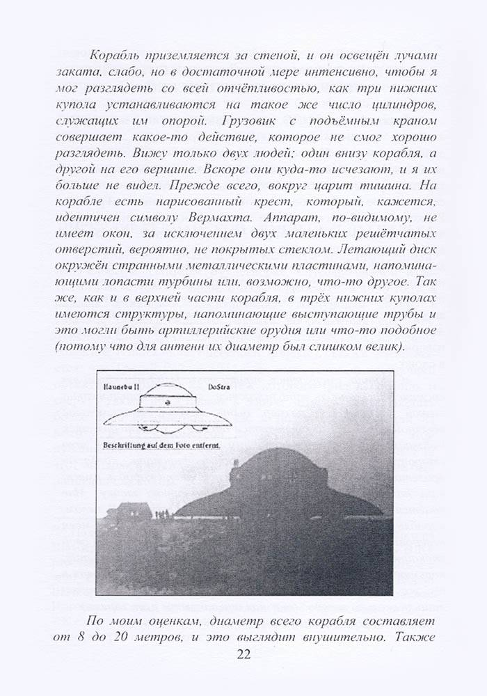 Эта брошюра Мигеля Серрано является не самой известной его книгой. Как видно из названия, этот текст повествует нам о некоторых секретных разработках Третьего Райха в области летательной техники (не обошёл дон Мигель своим вниманием и антарктические базы Райха). Оригинальный текст изобилует картинками, схемами, чертежами, которые дон Мигель комментирует. Но, к превеликому сожалению, у нас есть только сам текст и несколько картинок, которые прикрепили к нему авторы электронной версии.