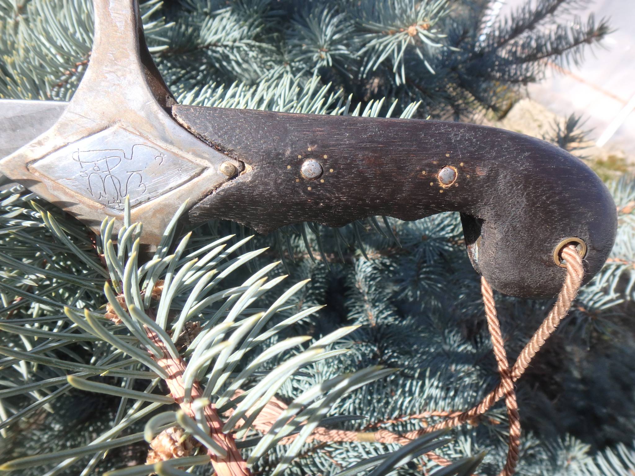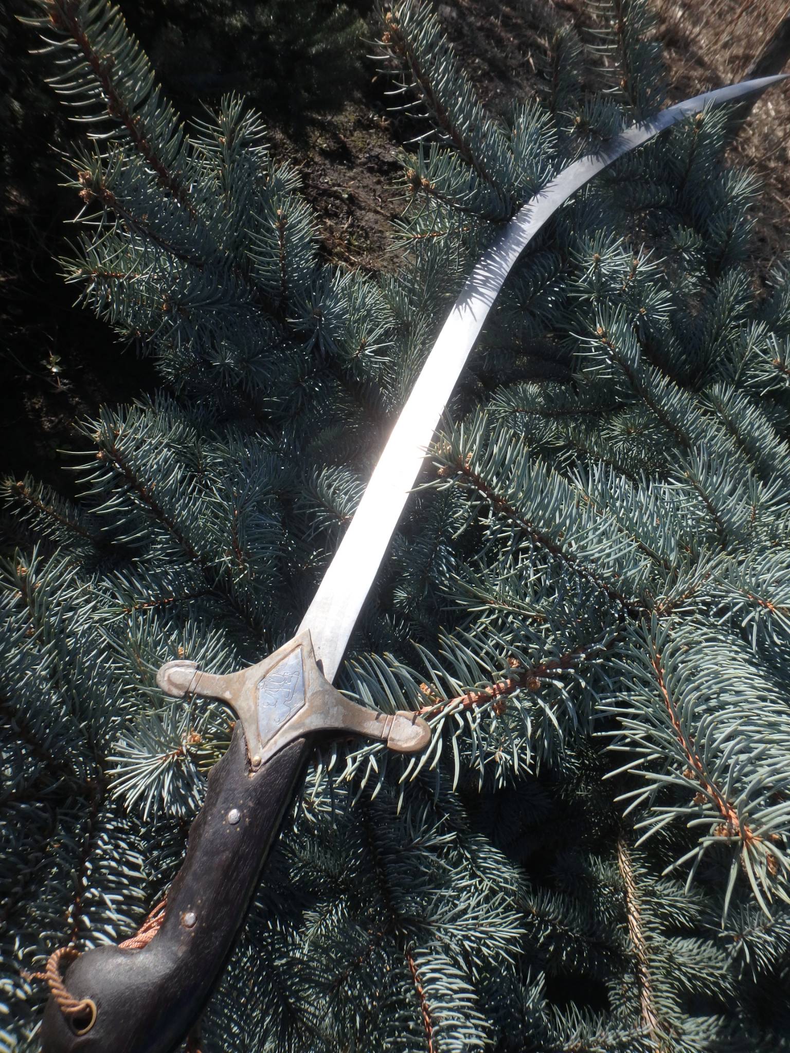 Гарда латунь, ромб травлен, надписи ручной штихель. Ромб на гарде , внутри покрыт серебром, по нем гравировалась надпись, с обратной стороны покрытие практически полностью истерлось. На клинке клеймо, надпись и всечка предполагаю, золотаой проволоки.