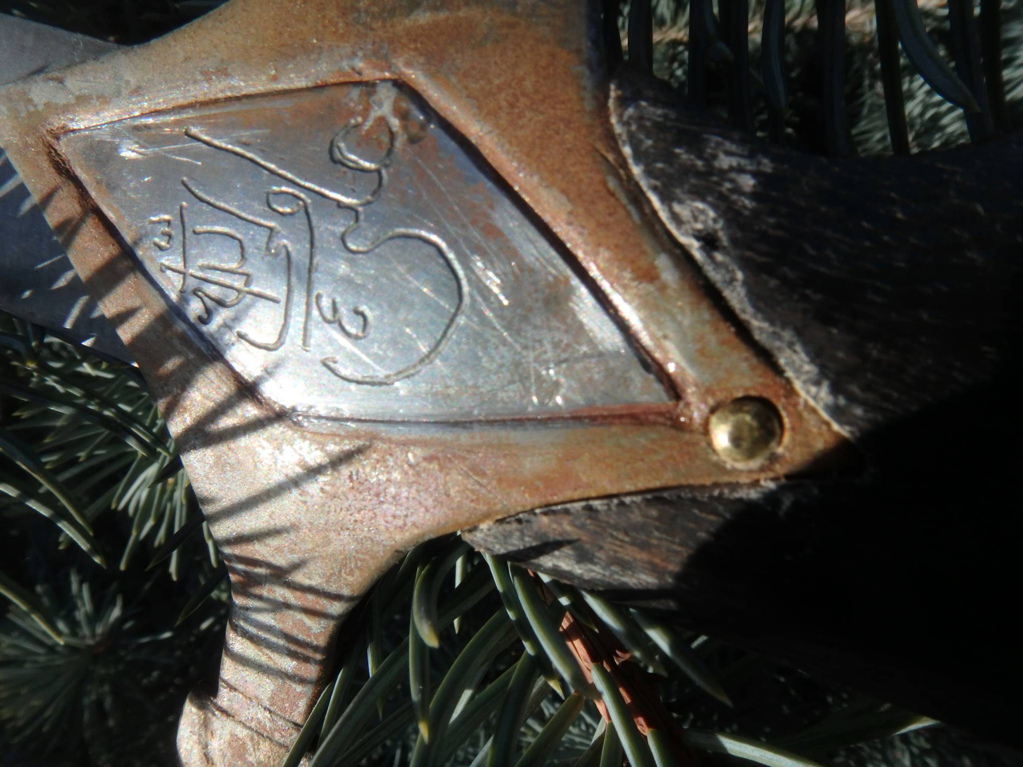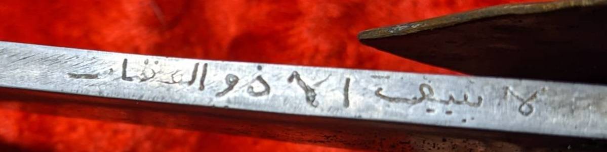 . Это часть надписи на клинке , знаменитая фраза «Бисмиллях» (Во имя Аллаха). Из-за износа и способа нанесения (гравировка с последующей всечкой, которая частично выпала) читается не идеально, но характерные очертания букв «باسم الله» узнаваемы. На клинках это служило своего рода оберегом и благословением для владельца.