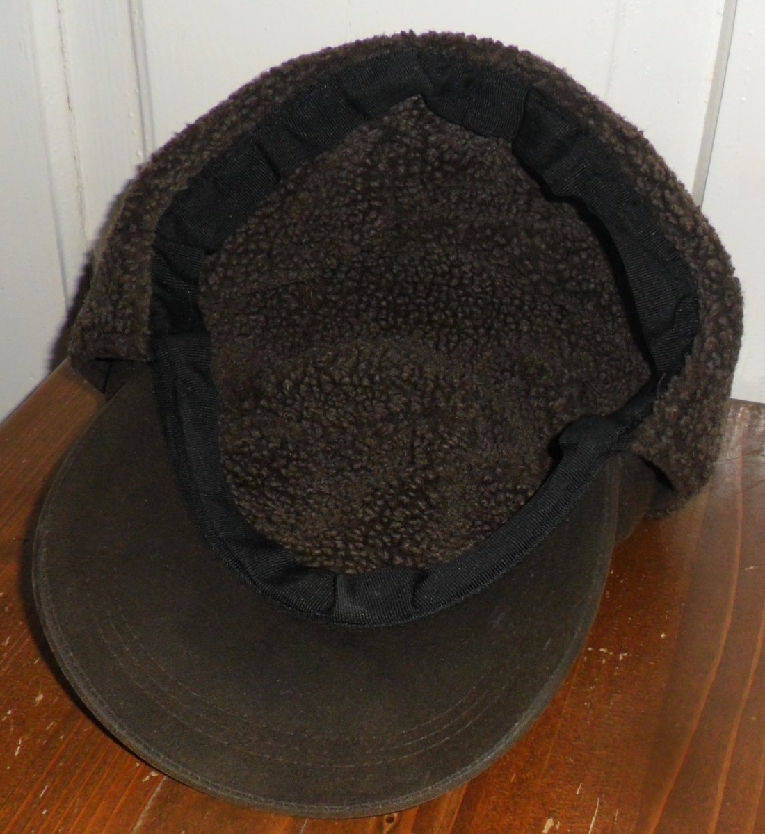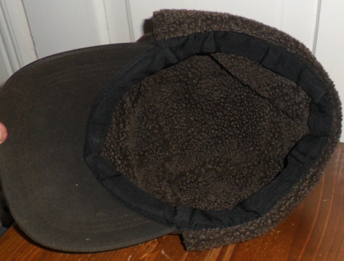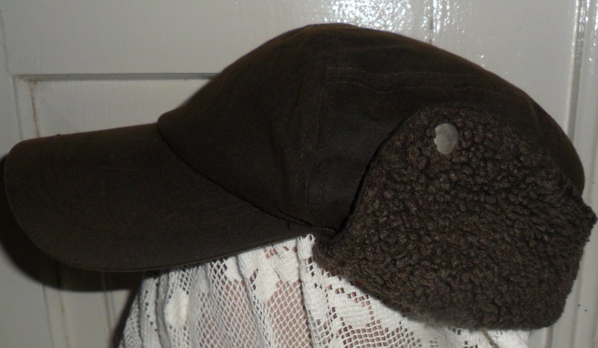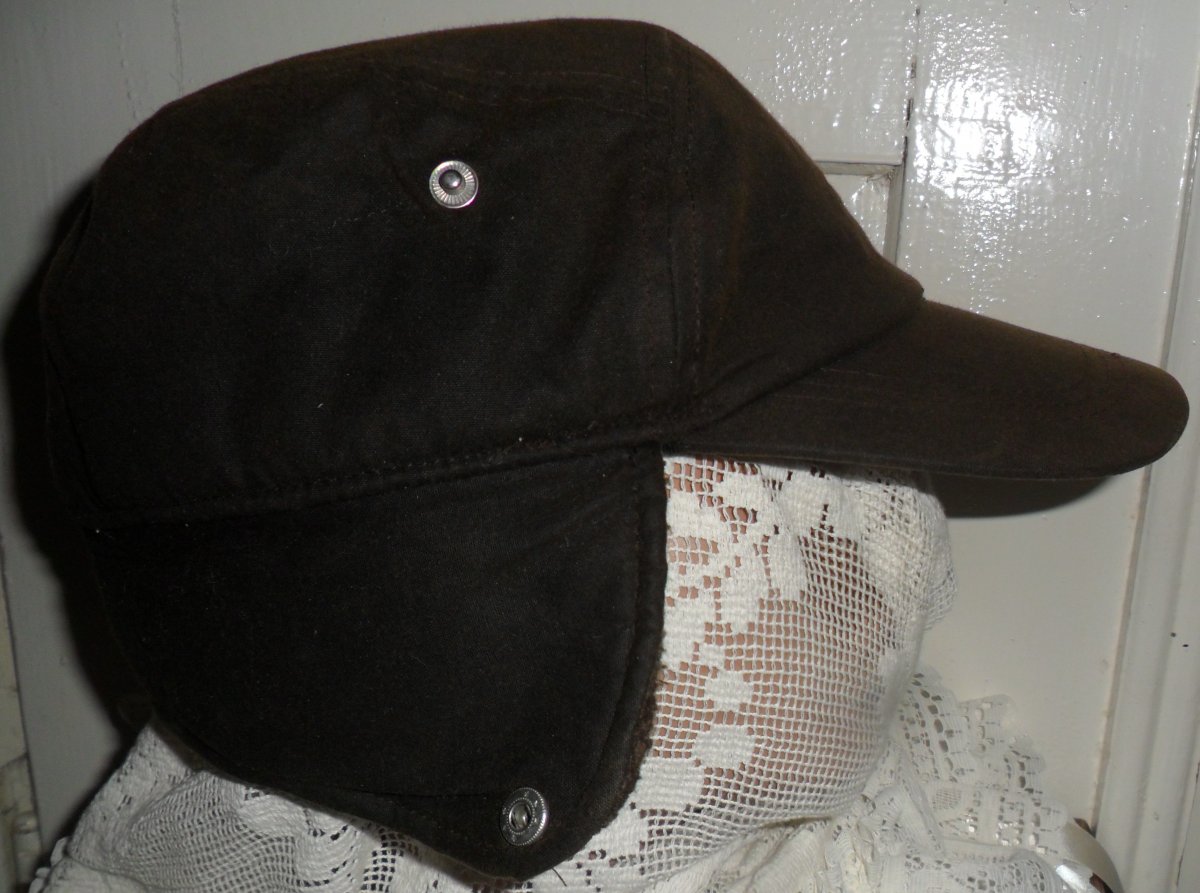 Кепка тепла вологостійка: вощений котон (waxed cotton) з утепленням (акрилове хутро), колір темно-коричневий.