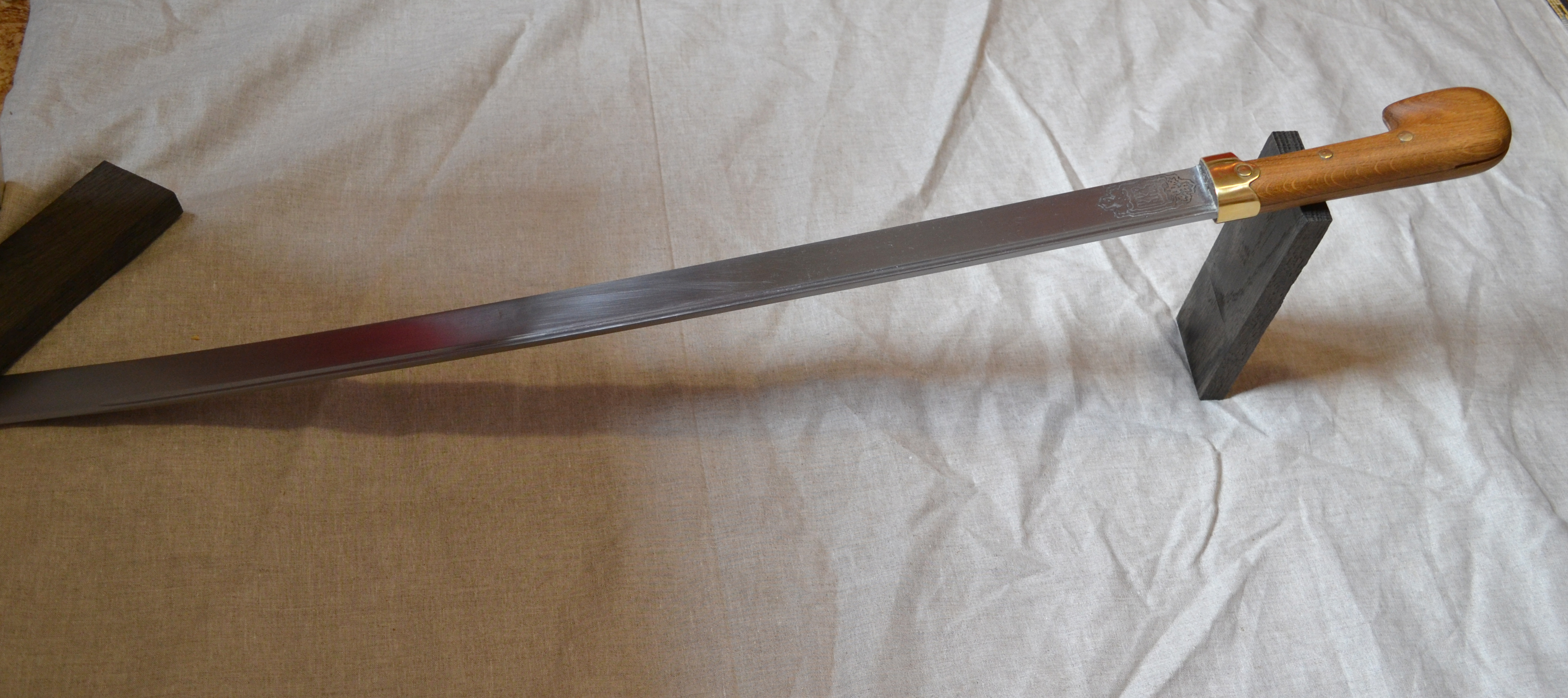 Лезо - сталь 60хгс(ресора), ковка, закалка, відпуск. Пружинить (дивись фото), твердість близько 50 одиниць (рубає сталь 3 лист товщиною 2 мм.), довжина 74 см., товщина у обуха 5,5 мм. у кінця 3 мм., зі сторони ріжучої кромки зведення 1,3-1,2 мм.(лезо незаточене).