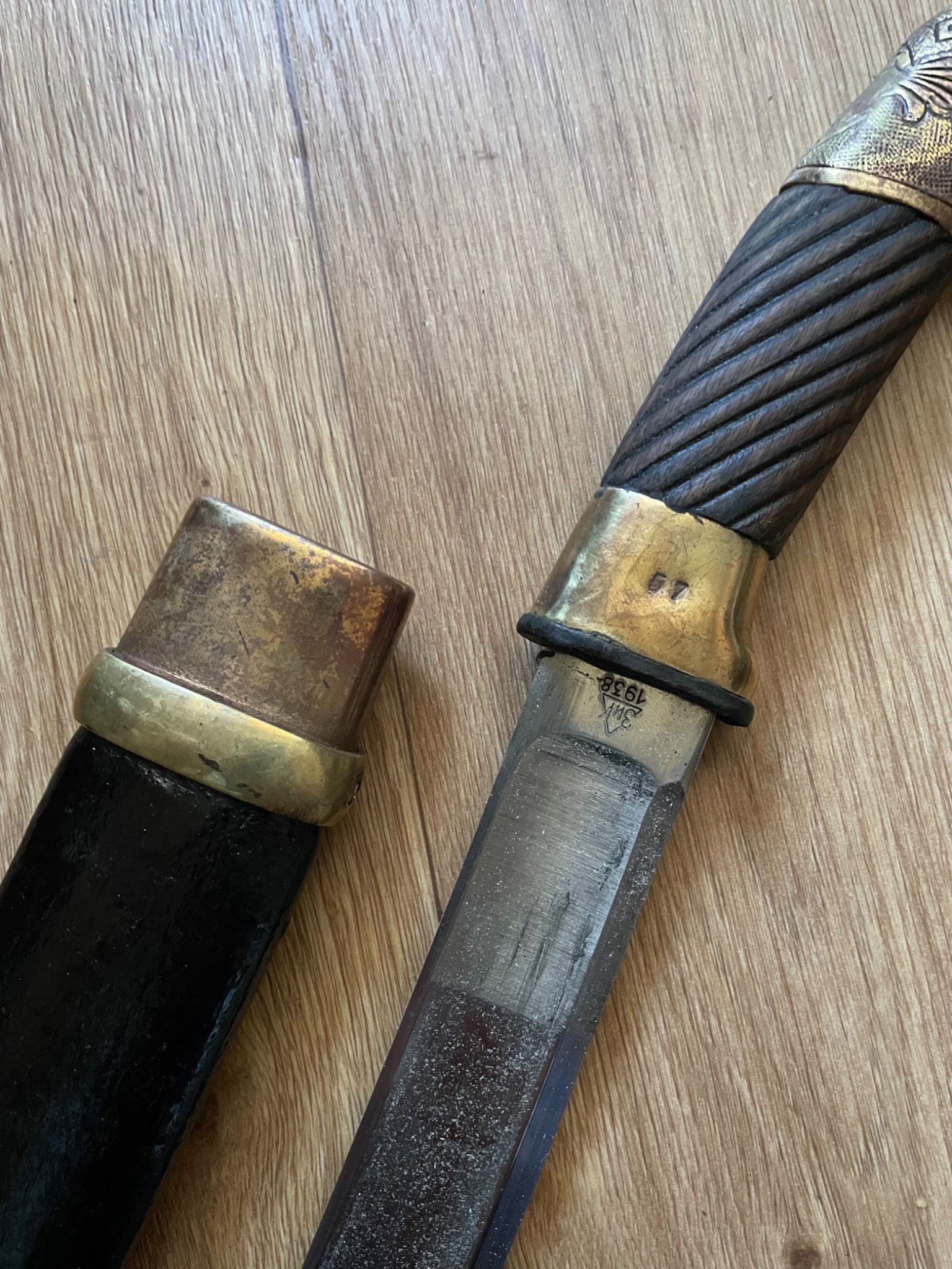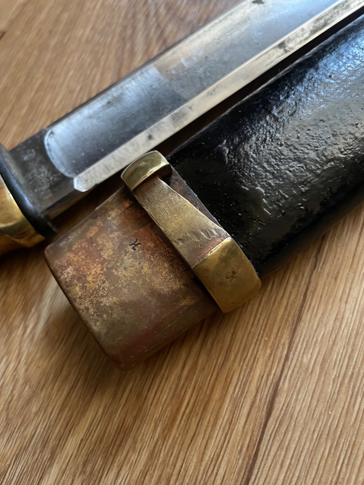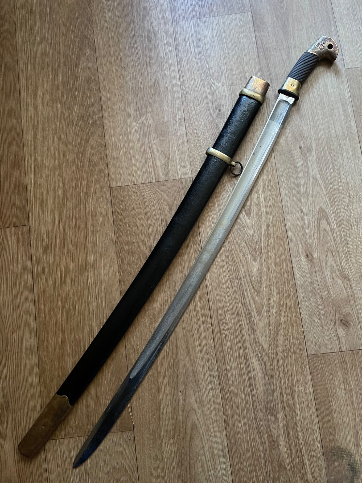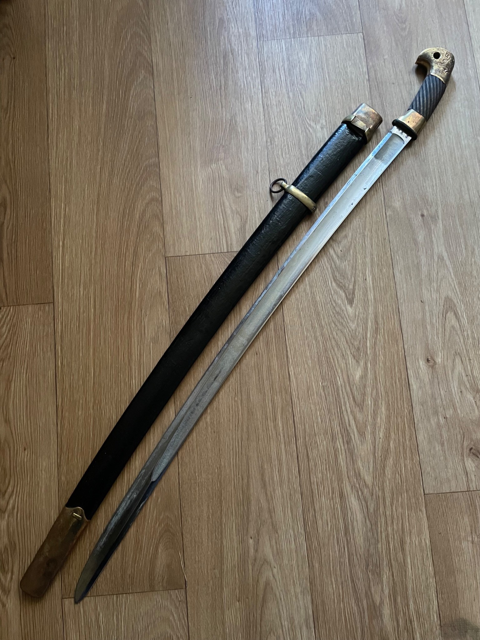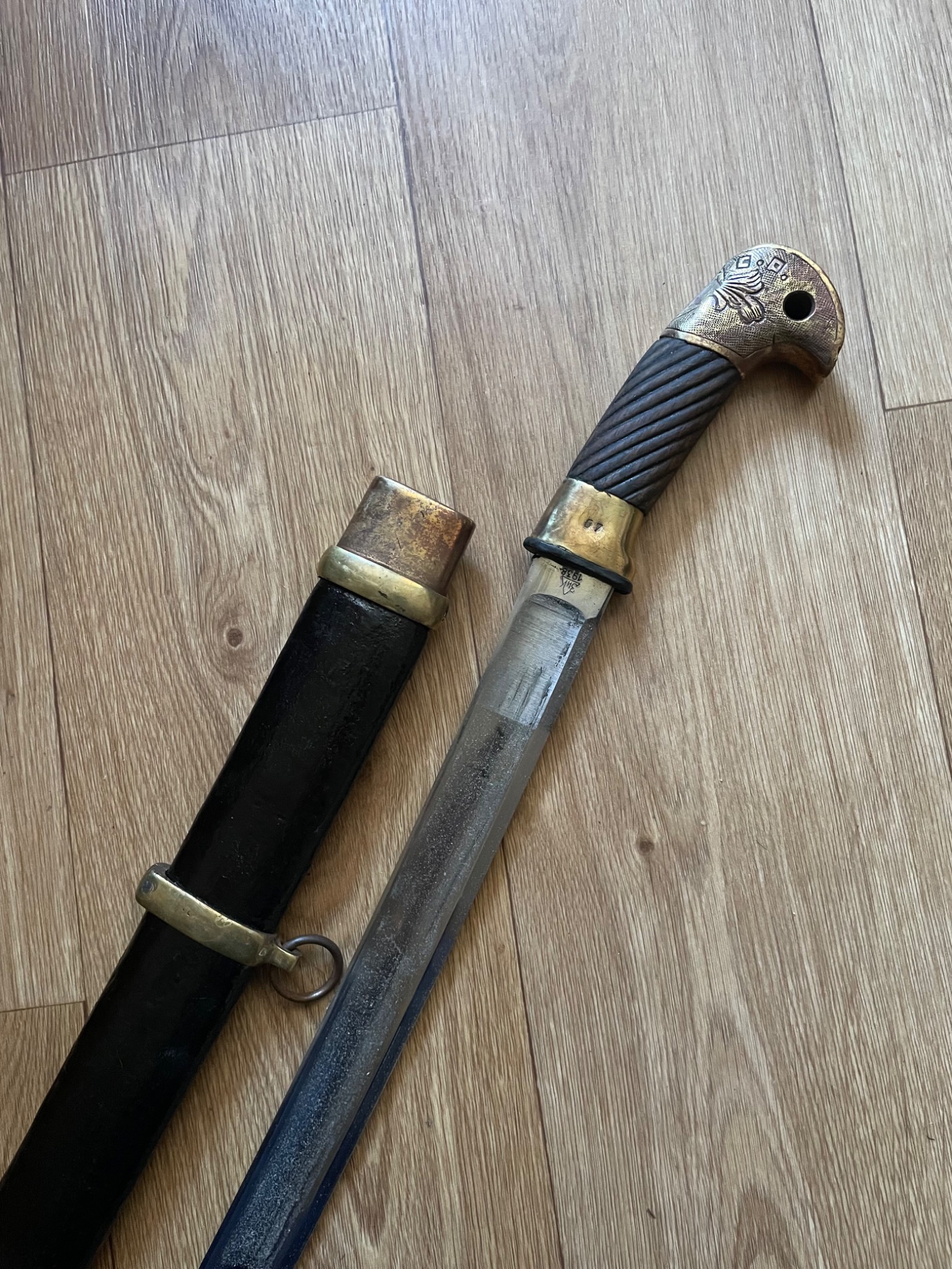 Шашка зразка 1927 року . Материал : залізо , дерево, латунь, піхви покрито тканиною. Клеймо,, Кʼʼ , дата 1938 рік, . Новороб з використанням оригінальної фурнітури.