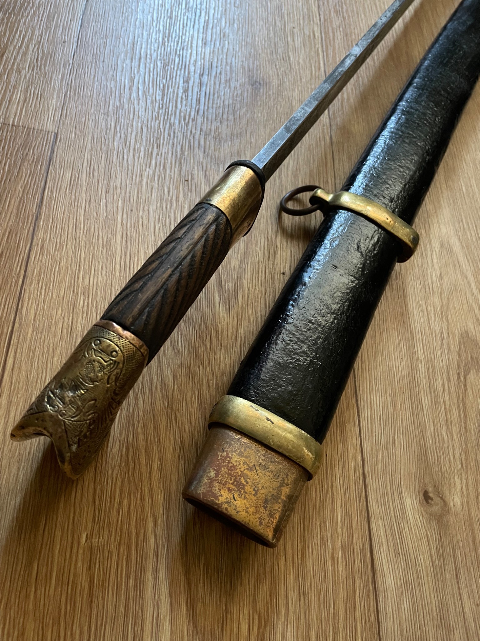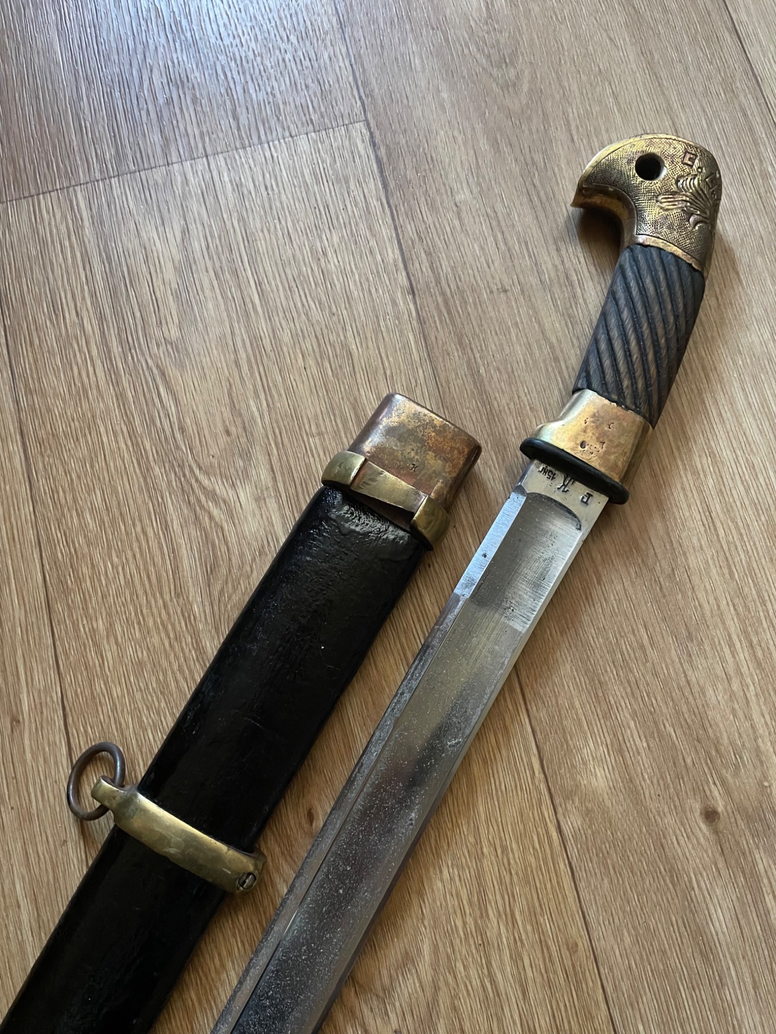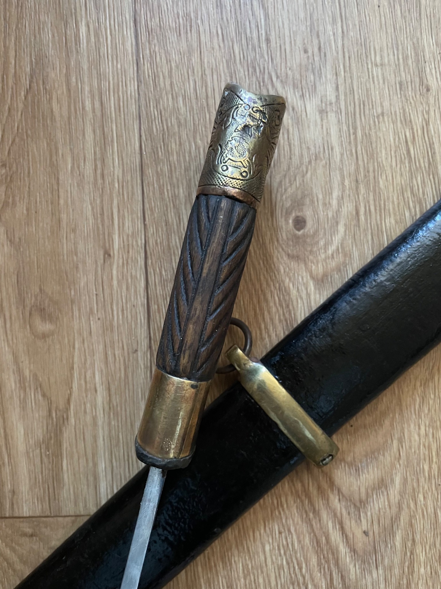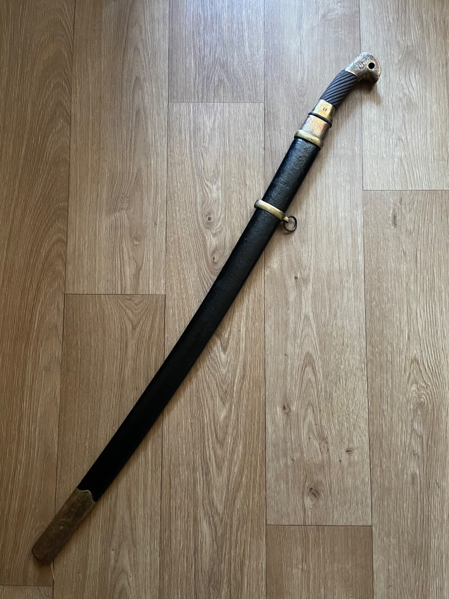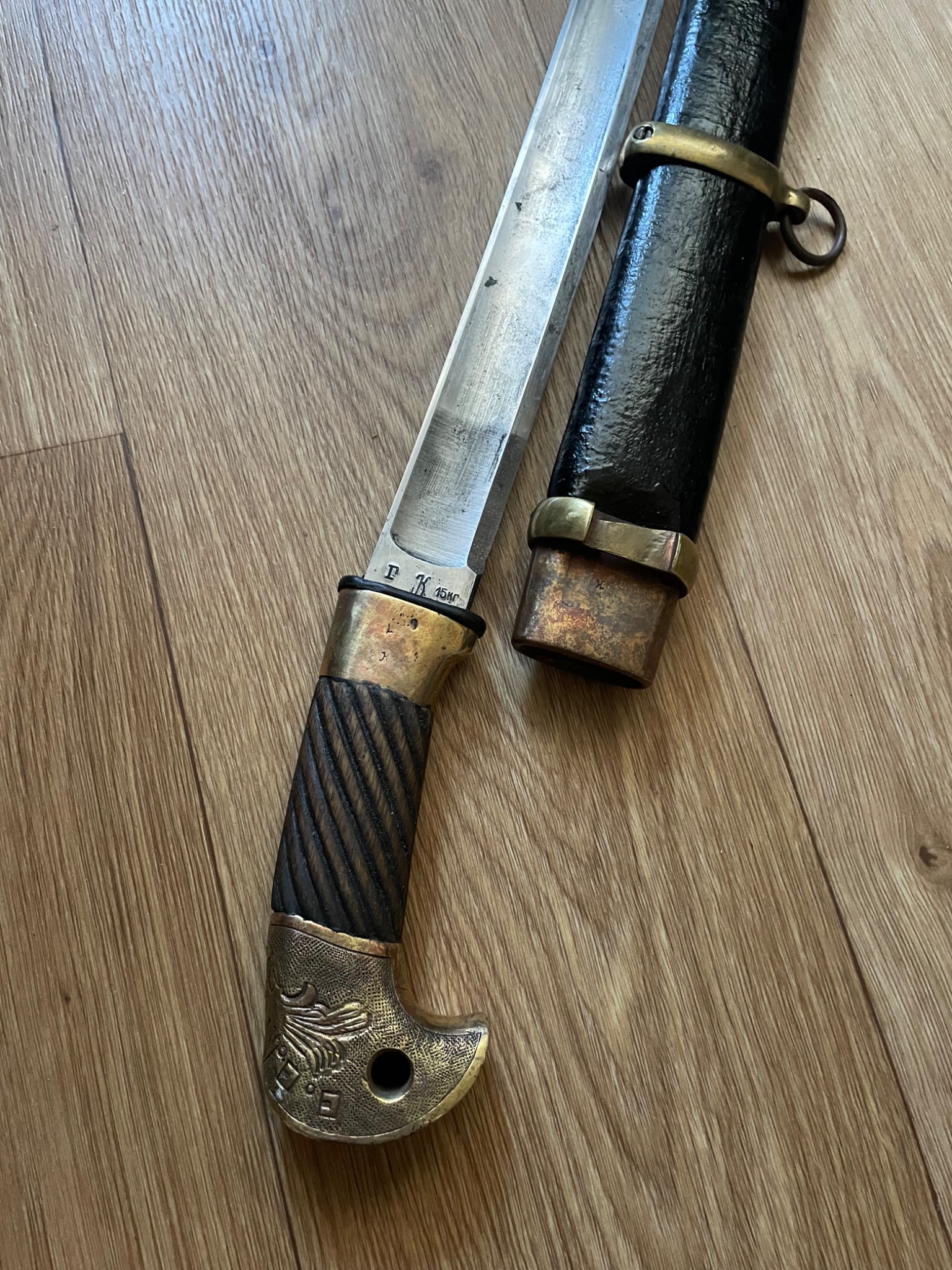 Шашка зразка 1927 року . Материал : залізо , дерево, латунь, піхви покрито тканиною. Клеймо,, Кʼʼ , дата 1938 рік, . Новороб з використанням оригінальної фурнітури.