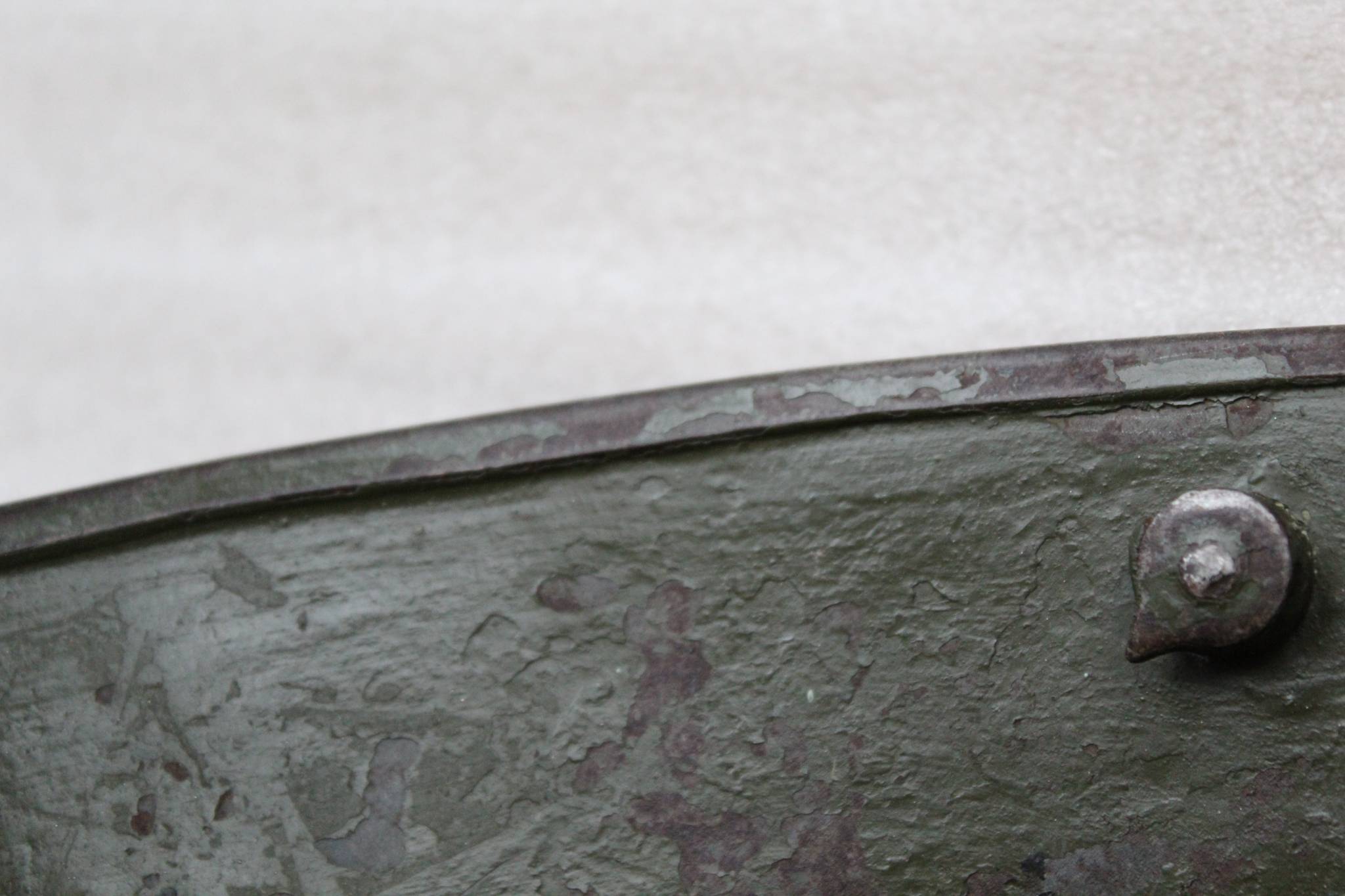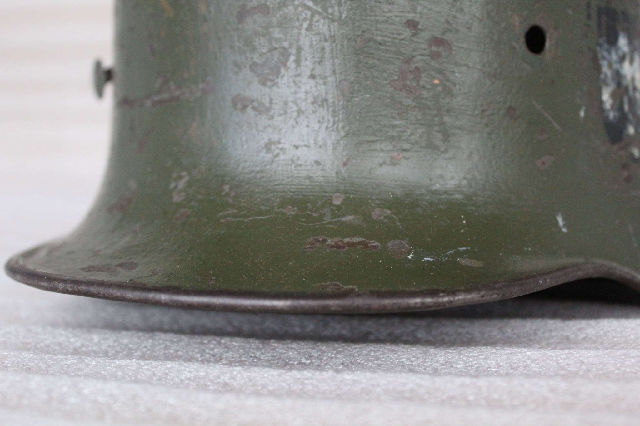 Вашему вниманию прекрасный и все более редкий образец M-1916 Stahlhelm, шлема имперской немецкой армии времён Первой мировой войны, полностью в домашнем сохране. На оболочке стоит клеймо Si66, указывающее на то, что ее изготовила компания (Eisenhuette Silesia) в городе Paruschowitz что в Пруссии/Верхняя Силезия. Данная компания выпускала шлемы всего в трёх размерах: 62, 64 и 66. Размер 66 — это хороший большой размер, который подходит для подкладок от 58 см до 60 см. Шлемы 66-го размера всегда трудно найти, поэтому они представляют большую ценность для коллекционера. Данный шлем сохранил большое количество оригинальной краски. Что характерно для “рогачей” которые использовали в вермахте он окрашен в два слоя краски: (светло-зелёный) который был нанесён ещё в ПМВ, и более поздний (тёмно-зелёный) который появился на шлеме уже в 1930-е года, и был нанесён поверх первого. Судя по двум нестандартным отверстиям вероятно шлем пытались адаптировать ещё в те времена под австро-венгерский подшлемник.