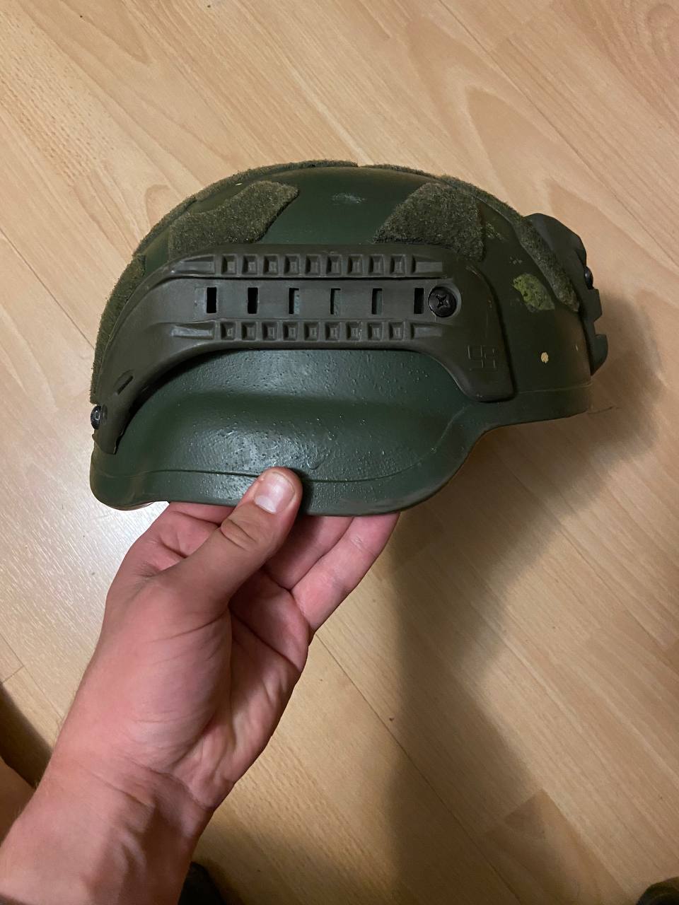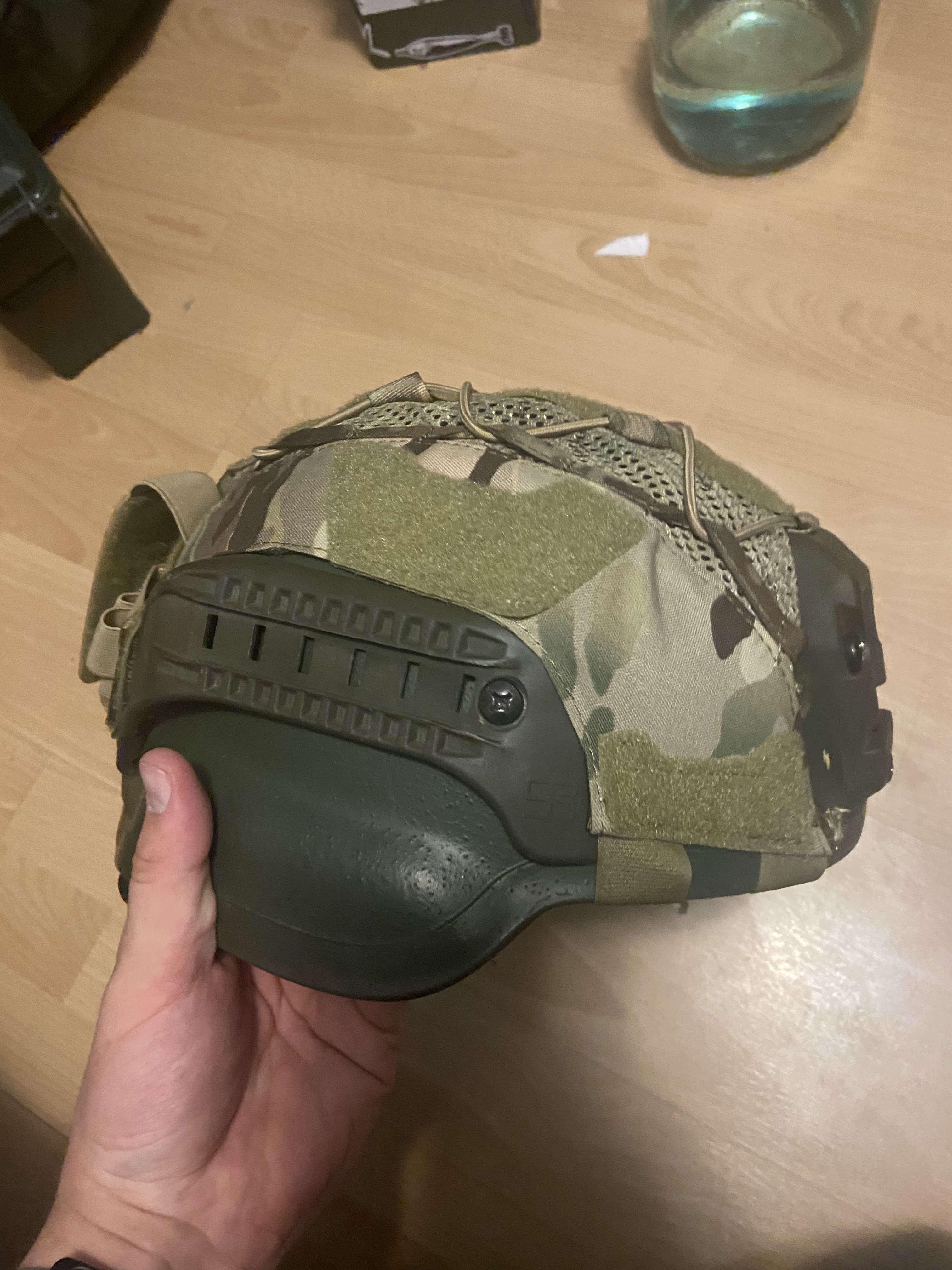 Шлем от хорватской компании, такого типа шлемы стоят на вооружении прибалтийских стран. Так называемый полуухий шлем, тоесть размер ушей уменьшен для более комфортного использования с активными наушниками. Шлем достаточно комфортный, подшлемник вентилируется, подвес поставил от fma. Очень классный шрауд, отлично становятся любые рога, в том числе титановый норотос(в шрауд опскор например его надо забивать) Есть минимальные нюансы по куполу-сколы краски. Шлем красился, на него наклеено велкро. Предпоследнее фото-как шлем выглядит на голове, последнее-на литовских кажется военных. Вообщем шлем отличный, служил мне на все 100%, продаю так как перешёл полностью на безухий.