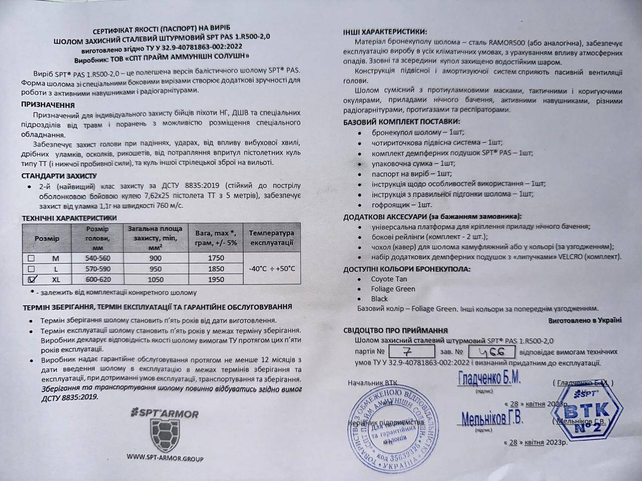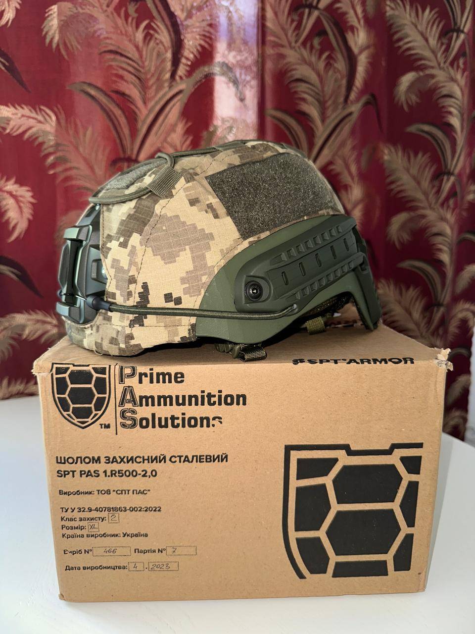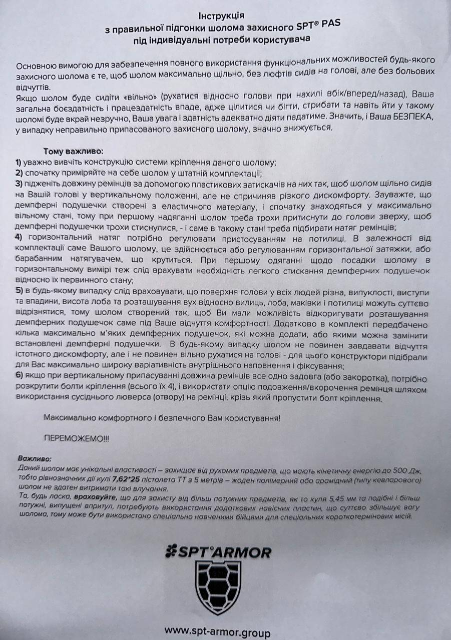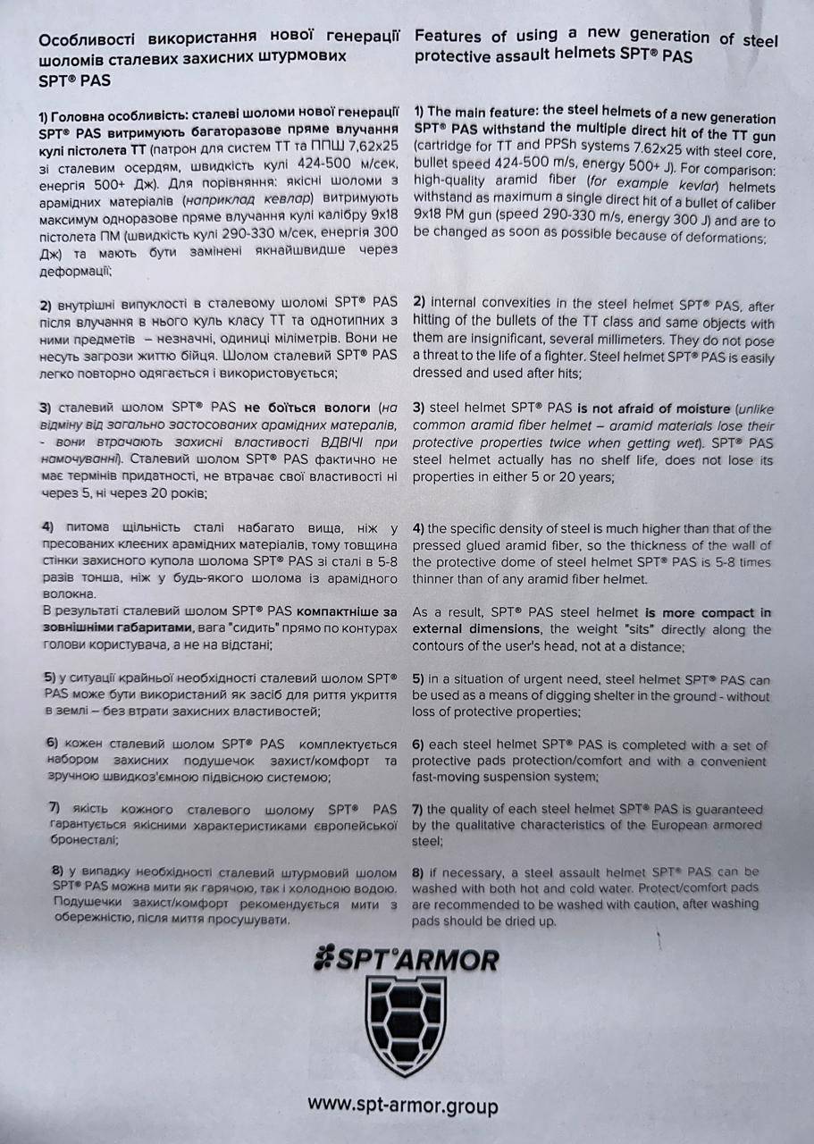 Шолом розмір XL SPT PAS 1.R500-2,0 виготовлено з унікальної шведської бронесталі товщиною 2.0 мм за новітньою технологією, є продуктом верхнього витка еволюції індивідуальних систем захисту. Є затвердженим елементом екіпірування військ ЗСУ.