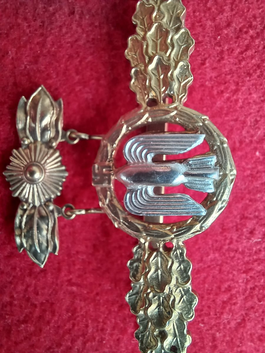 Немецкая летная шпанга Бомбардировщик с подвеской за 250 боевых вылетов.Латунь позолоченная .Клеймо А - Ассман.Накладка бомба с крыльями - серебро.Послевоенная награда заказная - ветераны заказывали в Австрии вместо утеряных своих. Посмотреть вложение 20408741