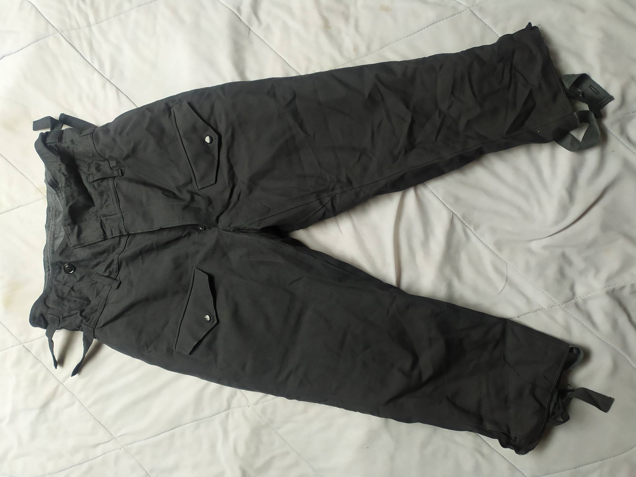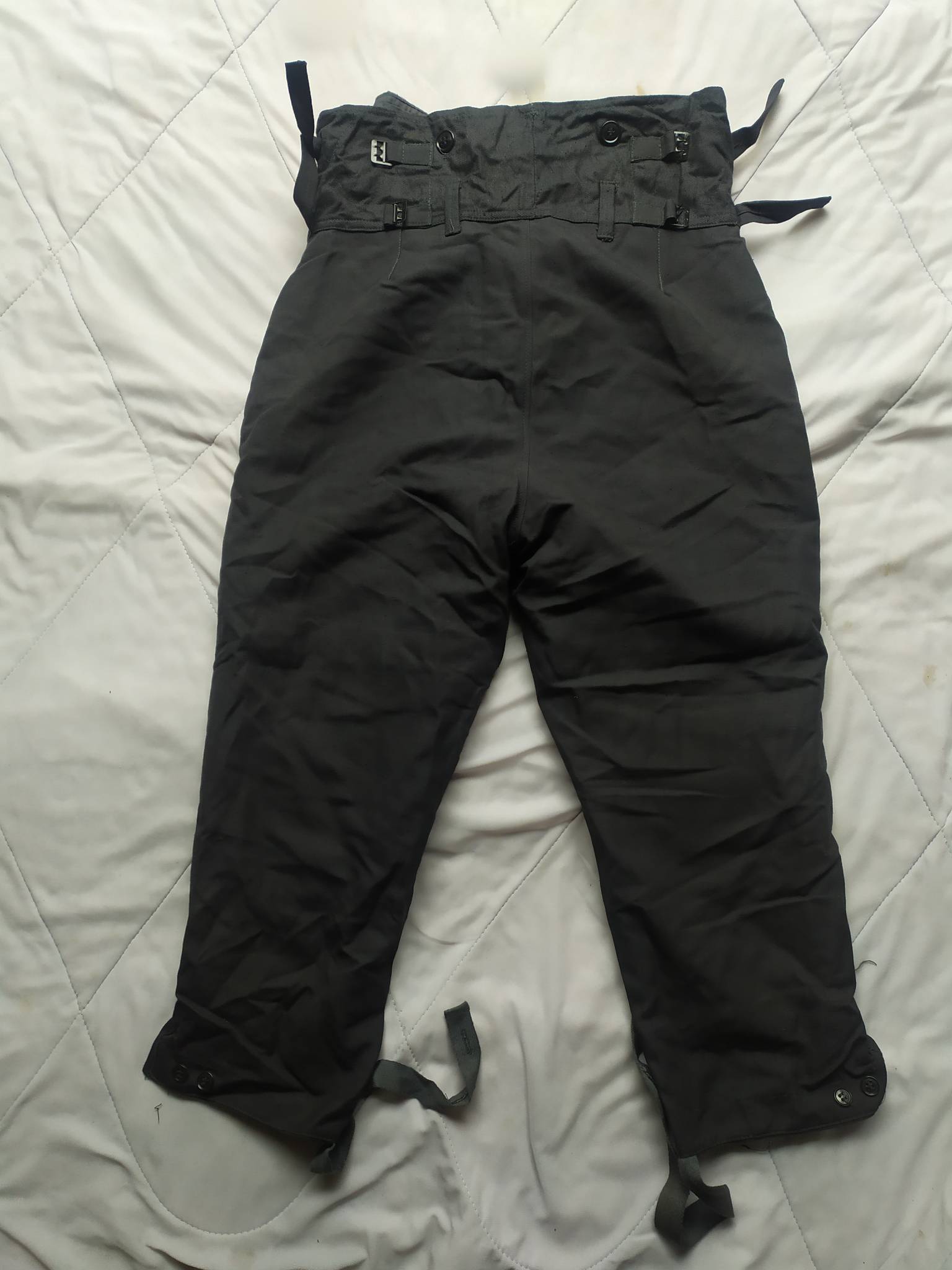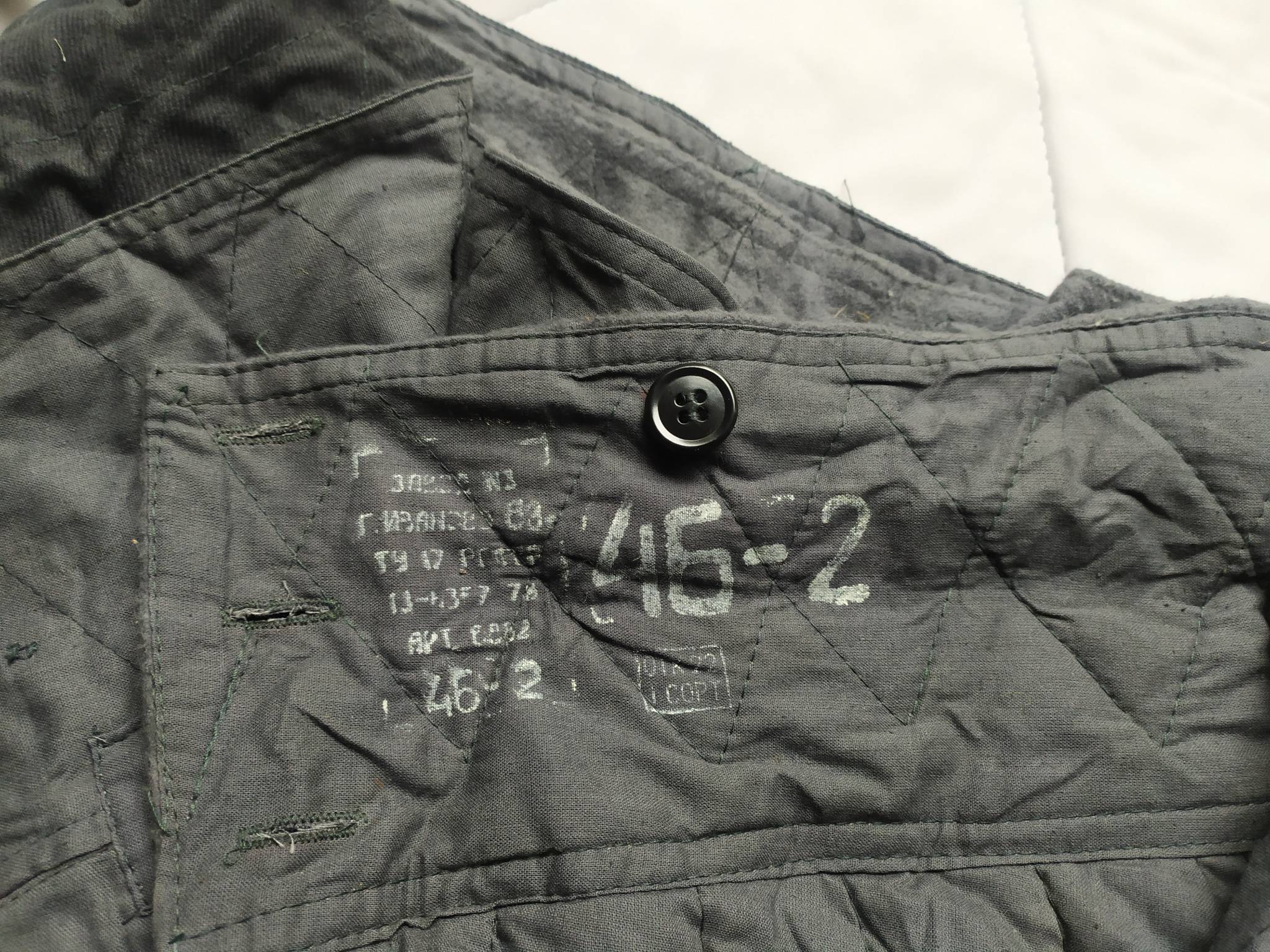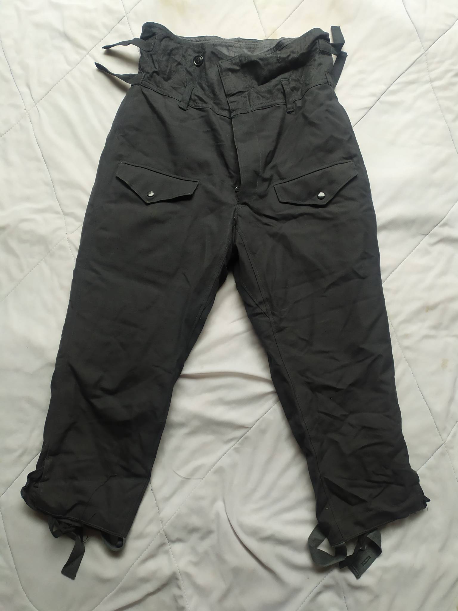 Советские армейские штаны для танкистов + зимняя подстёжка к ним. С точным определением могу ошибаться, все танковые ТОЗ которые держал в руках были из более плотной ткани. У этих штанов ткань заметно мягче. Также нет накладок на коленях и сзади. Кто знает точно – напишите в комментариях.