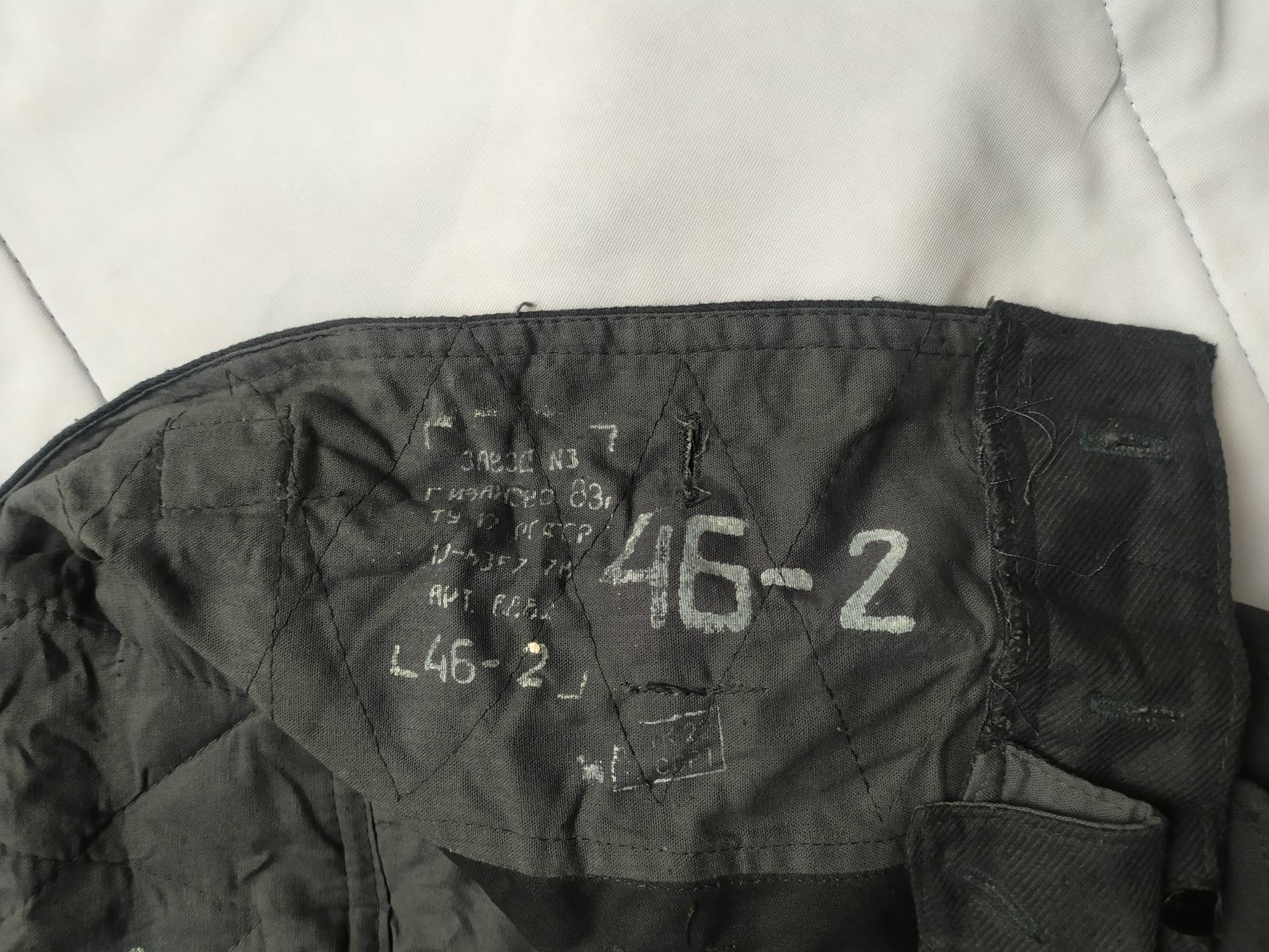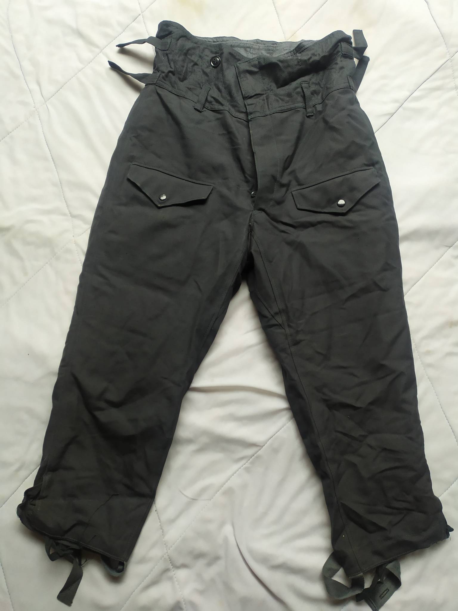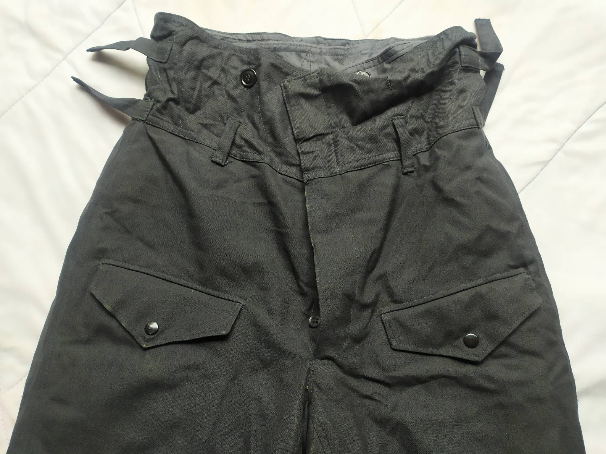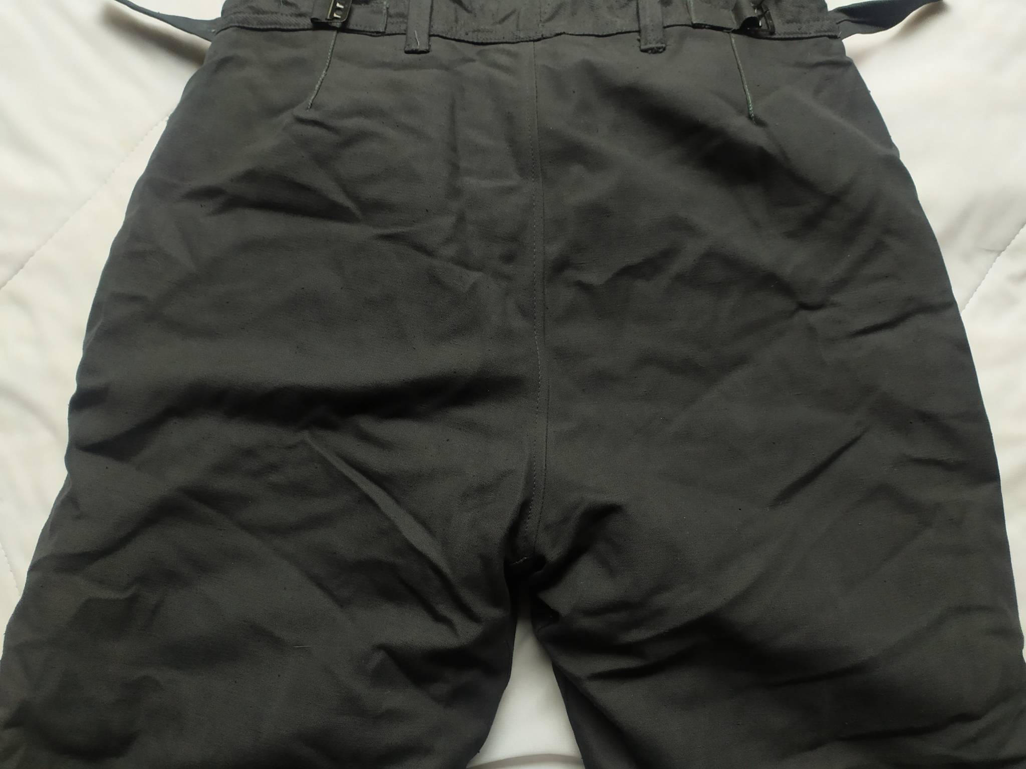 Советские армейские штаны для танкистов + зимняя подстёжка к ним. С точным определением могу ошибаться, все танковые ТОЗ которые держал в руках были из более плотной ткани. У этих штанов ткань заметно мягче. Также нет накладок на коленях и сзади. Кто знает точно – напишите в комментариях.