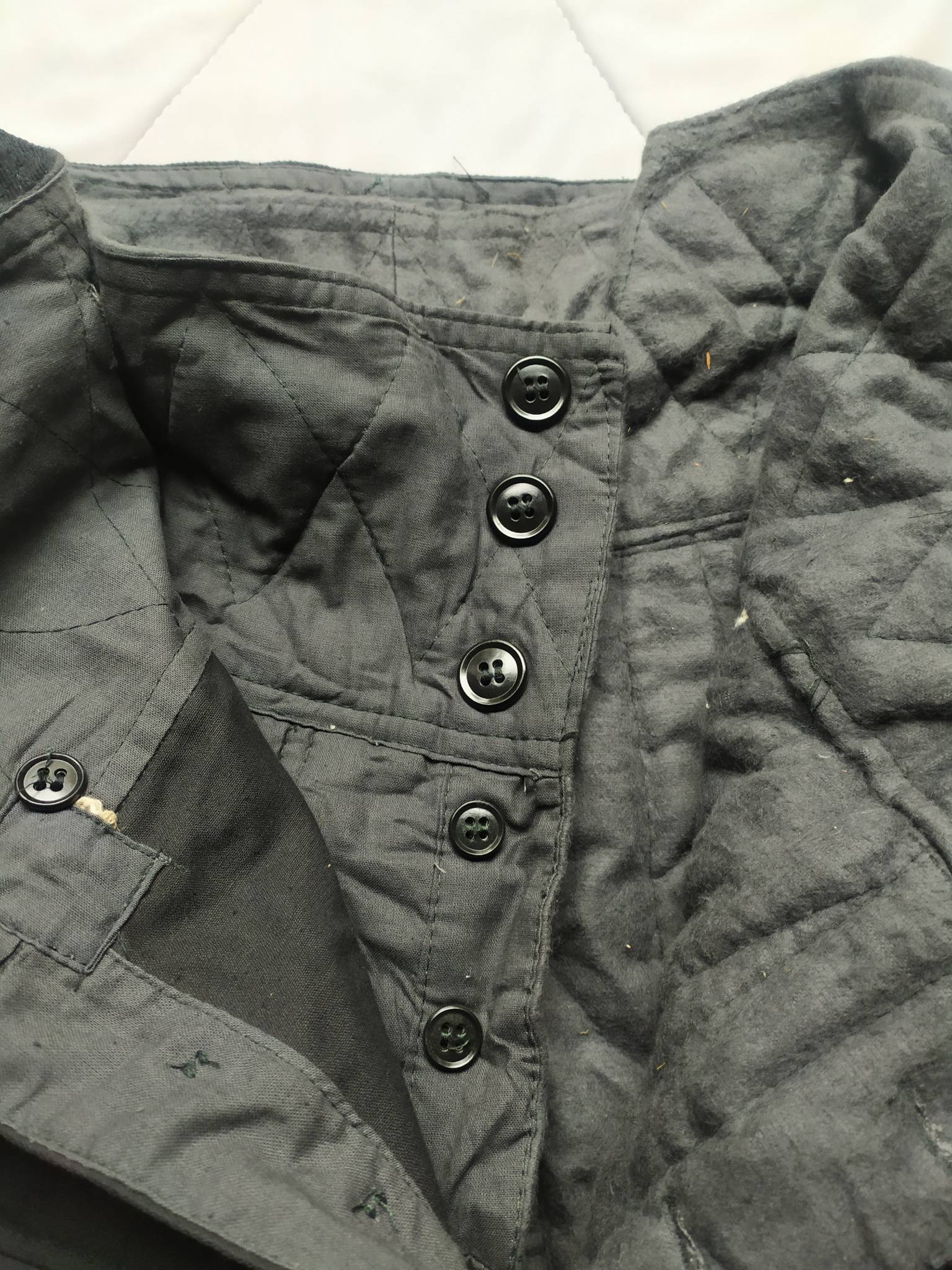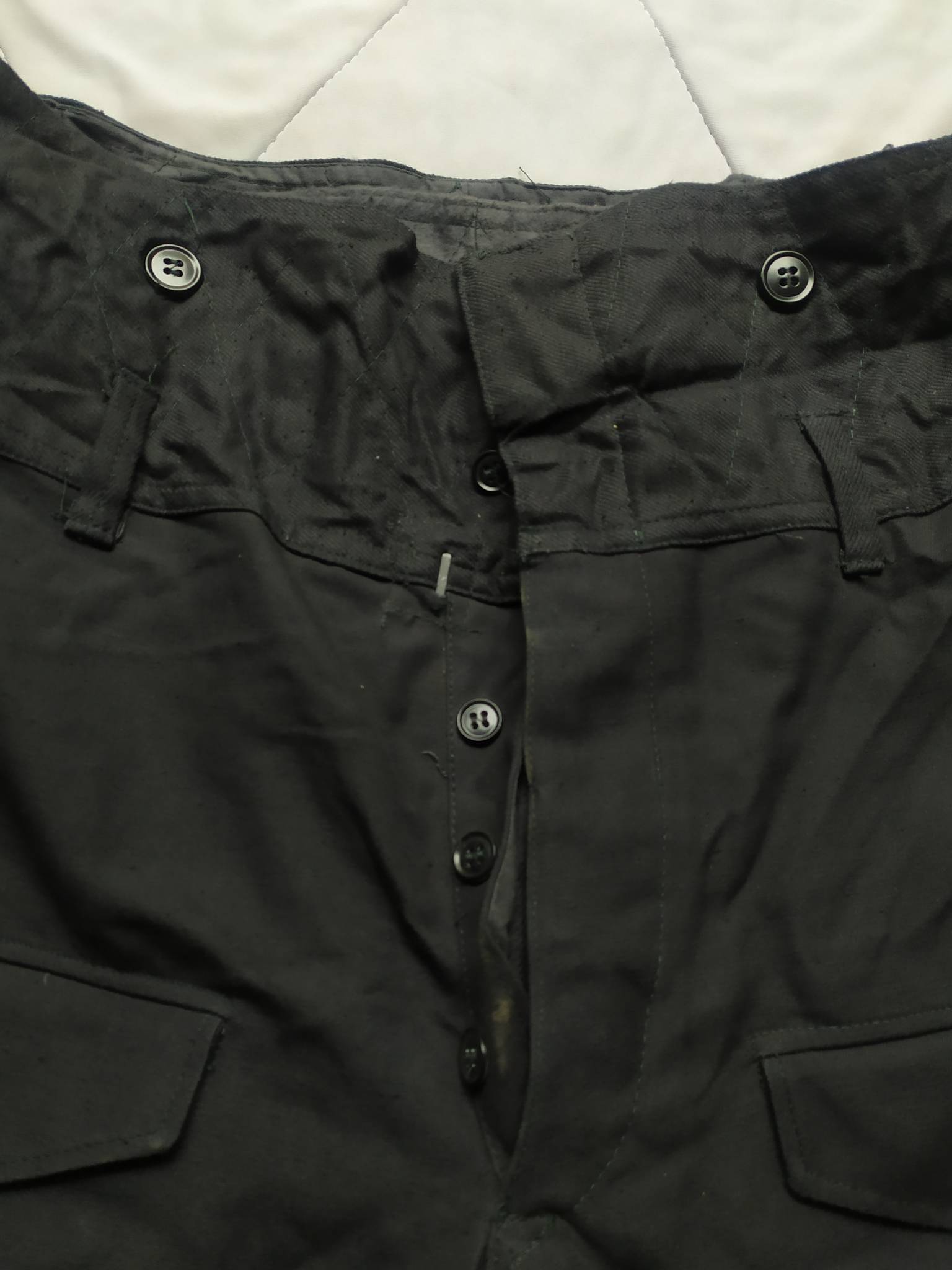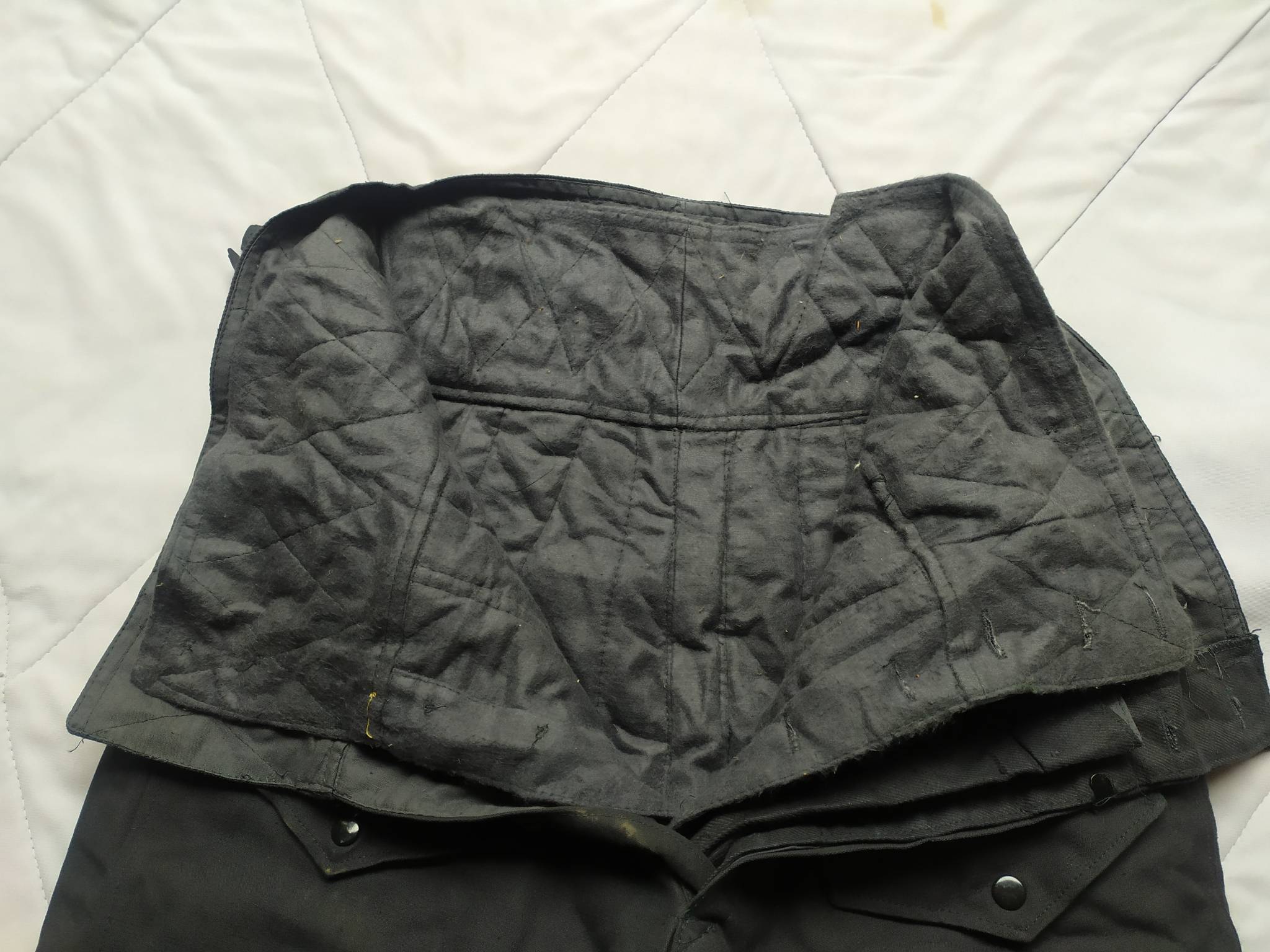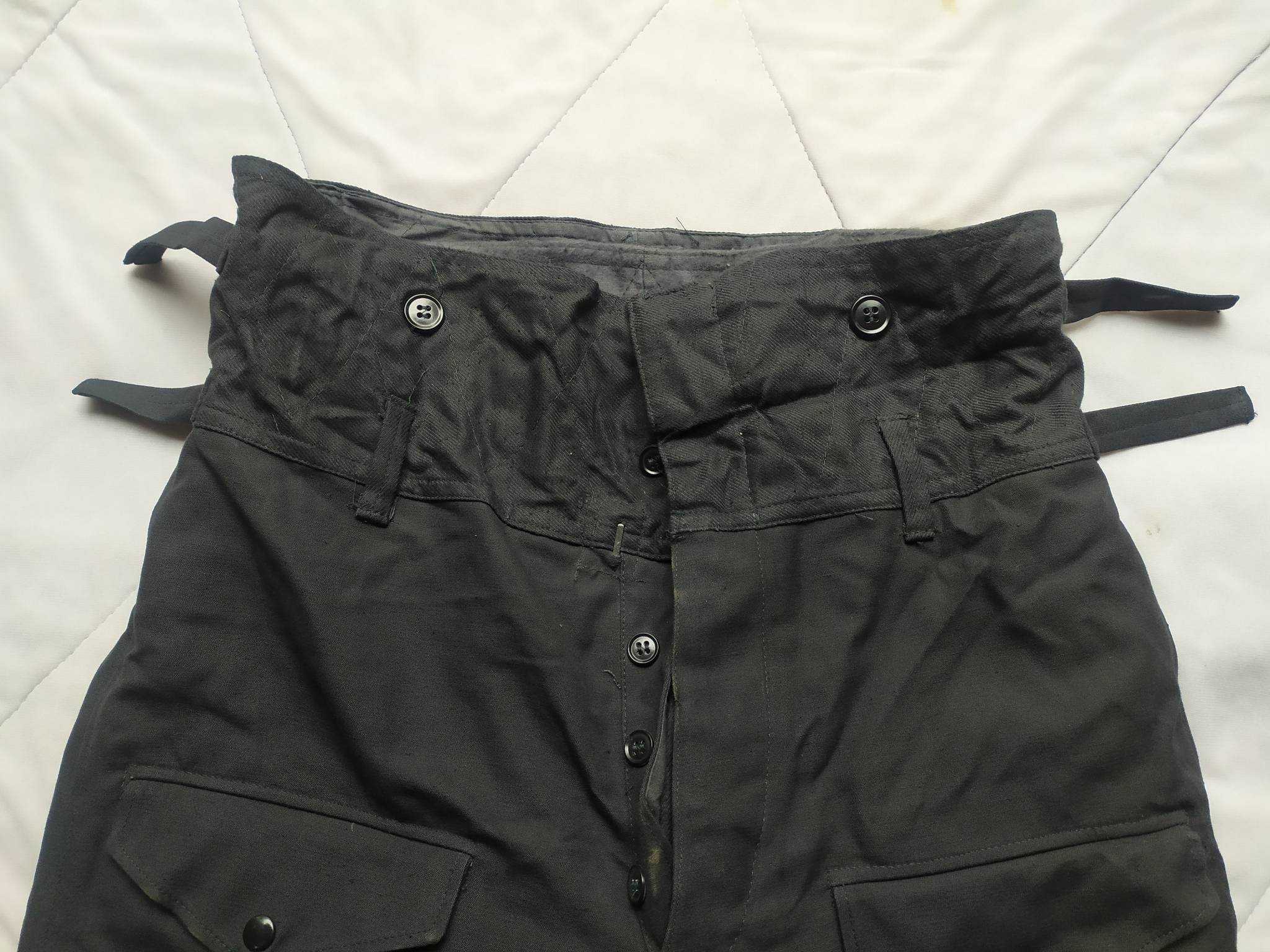 Советские армейские штаны для танкистов + зимняя подстёжка к ним. С точным определением могу ошибаться, все танковые ТОЗ которые держал в руках были из более плотной ткани. У этих штанов ткань заметно мягче. Также нет накладок на коленях и сзади. Кто знает точно – напишите в комментариях.
