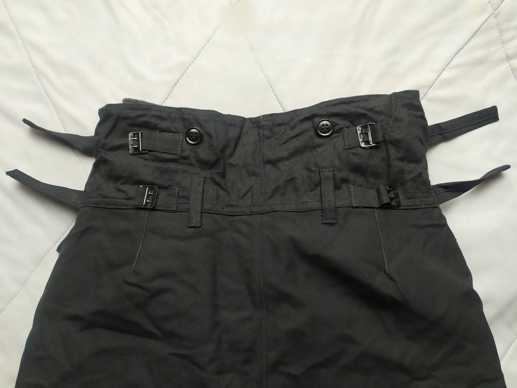 Штаны застёгиваются на пуговицы + крючок; подстёжка – на пуговицы. Два внешних набедренных кармана. Пояс очень высокий, сзади регулируется четырьмя утяжками с фиксаторами. Большие пуговицы на поясе – это для крепления подстёжки. Утеплитель-подстёжка выполнена из войлочной ткани + тканевые манжеты штанин. У самих штанов манжеты разрезные, по две пуговицы на каждом + широкие завязки. В целом, даже с подстёжкой, штаны не такие тяжёлые как ТОЗ. Цвет – чёрный, более «простой» и светлый чем вышел на фото (фото затемняет).