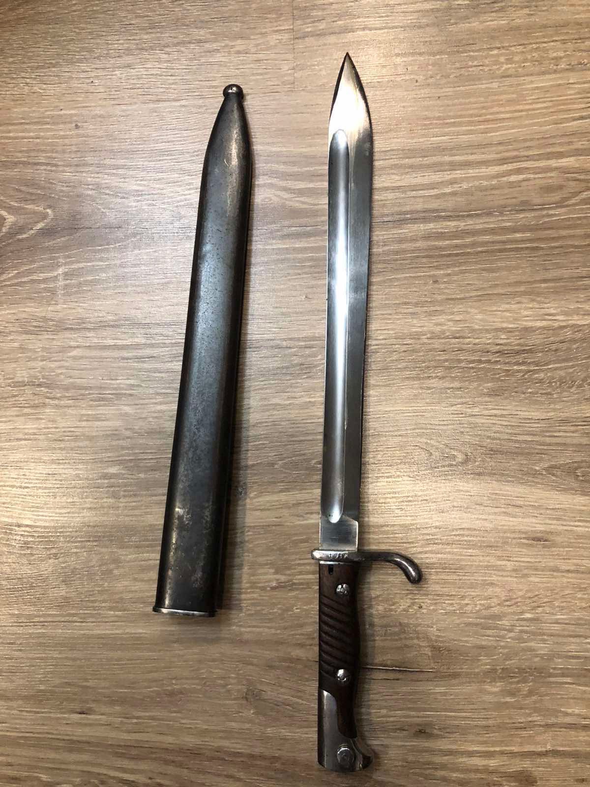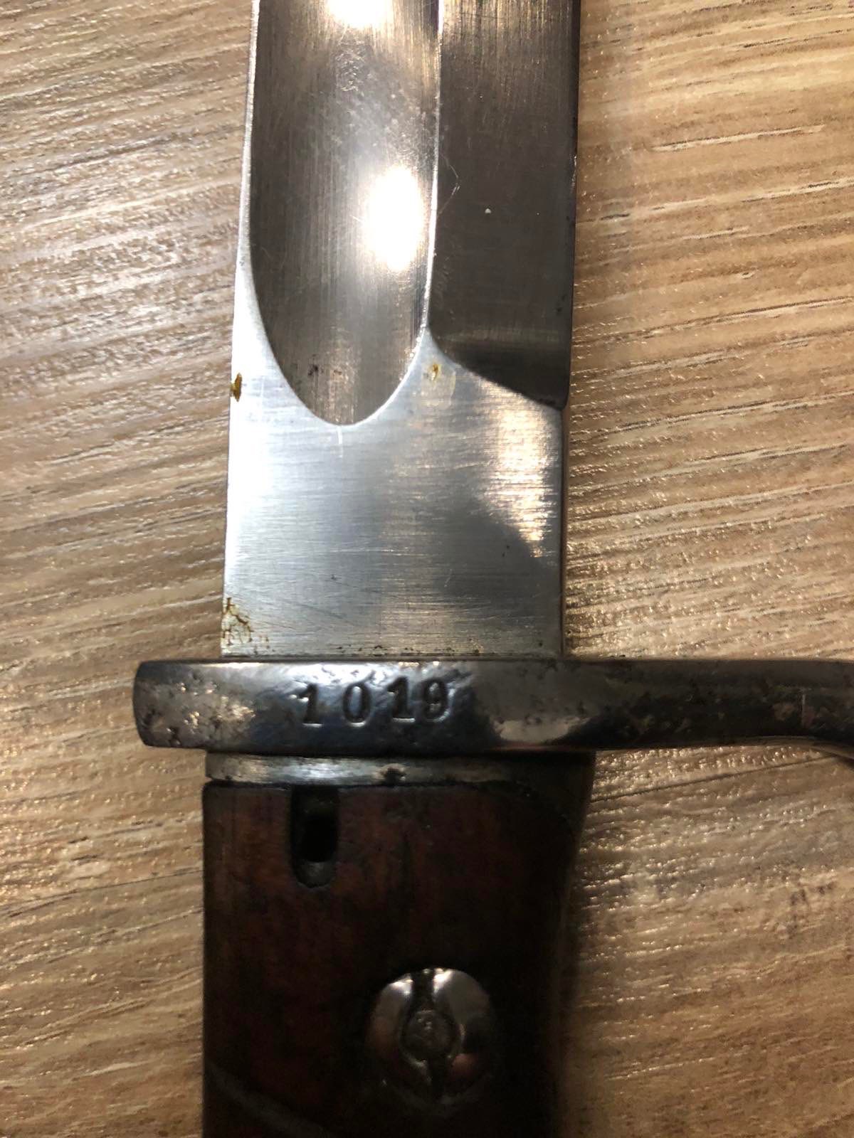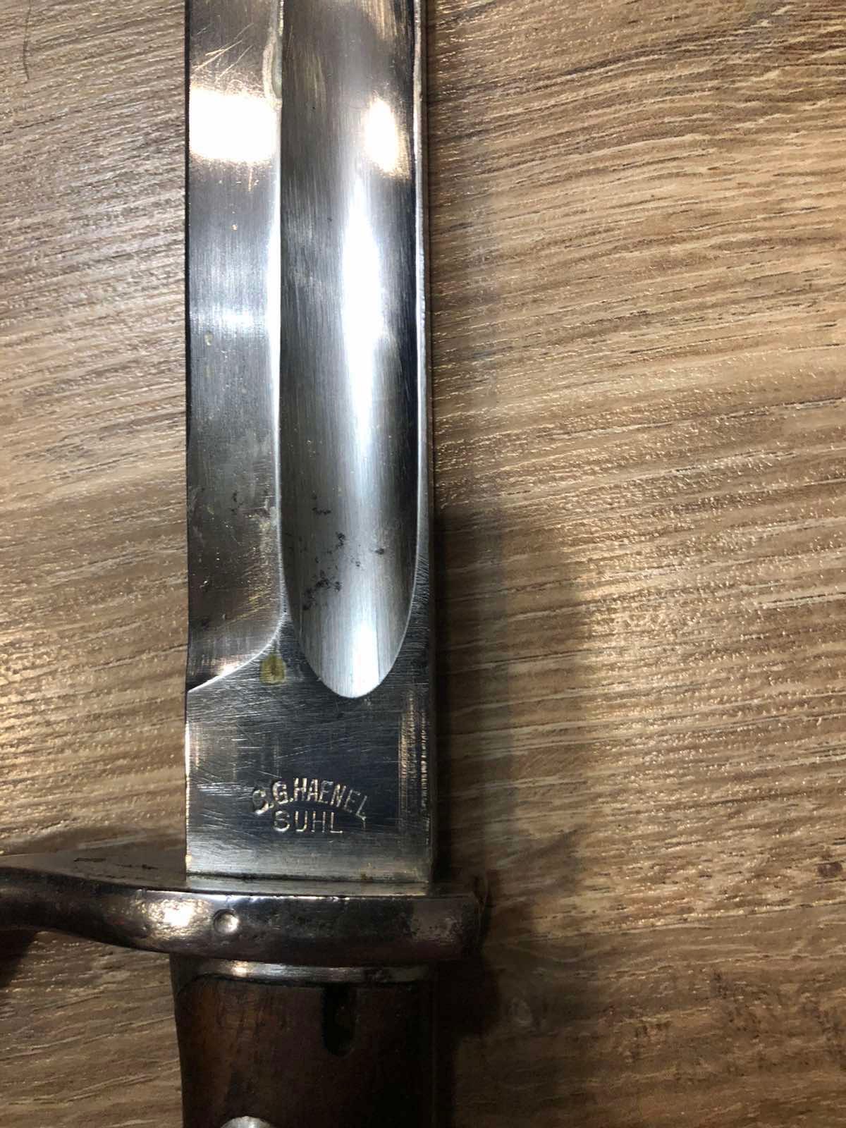 Саперный штык к винтовке Маузер образца 1898/1905 года. Так называемый Бучер. Сделан в городе Зуль в 1916 году. Штык аккуратно заточен, скорее всего в те годы. Накладки оригинал