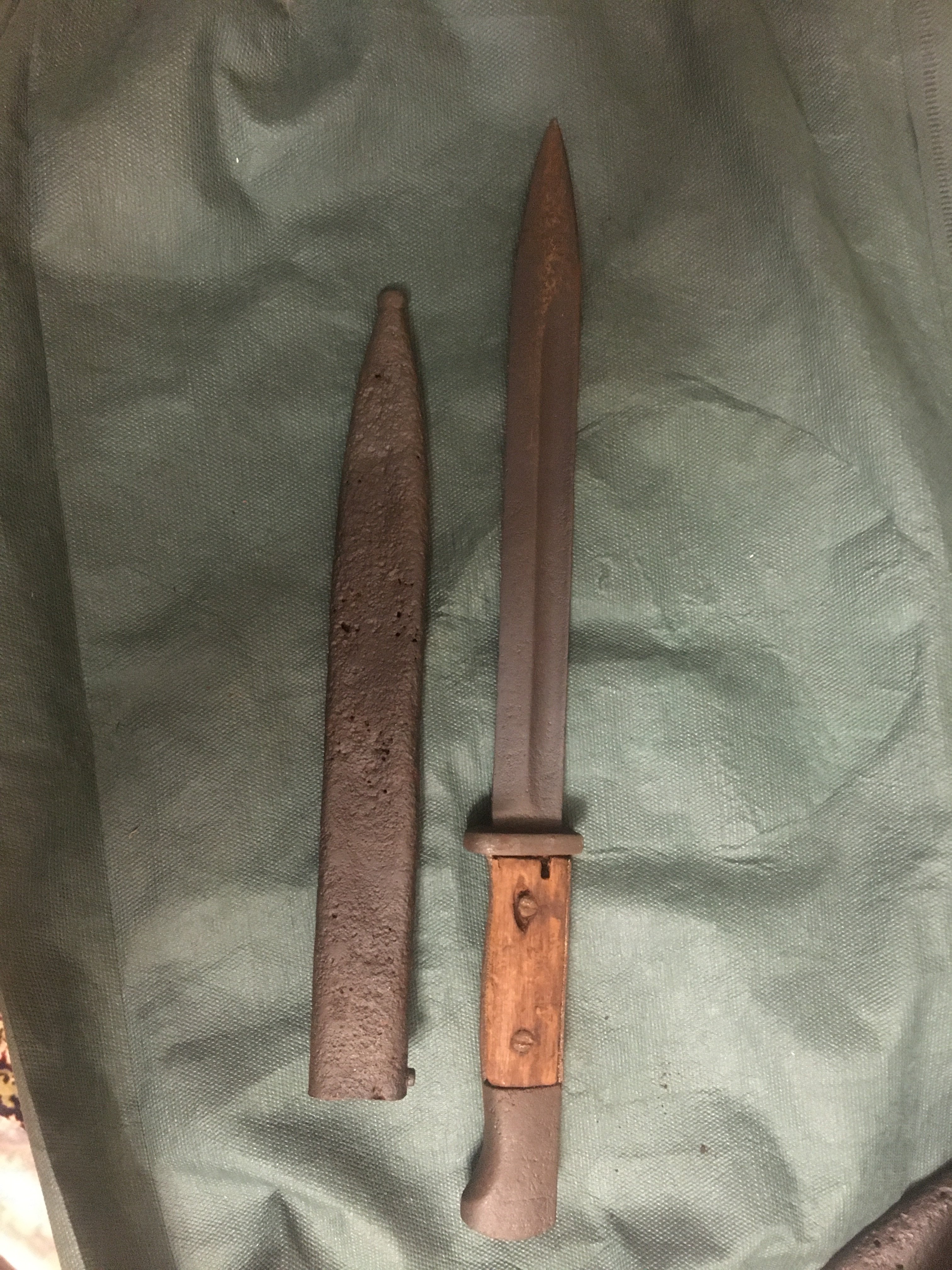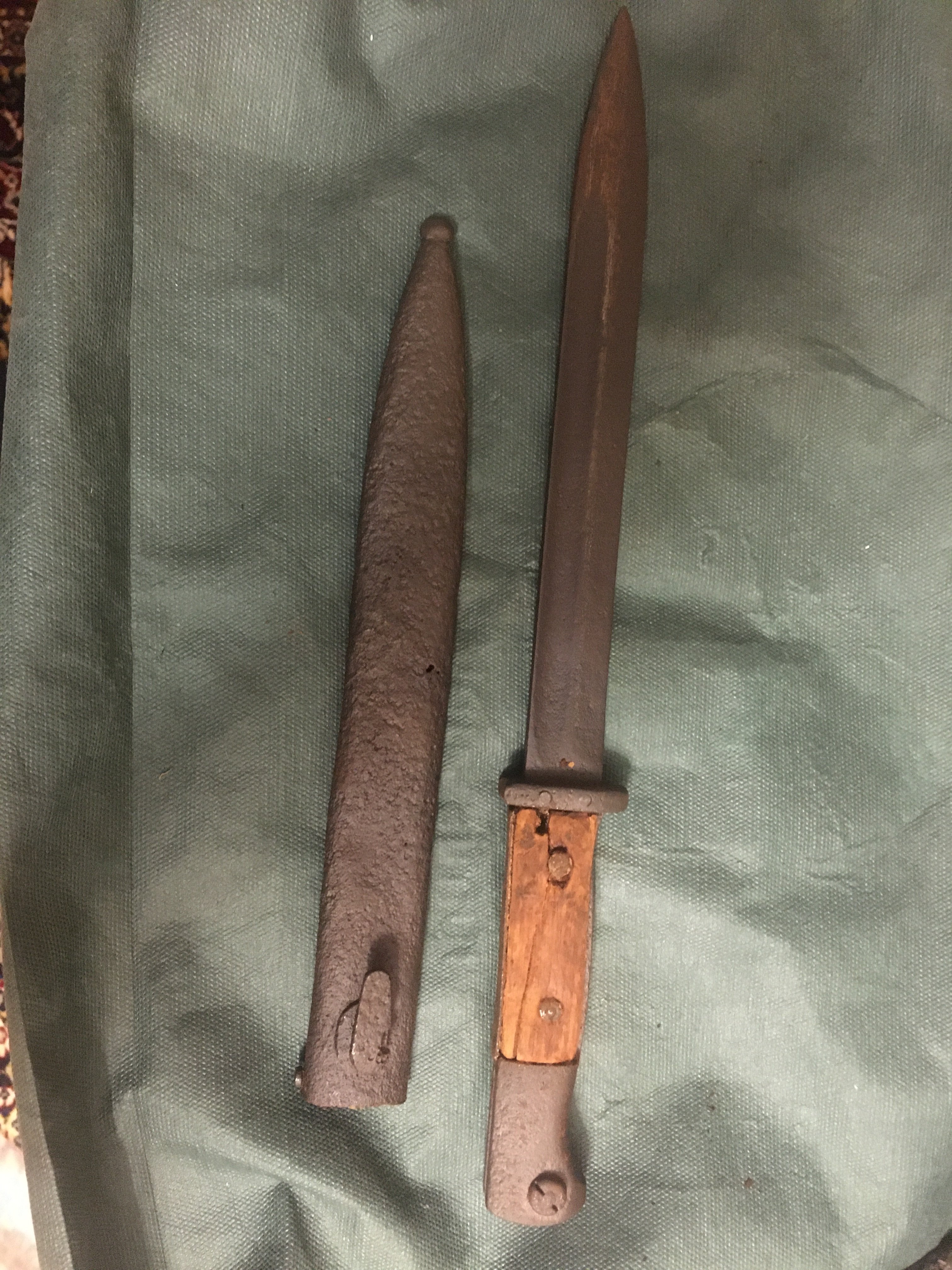 Штык К-98 Маузер.Ножны крепкие но с дырочками,клейма не просматривается.Кнопка не работает.Остальное по фото
