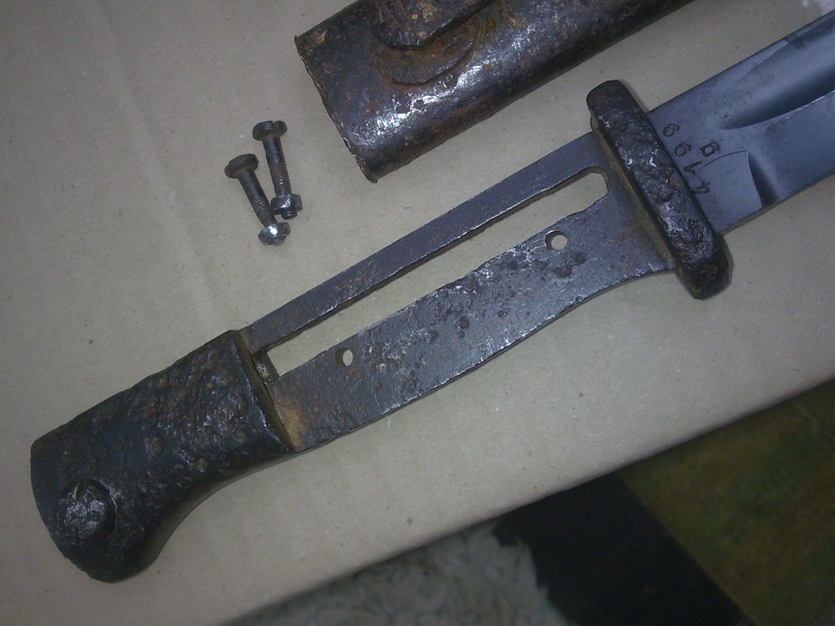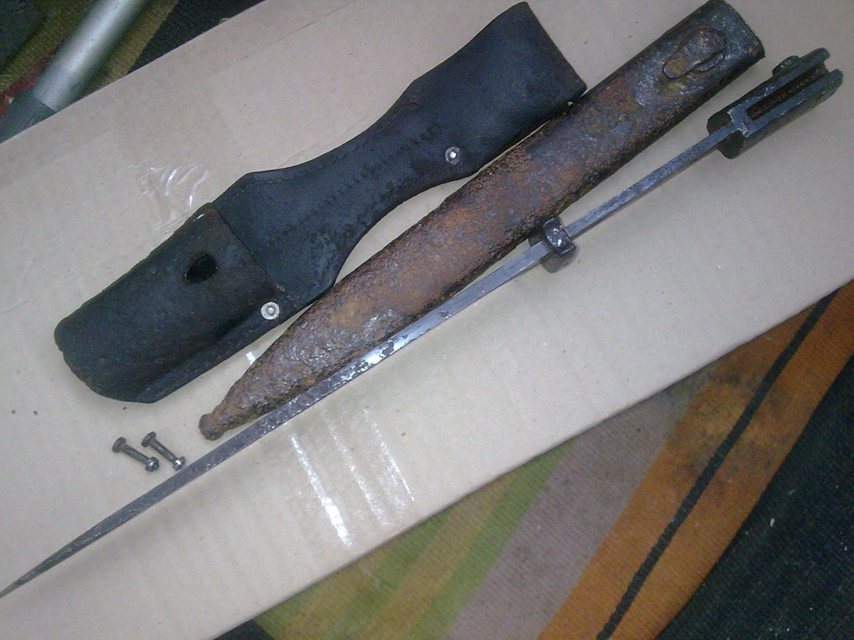 штык в родном воронении ,не точеный .Был найден в ножнах(парник),радиатор и накладки не сохранились но винты рабочие.в ножнах пружины клин хорошо держат но присутствуют свищи.фиксатор рабочий,жаба гнется примерно на 45 градусов,