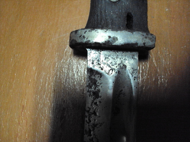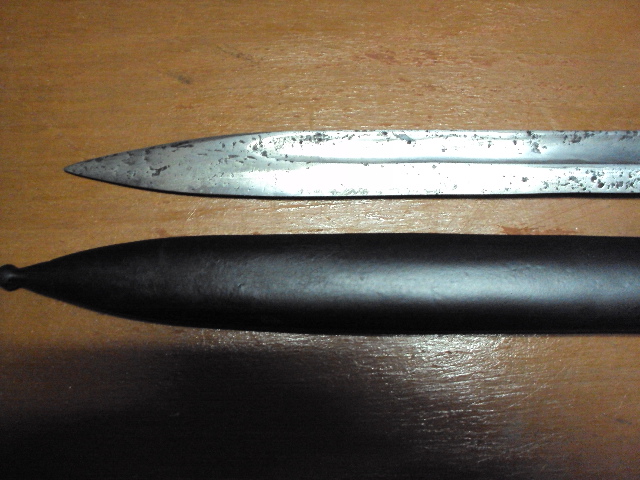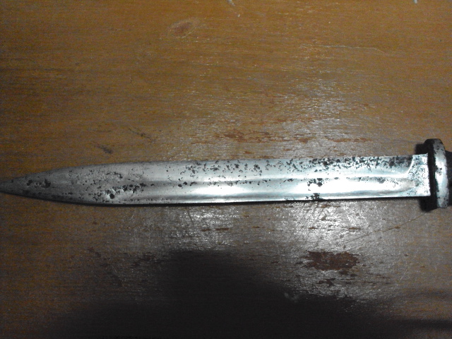 Состояние на фото, неточен но отшлифован, есть раковины, кнопка работает, ножны восстановлены, пружины держат отлично.