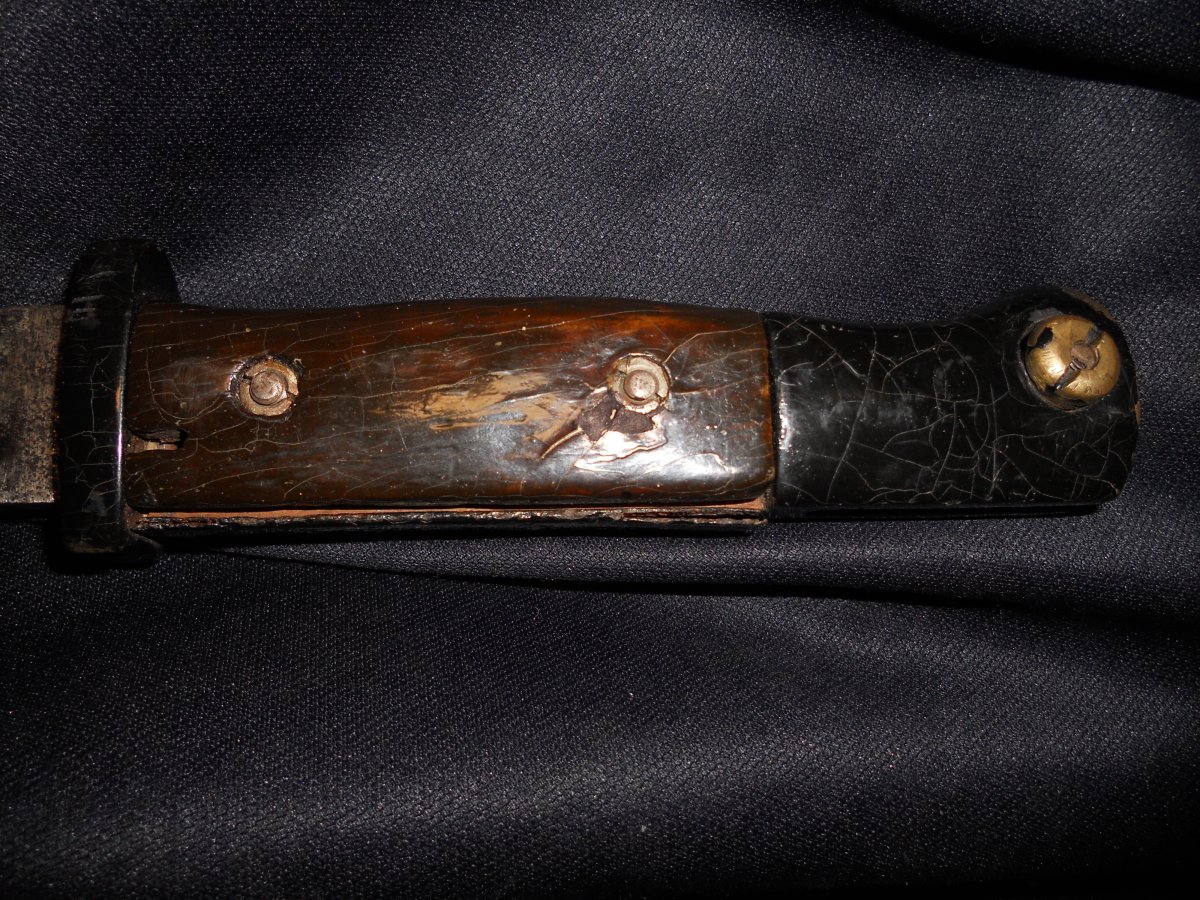 Предыдущий хозяин вымазал его в бесцветный лак, который от времени уже растрескался. Дерево, очень подозреваю (но на 100% не уверен) - родное. По тому что болты зачем то откручивались ? А просвечивается через лак подгнившая древесина. Я предполагаю, если человек поленился почистить ножны от ржи, и по раковинках, хотя и мелких - задул с балончика, не будет заморачиваться с древесиной. Кнопка работает. Пелюстки в ножнах клин держат туго.