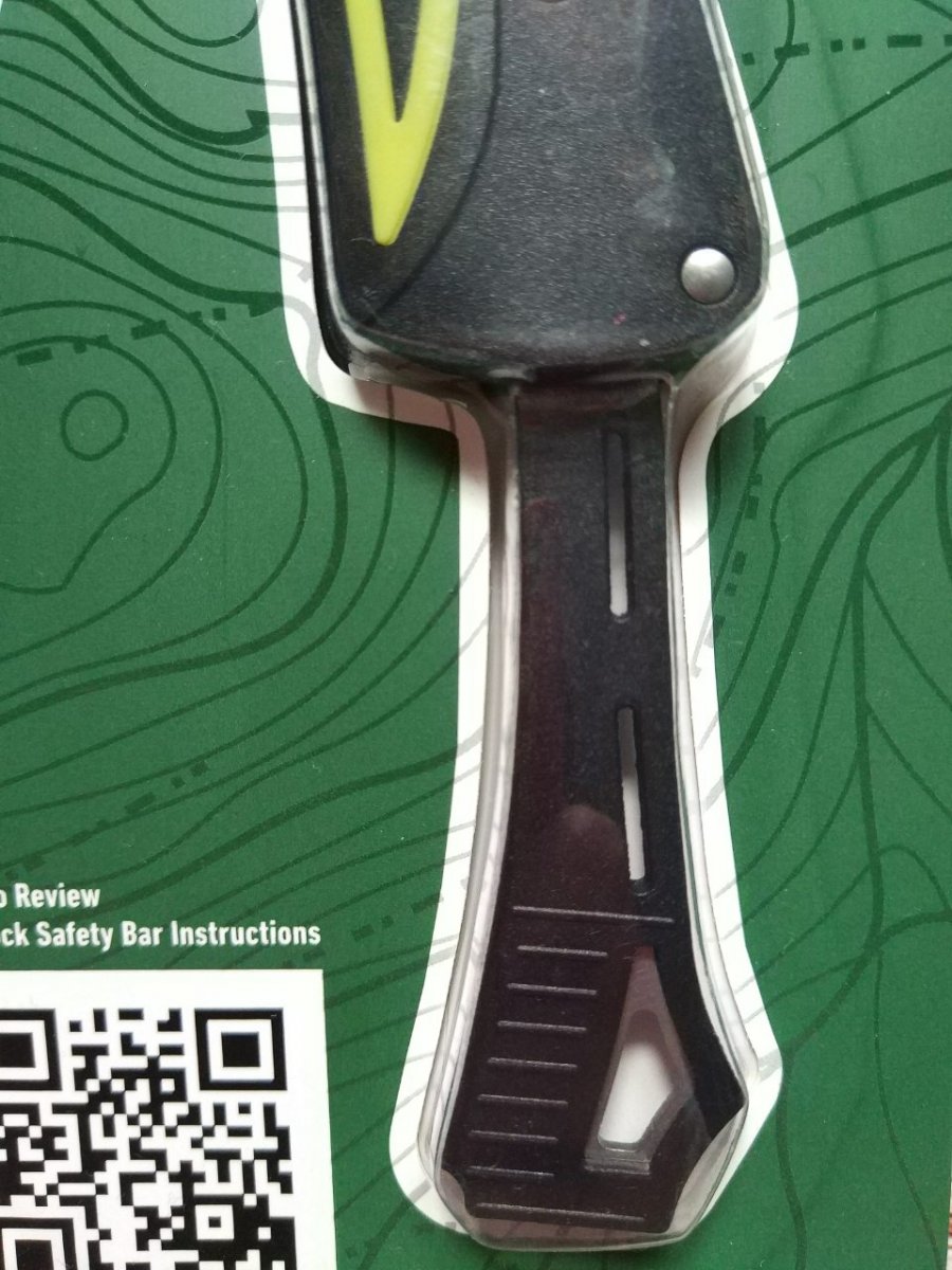Двуцветная рукоять выполнена из материала GRN (нейлона армированного стекловолокном) с пластиковой вставкой. Так же нож комплектуется черными нейлоновыми ножнами.