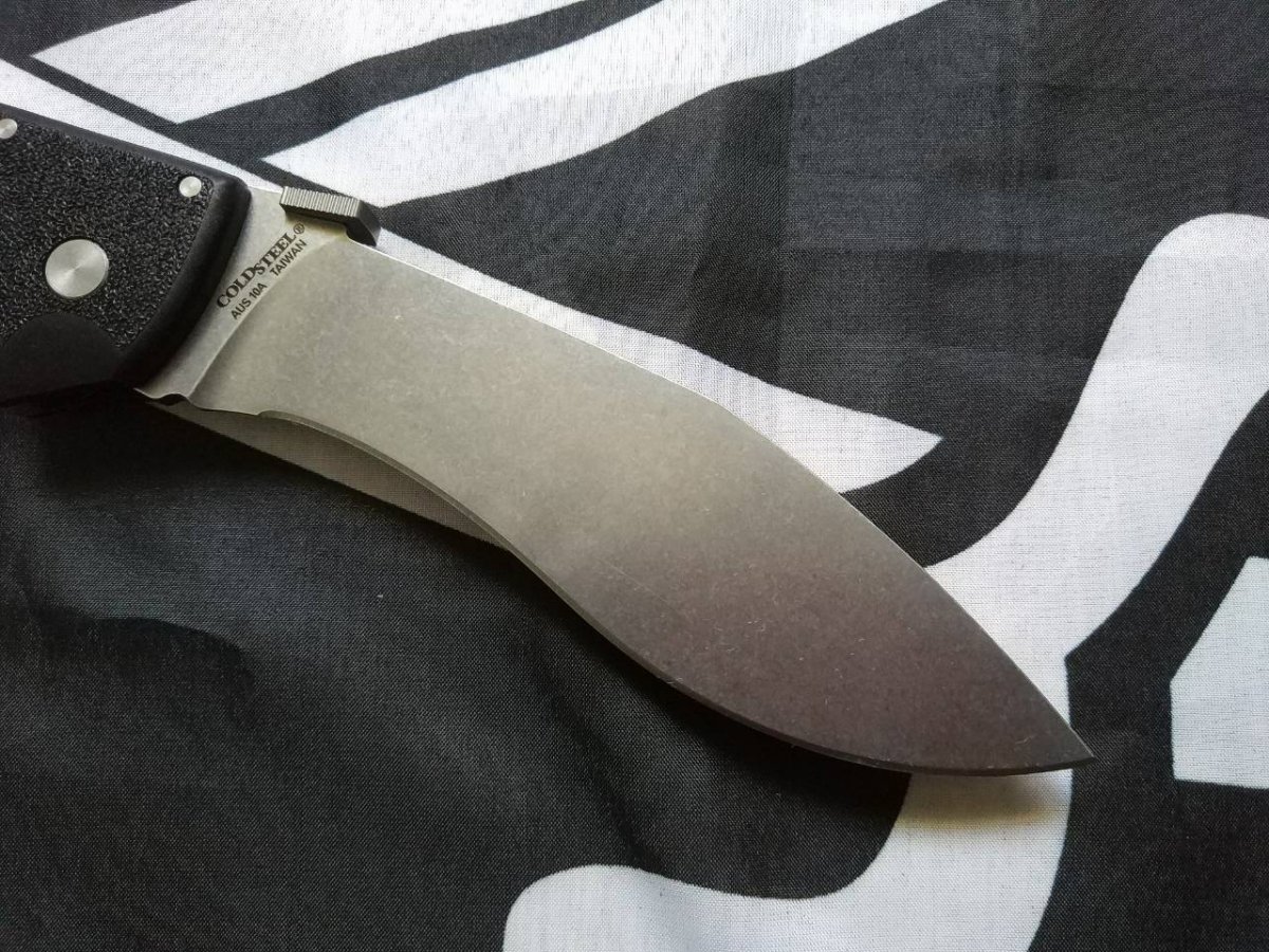 Форма лезвия «Kukri». При профиле (спусках) клинка "от обуха" этот нож режет просто отлично. Режущая кромка, как мы уже упоминали, имеет своеобразный изгиб, что в процессе резания увеличивает глубину проникновения лезвия в разрезаемый материал. А толщина в 4,8 мм дает отличный запас прочности. Такому клинку, действительно, под силу решать очень широкий спектр задач. Финишная обработка клинка стоунвош позволяет избежать мелких царапин. Представленная версия, это новинка 2018 г. Отличие в используемой стали - на этот раз в серии начали использовать сталь AUS-10A японского производства (производитель Aichi Steel Works).
