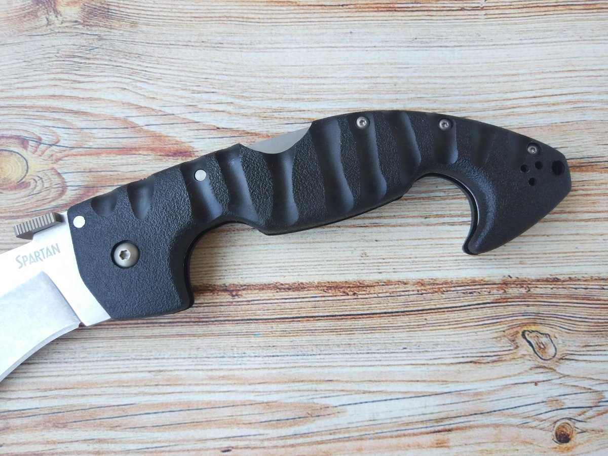 Рукоять SPARTAN – современное воплощение рукояти кописа, фалькаты или махайры. Данная геометрия исключает потерю оружия в бою, образует своеобразную гарду и помогает извлечению застрявшего меча из пробитых доспехов врага. В современное время, такая форма рукояти выполняет те же функции, но в прикладных задачах - на природе, обустройстве походного лагеря и других хозяйственных работах. Рукоять состоит из двух лайнеров и накладок из гривори с глубоко текстурированными поперечными полосами (многие называют их «тигриными»). В четырех основных хватах (прямом, сабельном, фехтовальном и обратном) рукоять Cold Steel Spartan просто великолепна. Нож отлично сбалансирован - при открытой ладони он не выпадает из рук, точка балансировки находится на указательном пальце.