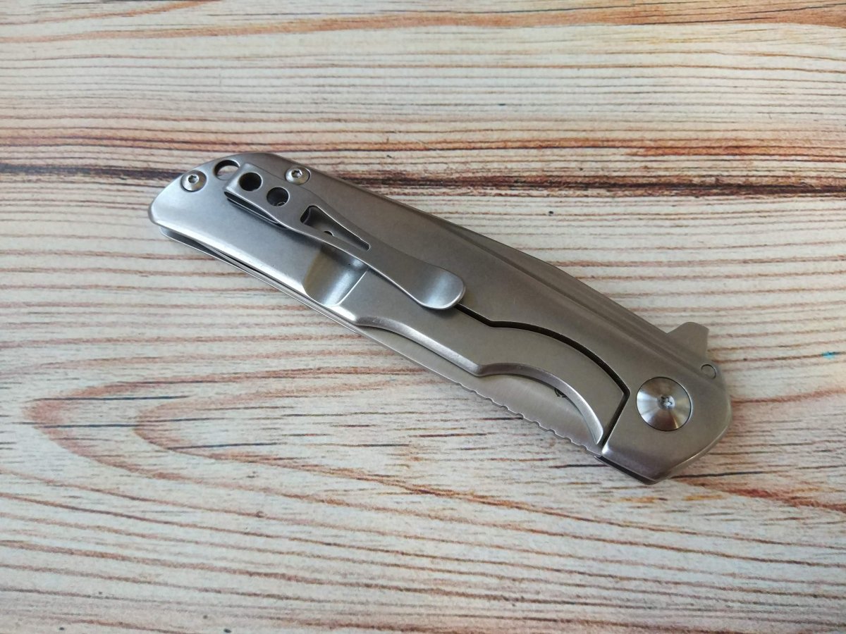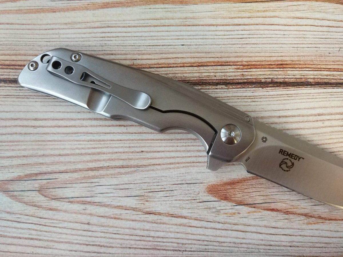 Рукоять ножа CRKT Remedy открытого типа, образована двумя стальными пластинами с финишной обработкой Stonewash. Рукоять CRKT Remedy легко обслуживается и не склонна собирать внутри пыль, грязь, нитки, фантики и что ещё там может оказаться в кармане. Из особенностей рукояти можно выделить глубокую подпальцевую выемку обеспечивающую надёжный хват. И своего рода вогнутую фаску на спинке, грань которой визуально переходит в границу спуска клинка CRKT Remedy. Присутствует темлячное отверстие и в меру тугая клипса, правда вот не переставляемая её положение – tip-up (нож CRKT Remedy размещается на кармане осевым узлом вниз).