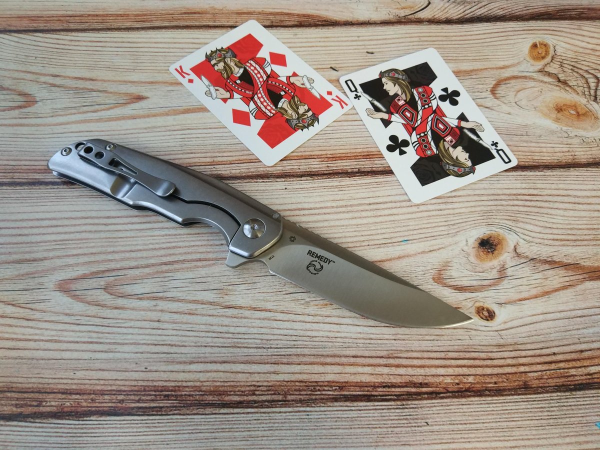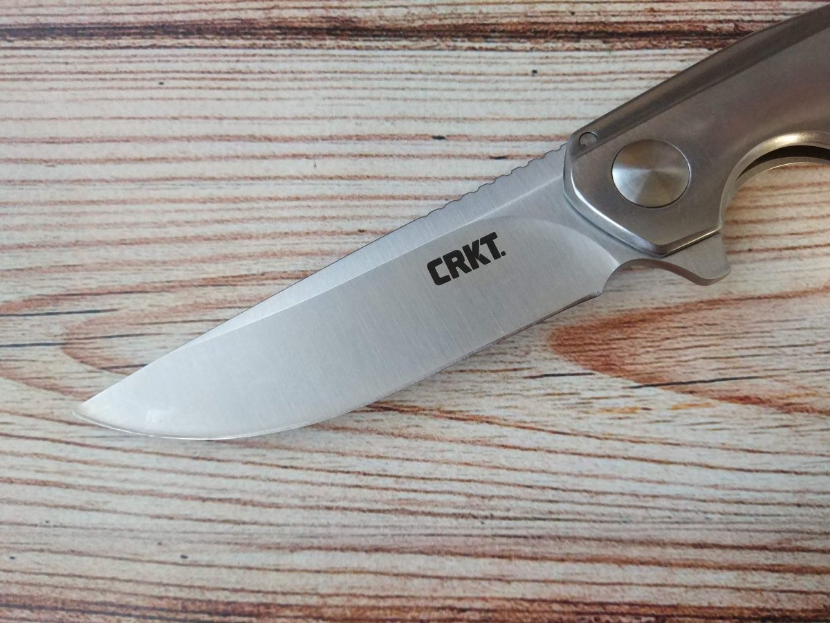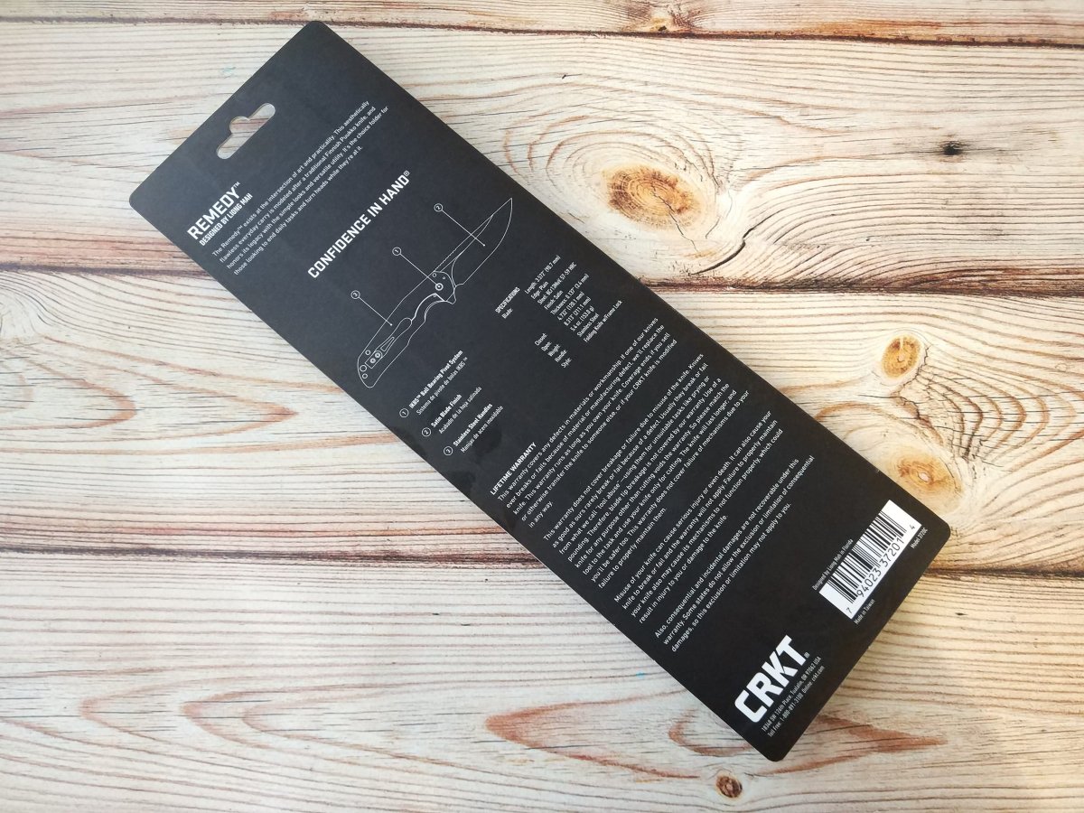 Клинок CRKT Remedy очень близок по форме к традиционными финским ножам Puukko. Высокие вогнутые спуски Remedy начинаются практически от обуха, присутствует слабовыраженная рекурва (S-образная форма режущей кромки), клинок такой формы чуть сложней точить, зато он смачно режет «с протягом». Обух клинка CRKT Remedy трапециевидной формы имеет довольно крупную насечку, в которую удобно упереться большим пальцем, если требуется приложить большее усилие при резе. Аккуратный плавник клинка, служит для удобного раскрытия ножа CRKT Remedy одной рукой и в открытом состоянии образует подпальцевый упор.