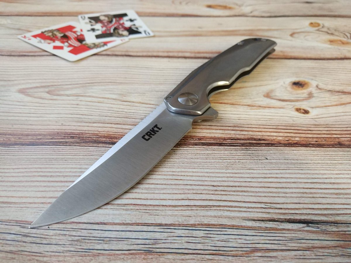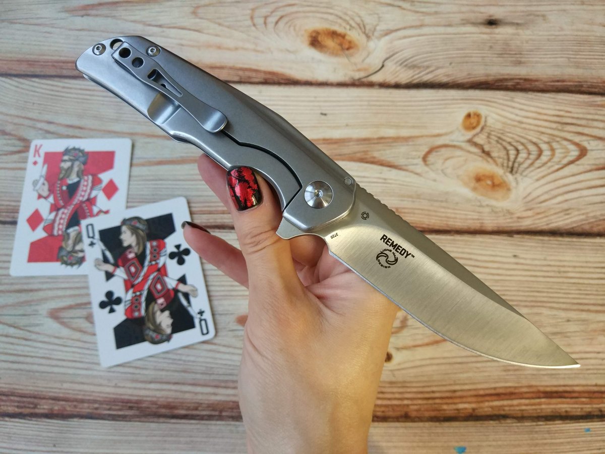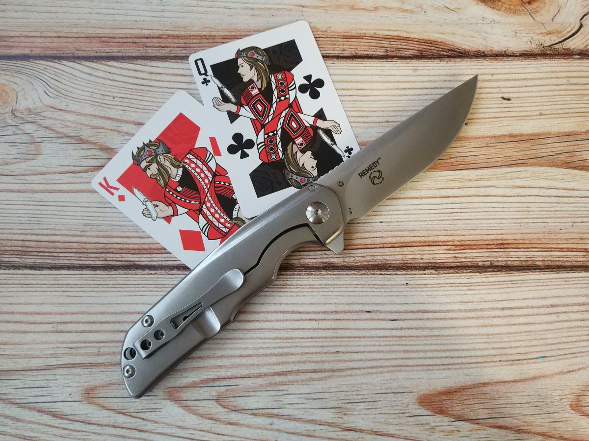 Клинок CRKT Remedy очень близок по форме к традиционными финским ножам Puukko. Высокие вогнутые спуски Remedy начинаются практически от обуха, присутствует слабовыраженная рекурва (S-образная форма режущей кромки), клинок такой формы чуть сложней точить, зато он смачно режет «с протягом». Обух клинка CRKT Remedy трапециевидной формы имеет довольно крупную насечку, в которую удобно упереться большим пальцем, если требуется приложить большее усилие при резе. Аккуратный плавник клинка, служит для удобного раскрытия ножа CRKT Remedy одной рукой и в открытом состоянии образует подпальцевый упор.