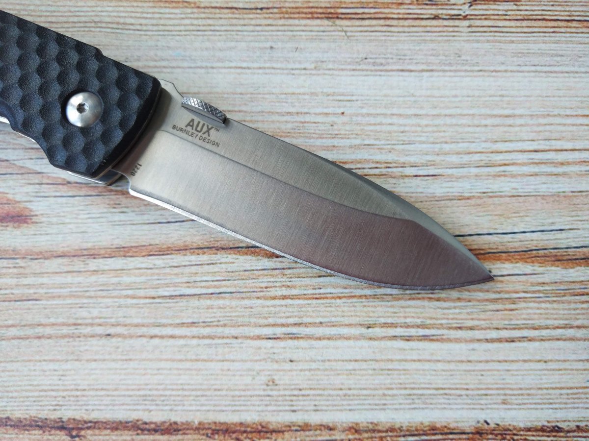 Клинок ножа выполнен из стали 8Cr13MoV, широко применяемой при производстве ножей среднего ценового сегмента. 8Cr13MoV это высокоуглеродистая средне хромистая коррозионностойкая сталь, содержащая в своём составе молибден и ванадий. Форма клинка Drop Point, тип заточка «Plain», финиш - Satin. Клинок CRKT Aux™ (1221K), изготовленный из этой стали обладает хорошей коррозионной стойкостью и способен длительное время сохранять остроту режущей кромки. Править и точить клинок из стали 8Cr13MoV не сложно, для этого вполне достаточно бруска, мусата и базовых навыков.