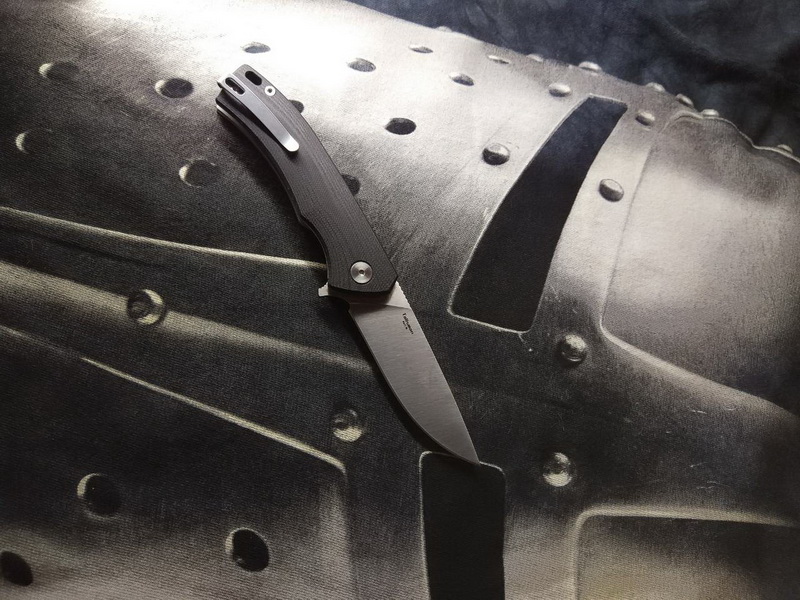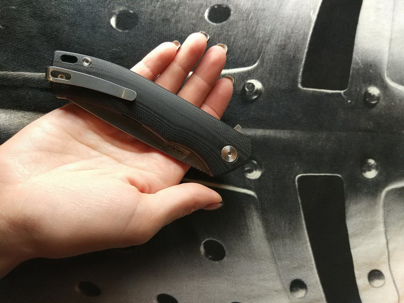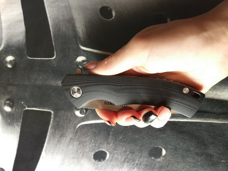 Рукоять открытого типа состоит из двух стальных (облегченных) лайнеров, двух накладок из G-10 (c так называемой 3d обработкой) и спейсера так же выполненного из g10. Дополняет общую картину съемная клипса глубокой посадки и отверстие по темляк (довольно не маленького размера, так что продевание шнура или паракорда не превратится в «танцы с бубном», как это часто бывает на многих моделях). Отдельной «изюминкой» этой модели стала стилизация осевого болтика под букву «H», смотрится необычно и красиво. Но и тут компания не забыла про пользователей (в отличие от очень многих производителей, которые используют этот «прием») и эта «стилизация» идет только с одной стороны, со второй стороны болтик имеет стандартный торкс, так что необходимости искать-придумывать какой-то специальный ключик, нет.