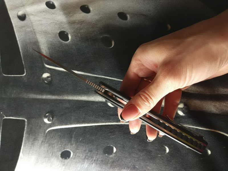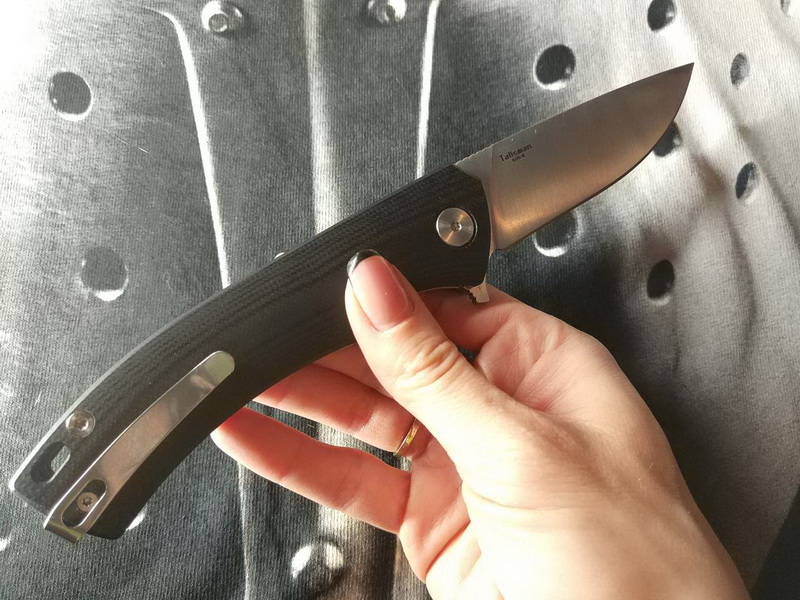 Этот нож представляет собой следующий этап развития компании. Талисман это флиппер на подшипнике (латунная обойма с керамическими шариками). Шпеньки отсутствуют, нож открывается «плавником-флиппером», который кроме функции «открывания» еще и служит в открытом положении гардой, предотвращая соскальзывание пальцев на клинок даже при «тяжелых» работах. Нож имеет «на борту» японскую сталь AUS8 (известную и проверенную на огромном количестве ножевой продукции) и простой и надежный замок Liner-lock (шарик на лайнере так же керамический). Форма клинка «классическая» с незначительным понижением линии обуха к острию, спуски прямые от обуха. Сочетание стали и геометрии дает в совокупности довольно приятный рез.