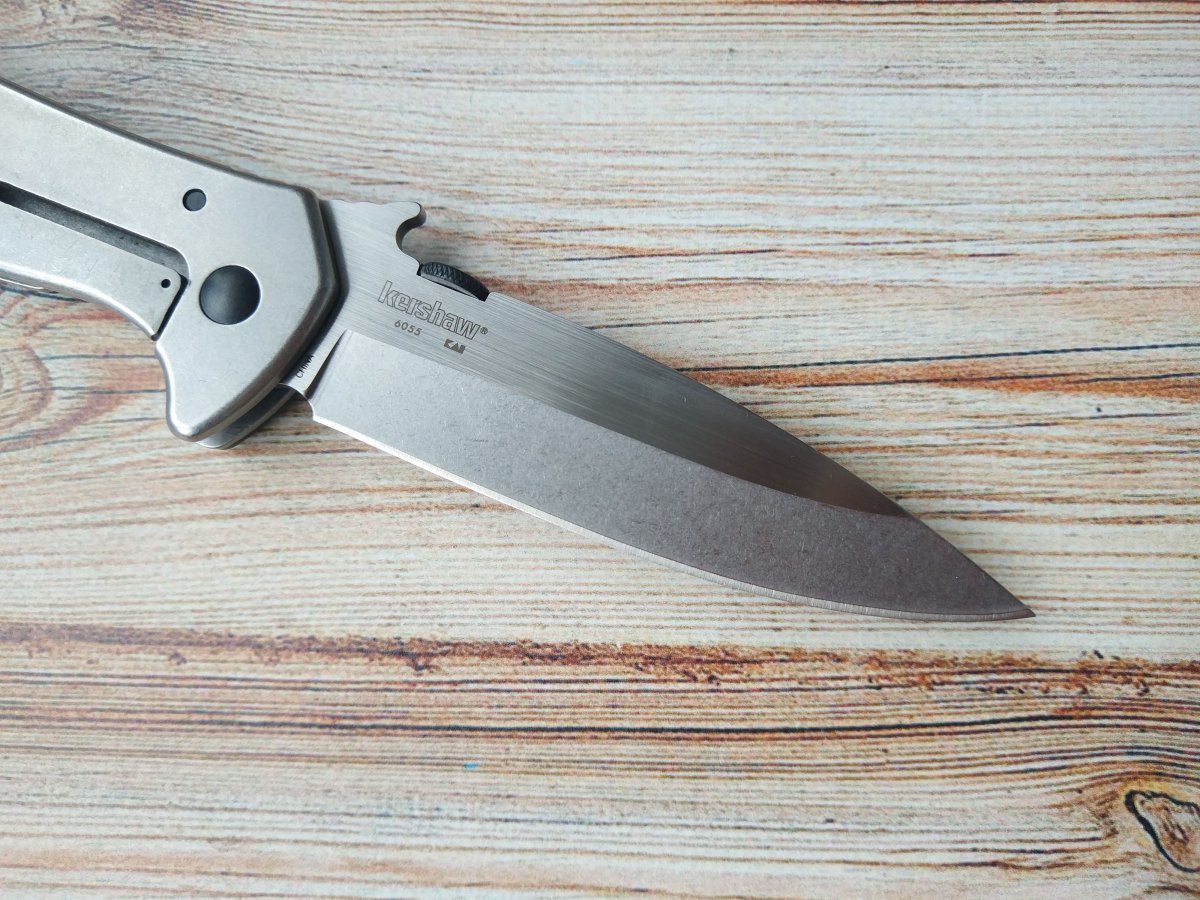 Клинок Kershaw Emerson 6055 изготовлен из стали 8Cr14MoV, форма клинка - Drop Point (я бы даже сказал что форма ближе к Spear point). За счет высоких спусков и общей геометрии нож обладает шикарной проникающей способностью и хорошо режет. Финиш клинка - двойной, Stonewash (на спусках и обухе) и продольный Satin (на плоскостных участках).