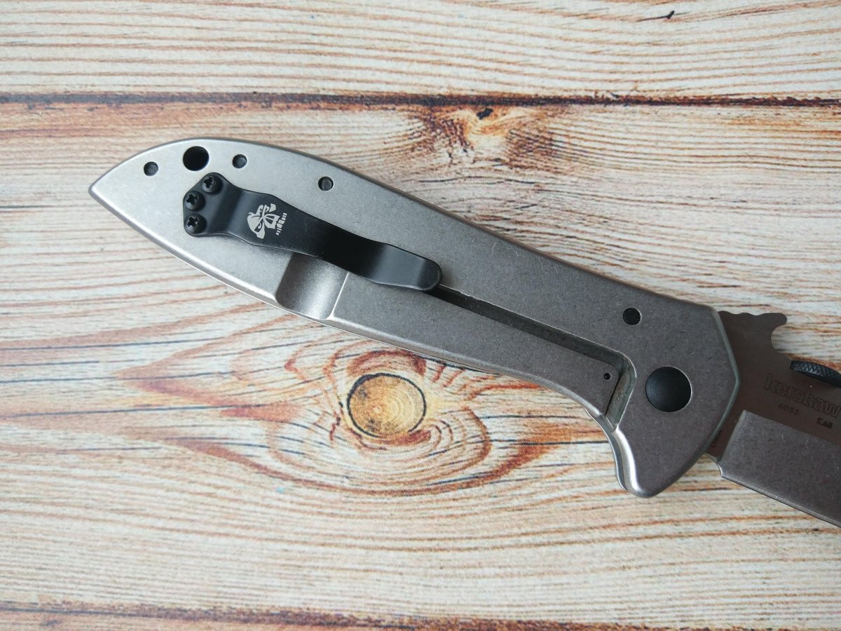 Рукоять - полностью стальная со стороны замка. И стальной лайнер с накладкой из G-10 с другой. Kershaw Emerson CQC-4K XL отлично сидит как в большой, так и в маленькой ладони. Все насечки и изгибы сделаны именно там, где должны быть - хватов уйма. Рукоять подразумевает два положения клипсы - для правого и левого карманов - клипса стандартная, черная с фирменным черепком Emerson.