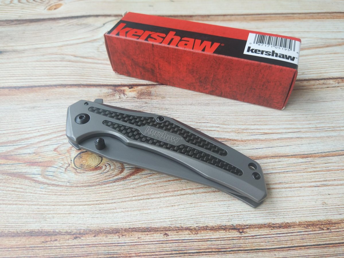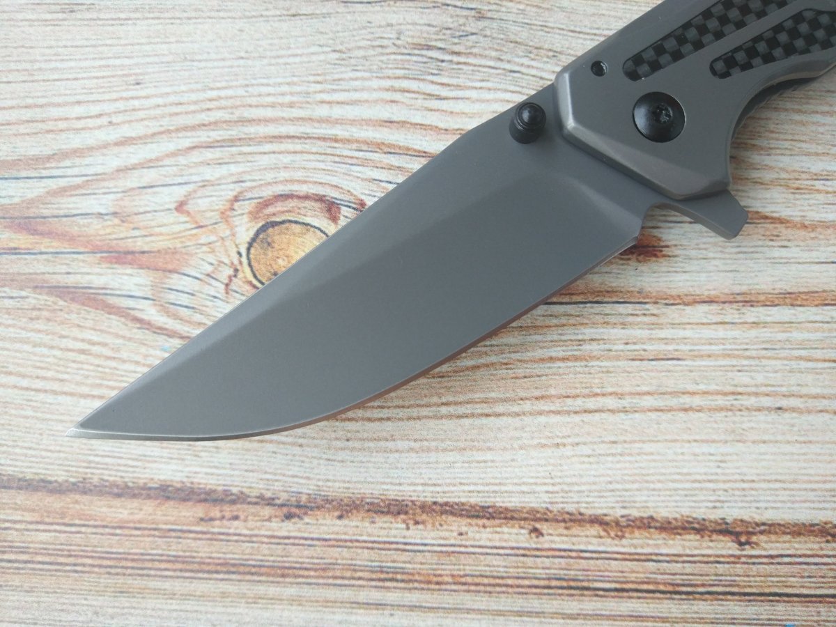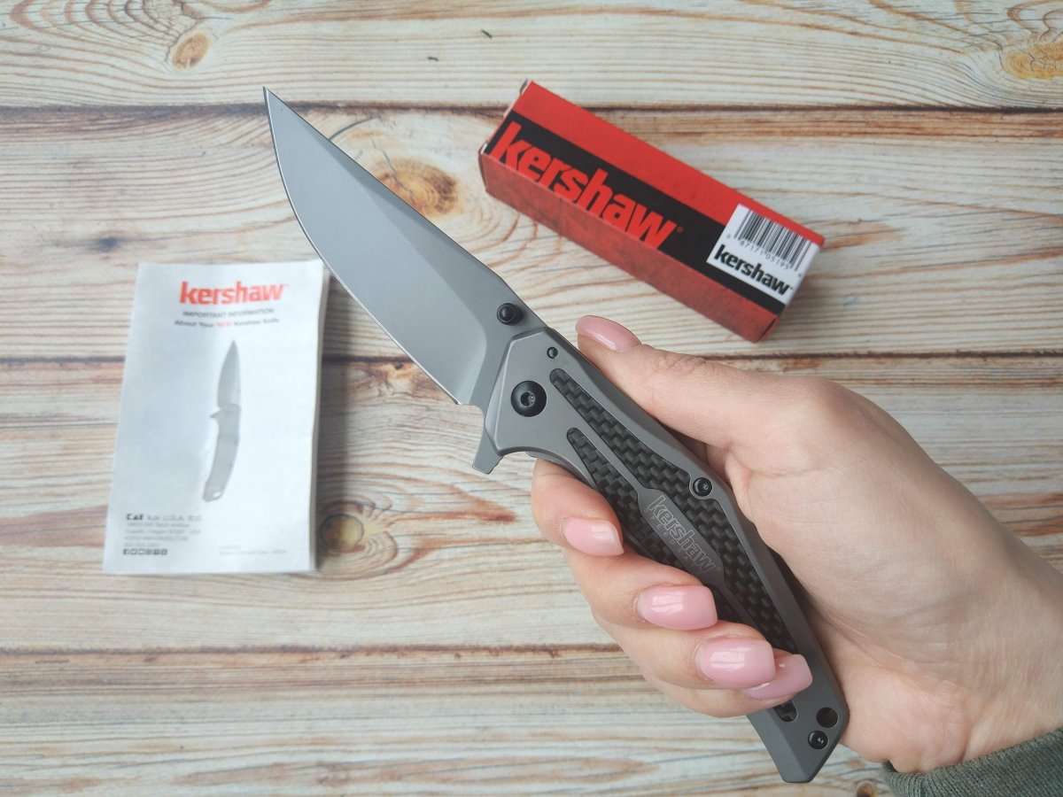 Тут я отступлю от своего правила и начну рассказ не с функционала ножа, а с его великолепного дизайна, превратившего бюджетный нож в стильный мужской аксессуар, обладающий огромной харизмой. Нож, действительно, покоряет и завораживает с первого взгляда. Потрясающий дизайн обеспечен агрессивной геометрией клинка, сложной формой рукояти и преимущественно серыми тонами в цветовой палитре его оформления. Именно матовое серое покрытие из карбонитрида титана (Carbonitride Titanium™) на сглаженных изгибах клинка и рукояти формирует единый образ серой, размытой и устрашающей тени (так и хочется добавить «во мраке»), а идеально ровные глянцевые аппликации из карбоновой пленки, бликующие при повороте рукояти, усиливают ощущение проскользнувшего силуэта, делая эту тень еще опаснее и страшнее. Это все, конечно, лирика, однако, настоящие любители ножей знают, что каждый нож, в который вложена душа при его создании, вызывает какие-то ассоциации. Этот «сумеречный» красавец вызывает у меня ощущение неясного стремительного силуэта, несущего опасность, и я подсознательно рад, что Kershaw 8300 DuoJet – мой друг, а не враг. Я не знаю автора этого шедевра, но он достоин того, чтобы получить лавры гениального мастера только за одно - это творение.