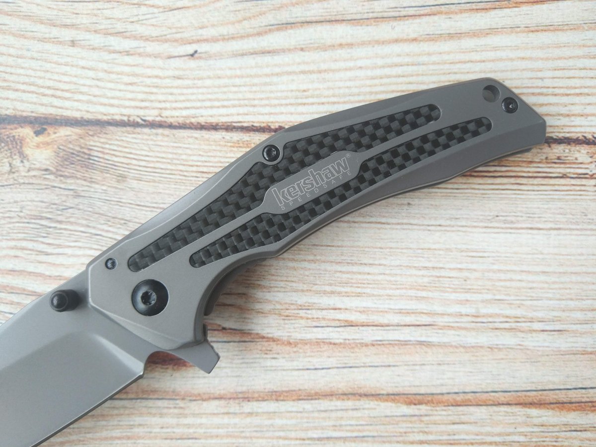 Теперь рассмотрим рукоять ножа, которая и делает его, по-настоящему стильным мужским девайсом. Открытая рукоять выполнена из двух полных стальных плашек, которые, благодаря серому титано-карбонитридному покрытию, визуально кажутся титановыми. Это заблуждение поддерживают и карбоновые аппликации, создающие ножу более дорогой внешний вид. Черная фурнитура – шпеньки, скрепляющие плашки бонки, осевой винт и однопозиционная клипса гармонично вписывается в дизайн ножа. Однако, кроме такого важного для ножа элемента как красота дизайна, рукоять дарит Kershaw 8300 DuoJet еще большее – комфорт в работе. Легкий пистолетный изгиб, подпальцевая выемка с неагрессивными насечками на фрейме замка Frame lock и небольшая гарда плавника – все это обеспечивает безупречный контроль ножа в любых работах.