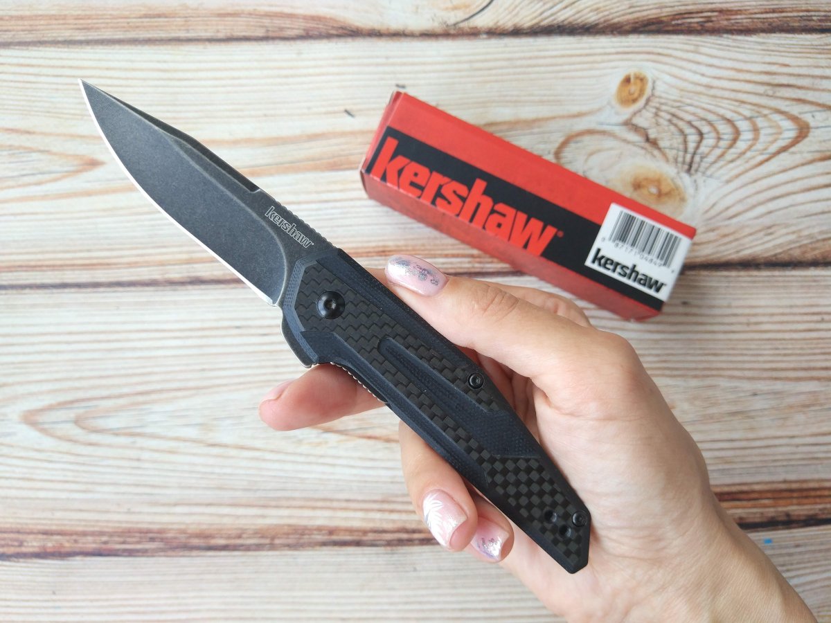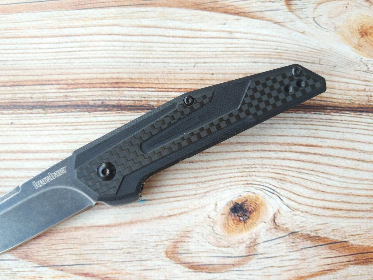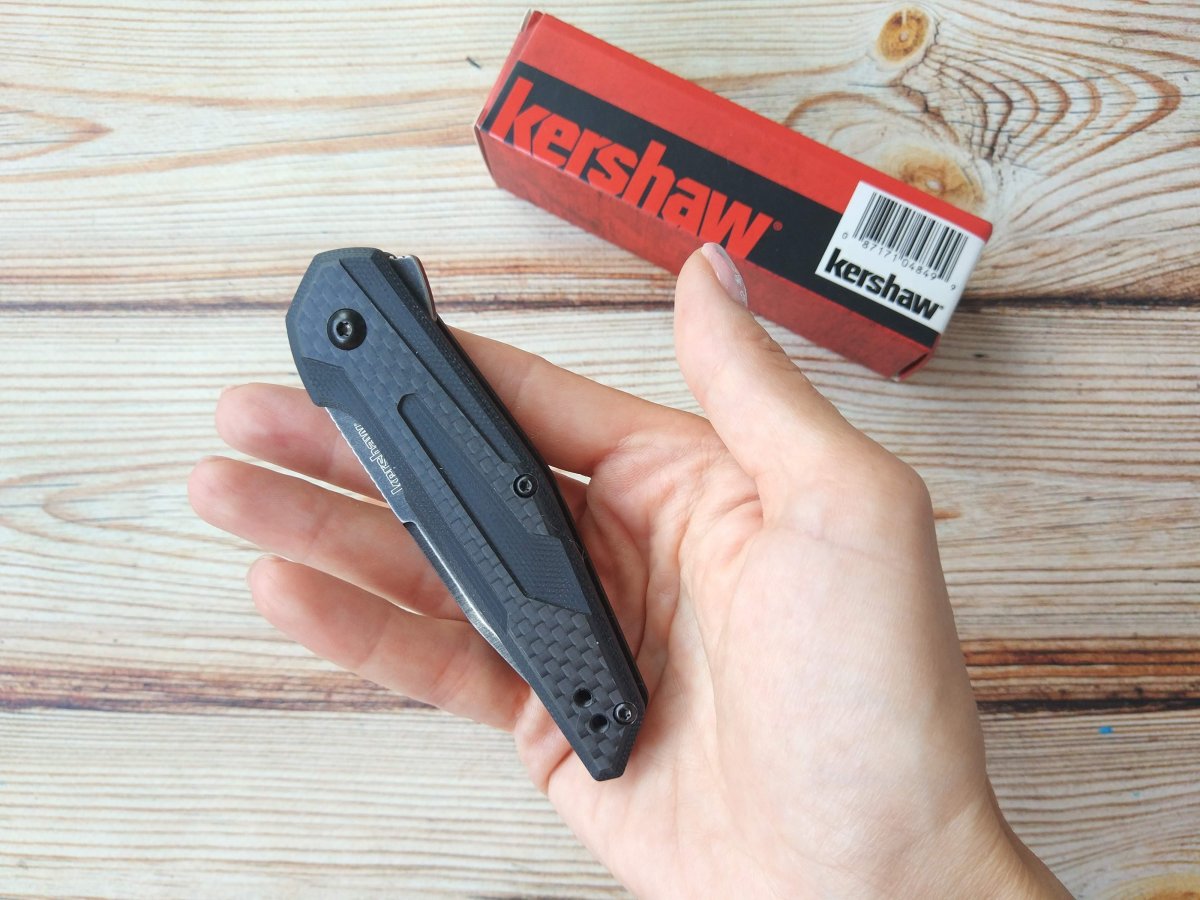 Вес этого малыша всего около 54 грамм, а длинна в сложенном состоянии около 10 см, он поместится в любом кармане и уж тем более сумке и будет там совершенно не заметно пребывать вплоть до того момента как он вам понадобится. Смею заверить, что извлекать его из кармана придётся часто, по делу и без оного, потому что ощущения этот миниатюрный инструмент дарит самые позитивные. Здесь нет привычного бюджетным моделям компании Кершоу ассиста, вместо этого применены подшипники в металлической обойме. Данный нож – чистый городской EDC. В силу компактных размеров и малого веса им с лёгкостью могут пользоваться и дамы, а индустриальный дизайн, обыгранный вставками из карбона непременно найдёт ценителей в среде ножеманов всех возрастов.