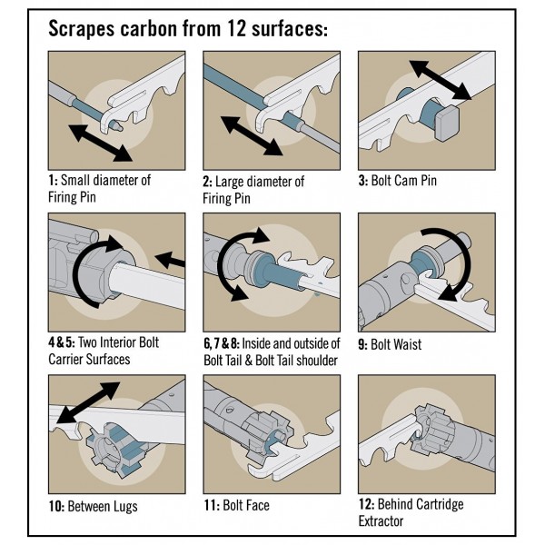 Знімає нагар з ударника, з поверхні затвора, дзеркала затвора, бойових упорів, а також із рами затвора.