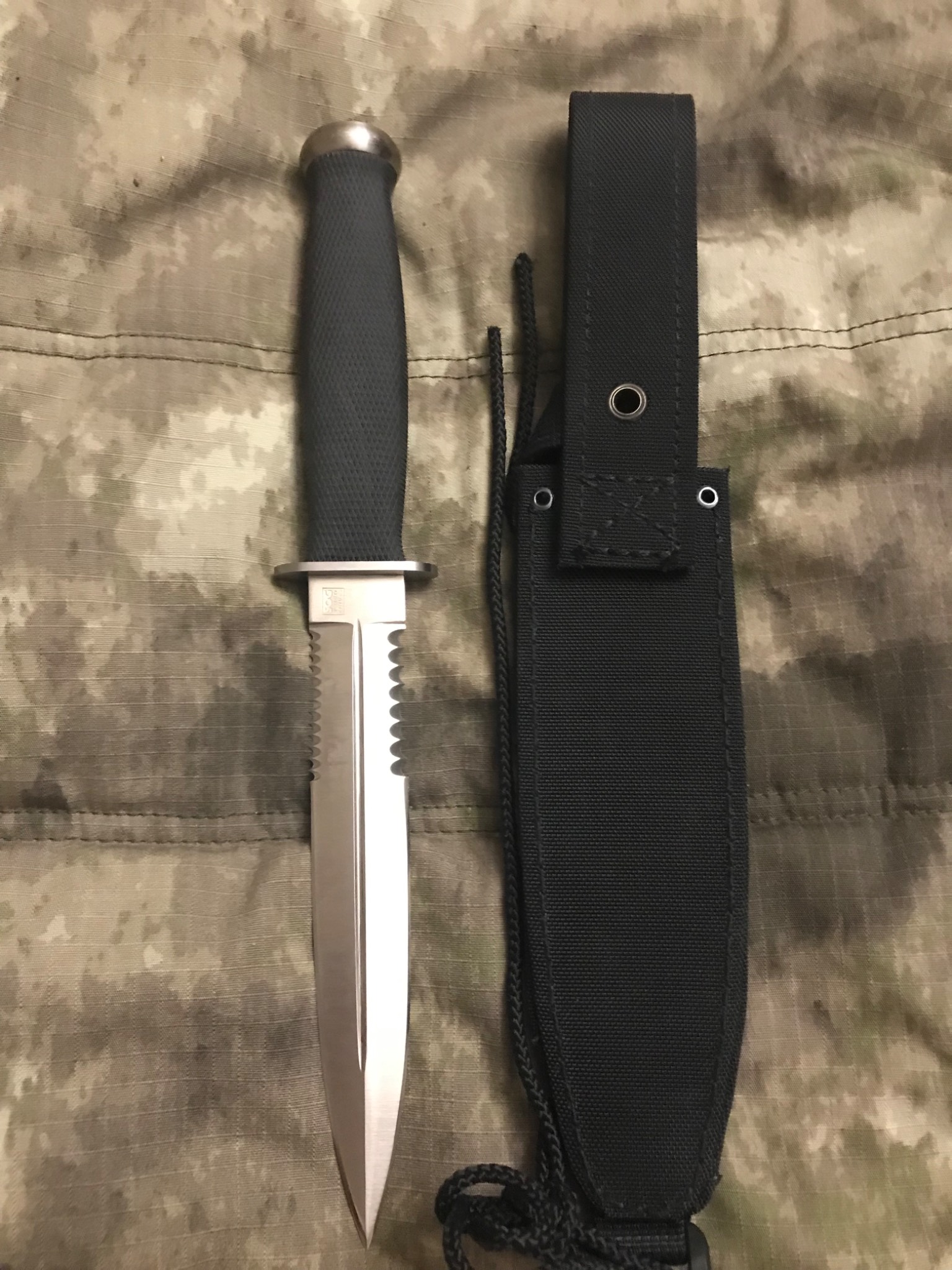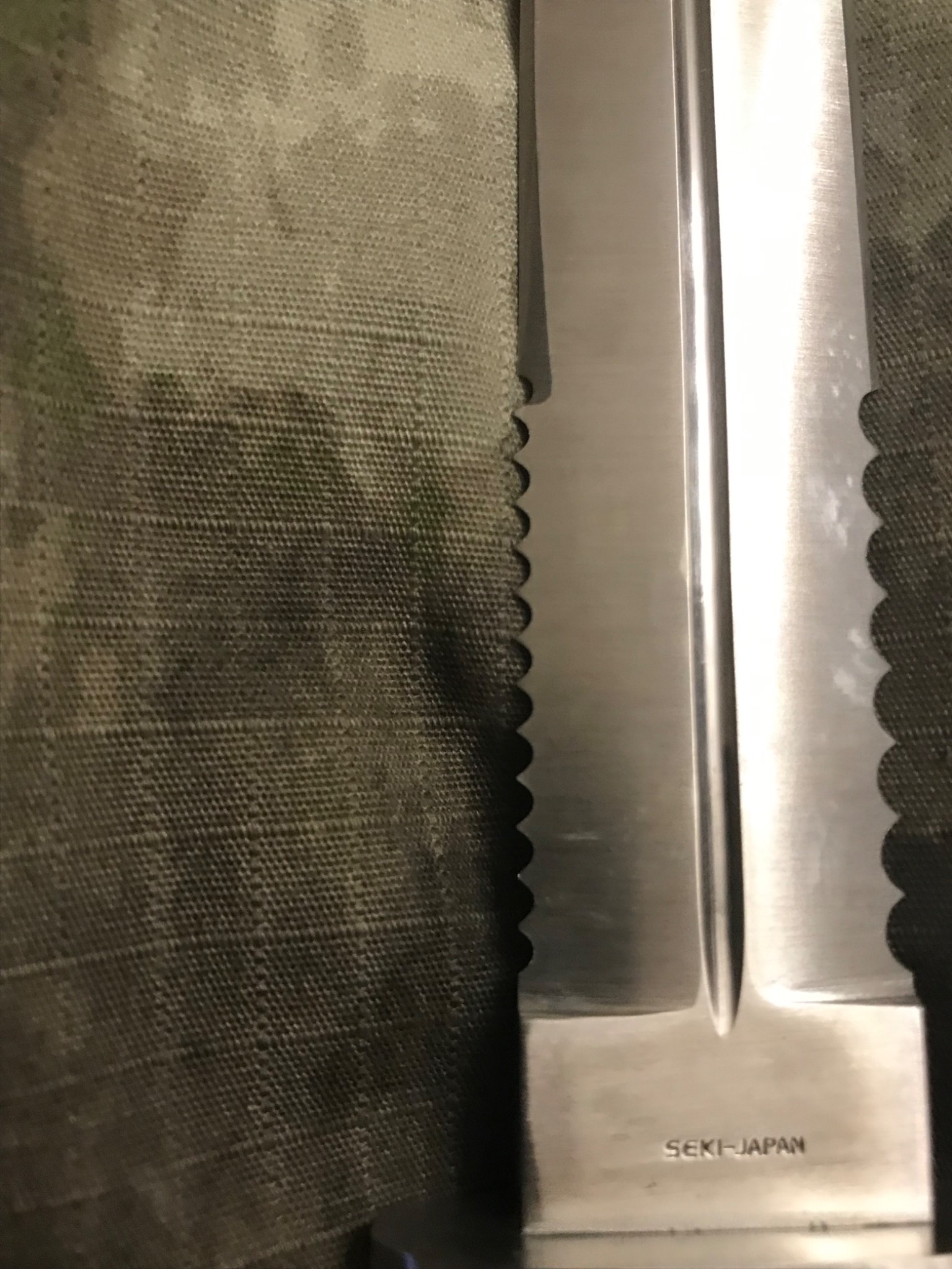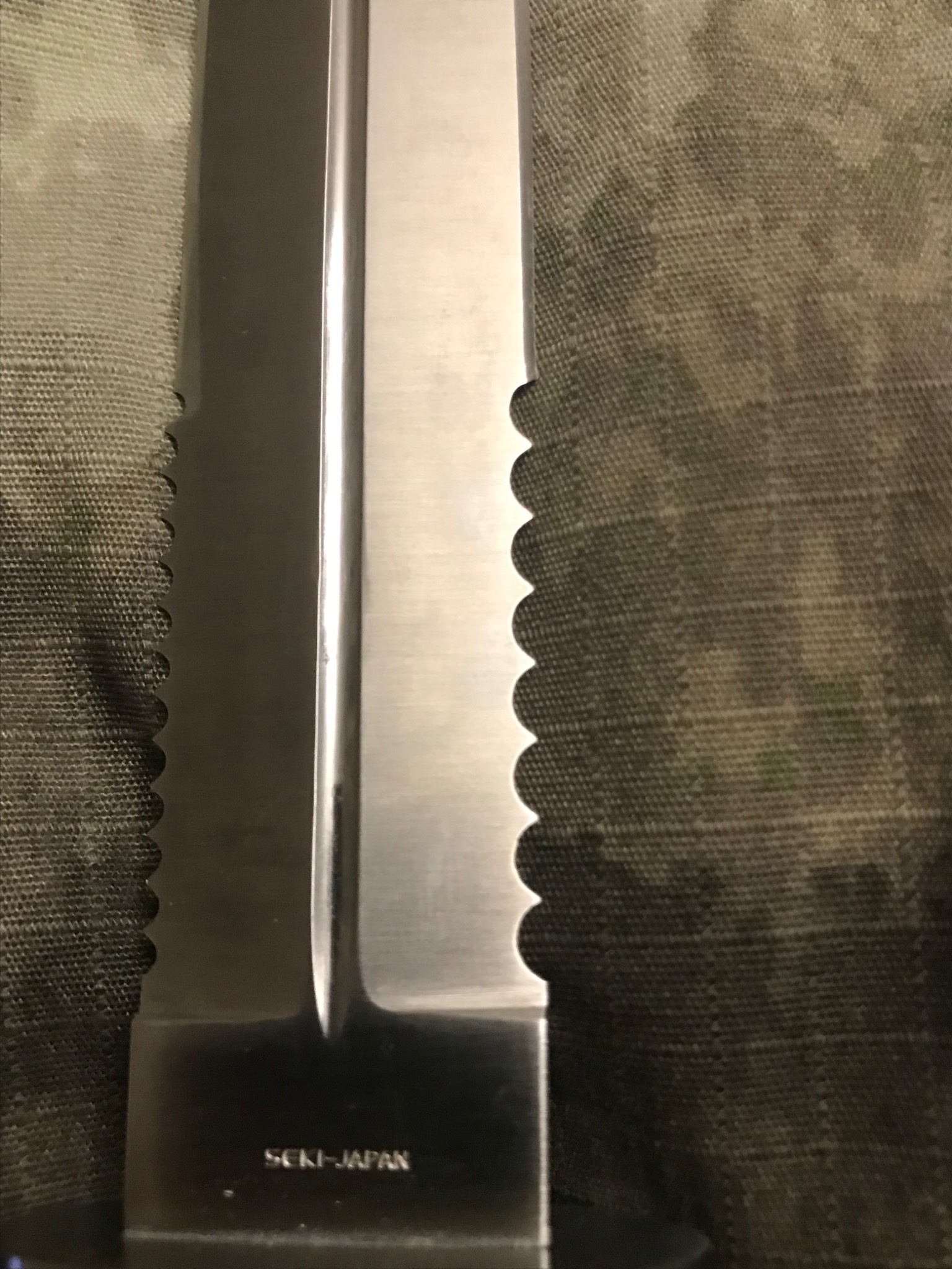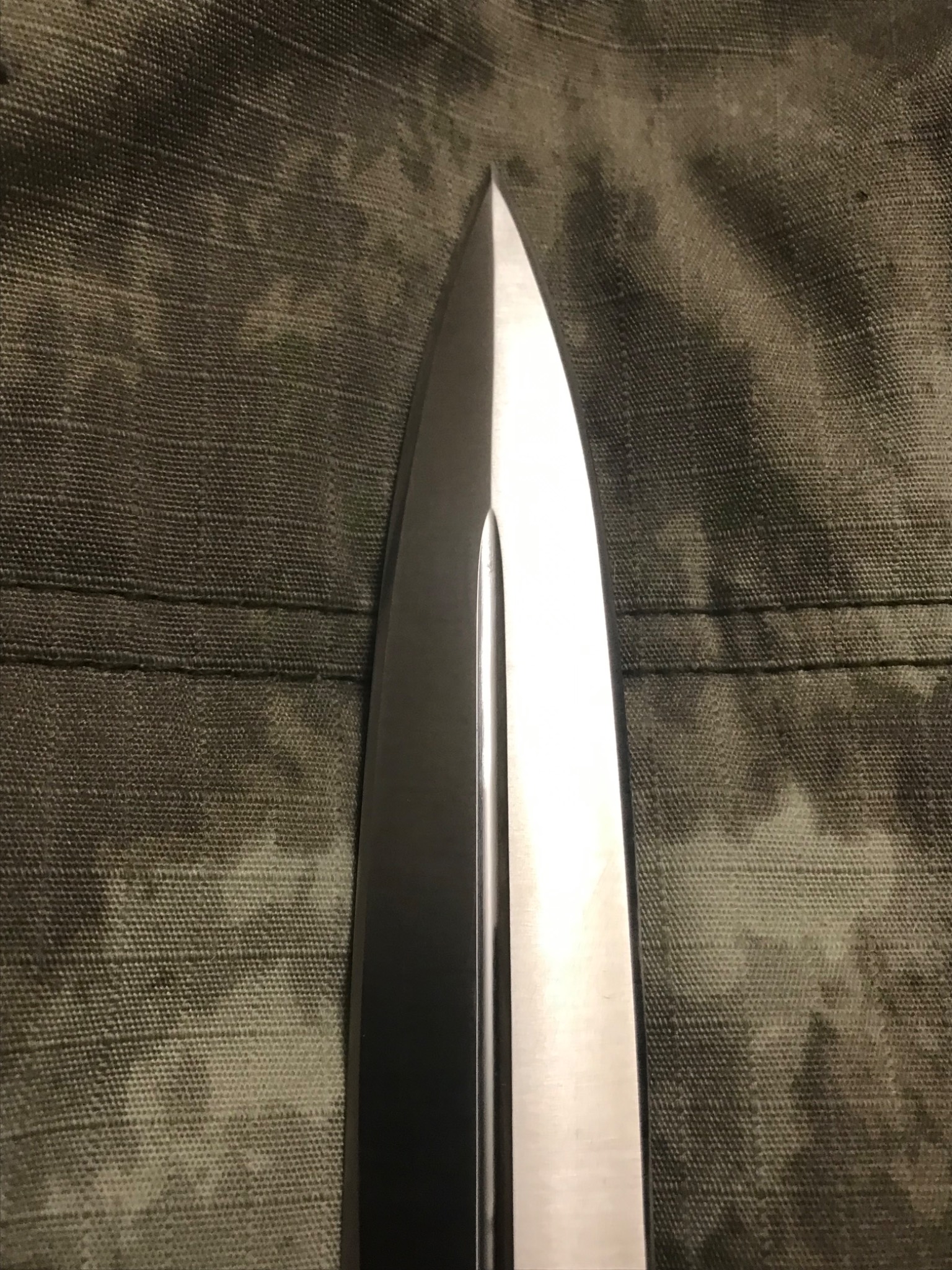 Заточка: двусторонняя, скошенная, с центральным долом и зубчатыми участками с обеих сторон у рукояти.