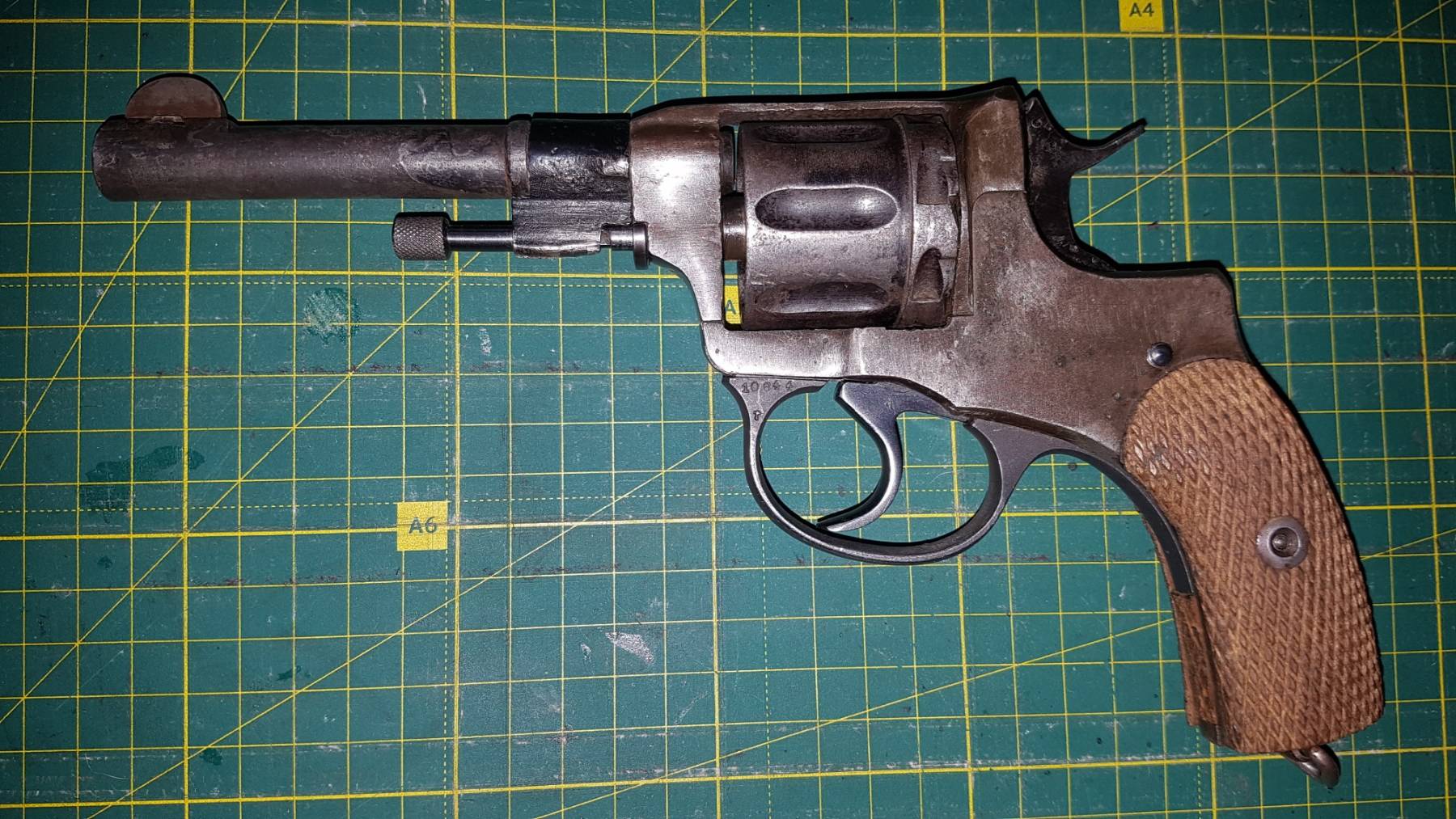 Солдатский наган, бывший коп, отполированный каким-то умельцем так, что номеров и название завода уже не видно. Многие запчасти не родные. Что-то царское, а что-то уже советское.