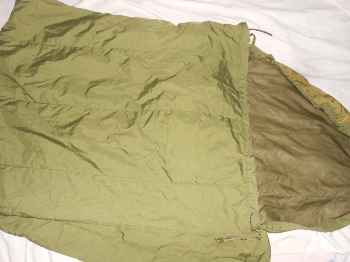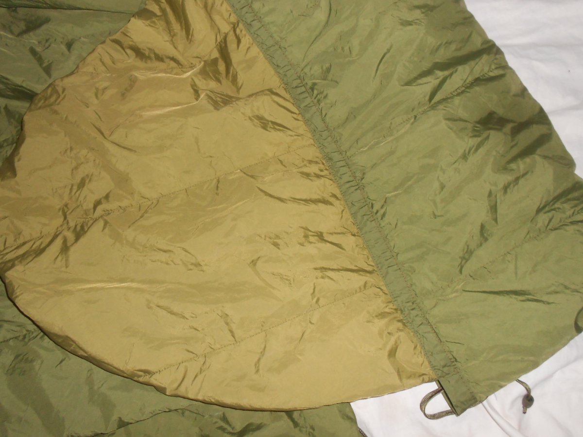 Изготовлен из легкой синтетической ткани с наполнителем. Цвет оливково-зеленый. Имеется капюшон с утяжкой и внутри тесемки, для крепления вкладыша ("простыни")