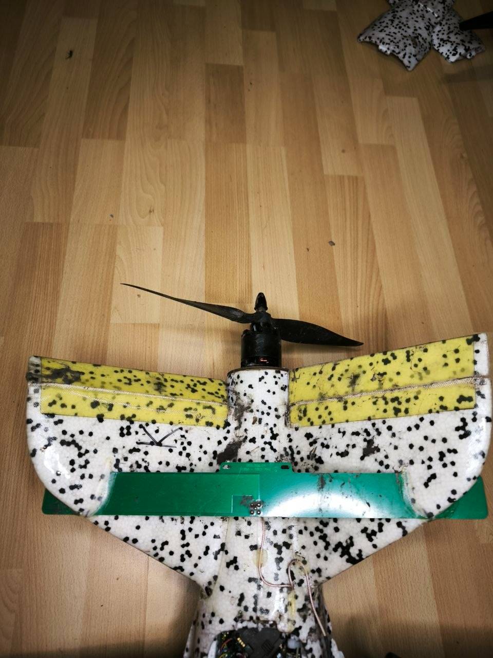 Ударно-коригуючий бпла в задовільному стані. При під'єднанні батареї запускається, винт цілий. З мінусів пахне мишами, хотіли заволодіти літаючим апаратом, трохи пожували пінопласт.