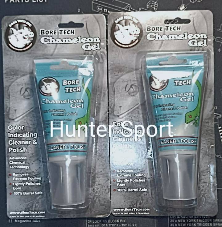 Bore Tech CHAMELEON GEL - передовий засіб з колірною індикацією для чищення та полірування зброї, ефективно усуває вуглецеві і пластикові відкладення, оміднення і освинцювання. Унікальний хімічний склад абсолютно нешкідливий і повністю біологічно розкладний. Простий у використанні гель не вимагає попередньої підготовки і потім легко видаляється.