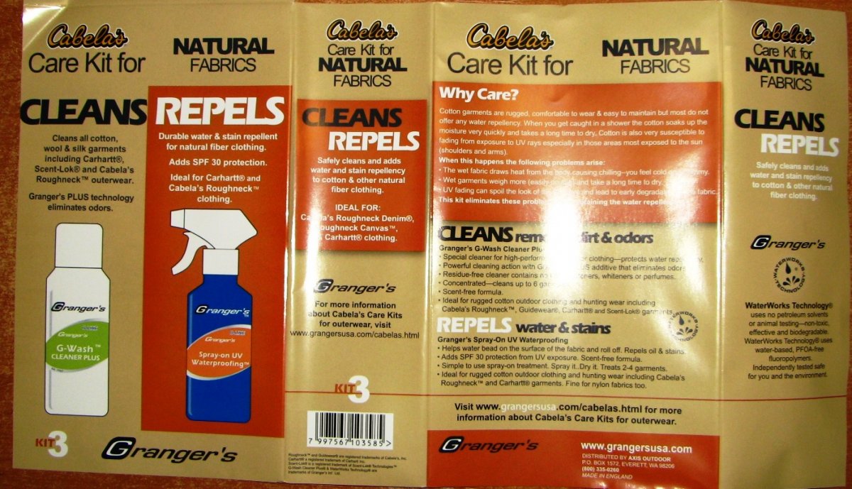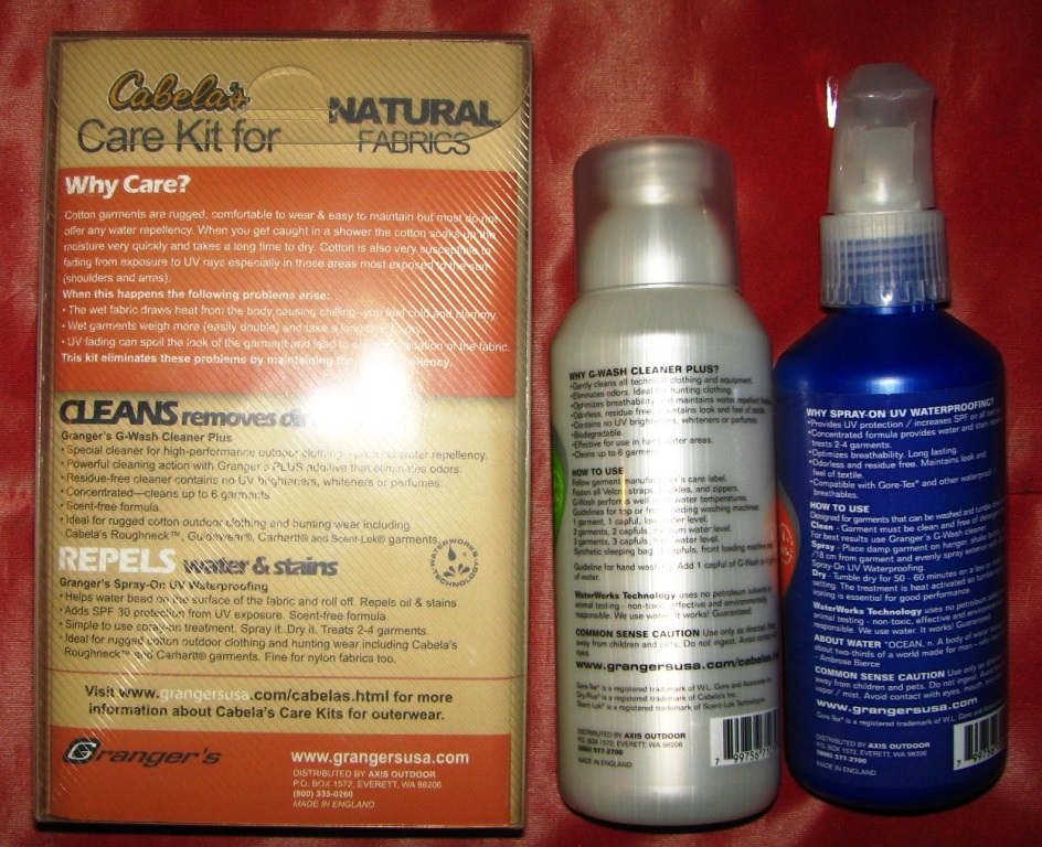 FEATURES A G-WASH GRANGERS G-LINE CLEANER PLUS LARGE 10 OZ,FOR ALL OUTDOOR CLOTHING,IDEAL FOR GORE-TEX,DRY PLUS AND SCENT -LOCK, ELIMINATES ODORS.CONCENTRATED.GENTLY CLEANS ALL TECHNICAL CLOTHING AND EQUIPMENT.IDEAL FOR HUNTING CLOTHES.OPTIMIZES BREATHABILITY AND MANTAINS LOOK AND FEEL OF TEXTILE.CONTAINS NO UV BRIGHTENERS,WHITENERS OR PERFUMES. HEAVY BOX WEIGHS 1 LB 10 OZ WITHOUT BOX! BIODEGRADABLE.EFFECTIVE FOR USE IN HARD WATER AREAS.CLEANS UP TO 6 GARMENTS.ALL SO FEATURES A LARGE GRANGERS G-LINE SPRAY -ON UV WATERPROOFING 9.3 FL.OZ.INCREASES SPF RATING ON ALL OUTDOOR CLOTHING.ADDS DURABLE WATER AND STAIN REPELENCY.PROVIDES UV PROTECTION/INCREASES SPF ON ALL TEXTILES.CONCENTRATED FORMULA PROVIDES WATER AND STAIN REPELENCY,TREATS 2-4 GARMENTS.OPTIMIZES BREATHABILITY,LONG LASTING.ODORLESS AND RESIDUE FREE.MAINTAINS LOOK AND FEEL OF TEXTILE.COMPATIBLE WITH GORE-TEX AND OTHER WATERPROOF/BREATHABLES.WOW THIS SET IS AWESOME EVERY HUNTER OR OUTDOORSMAN NEED IT!