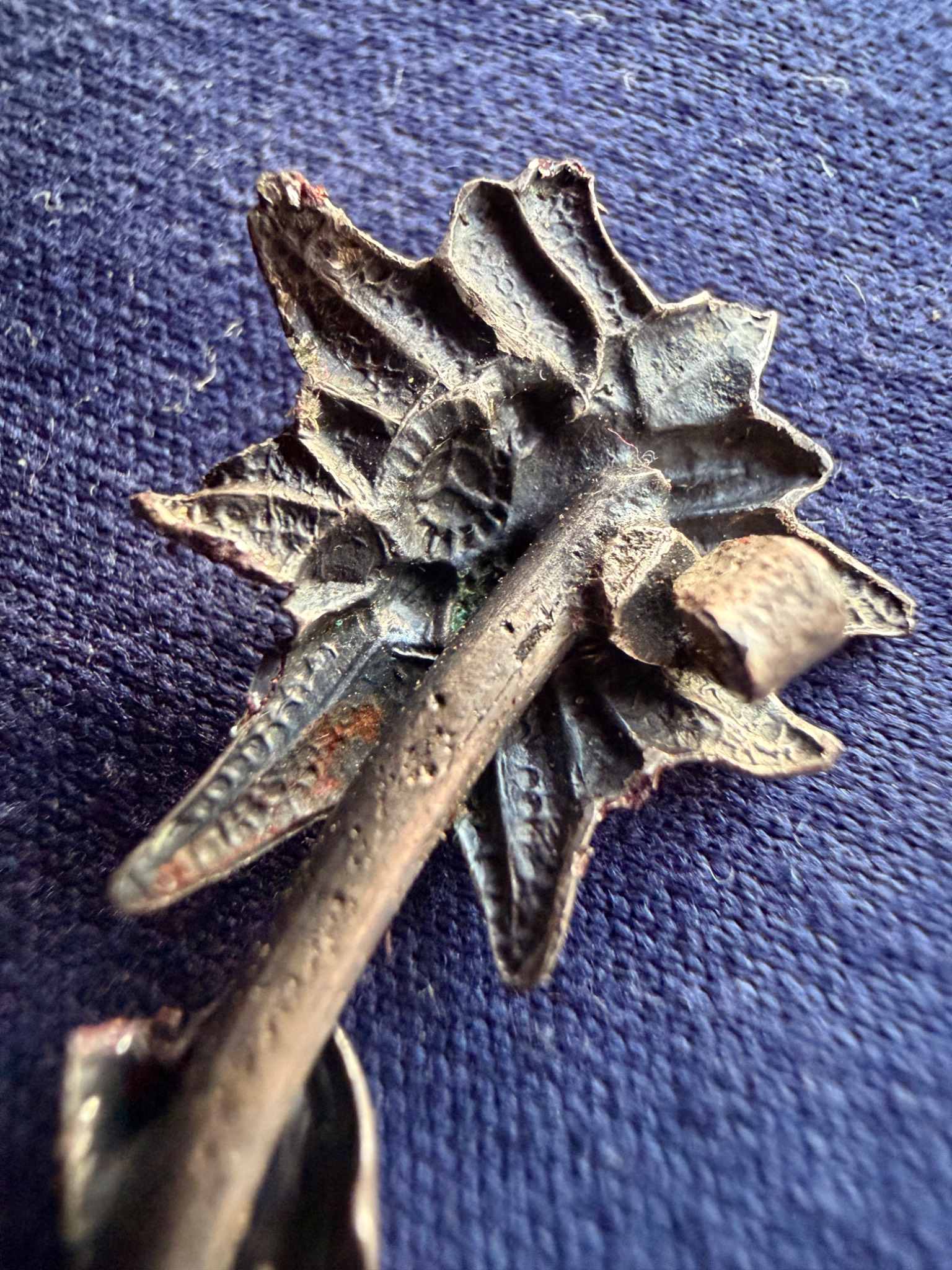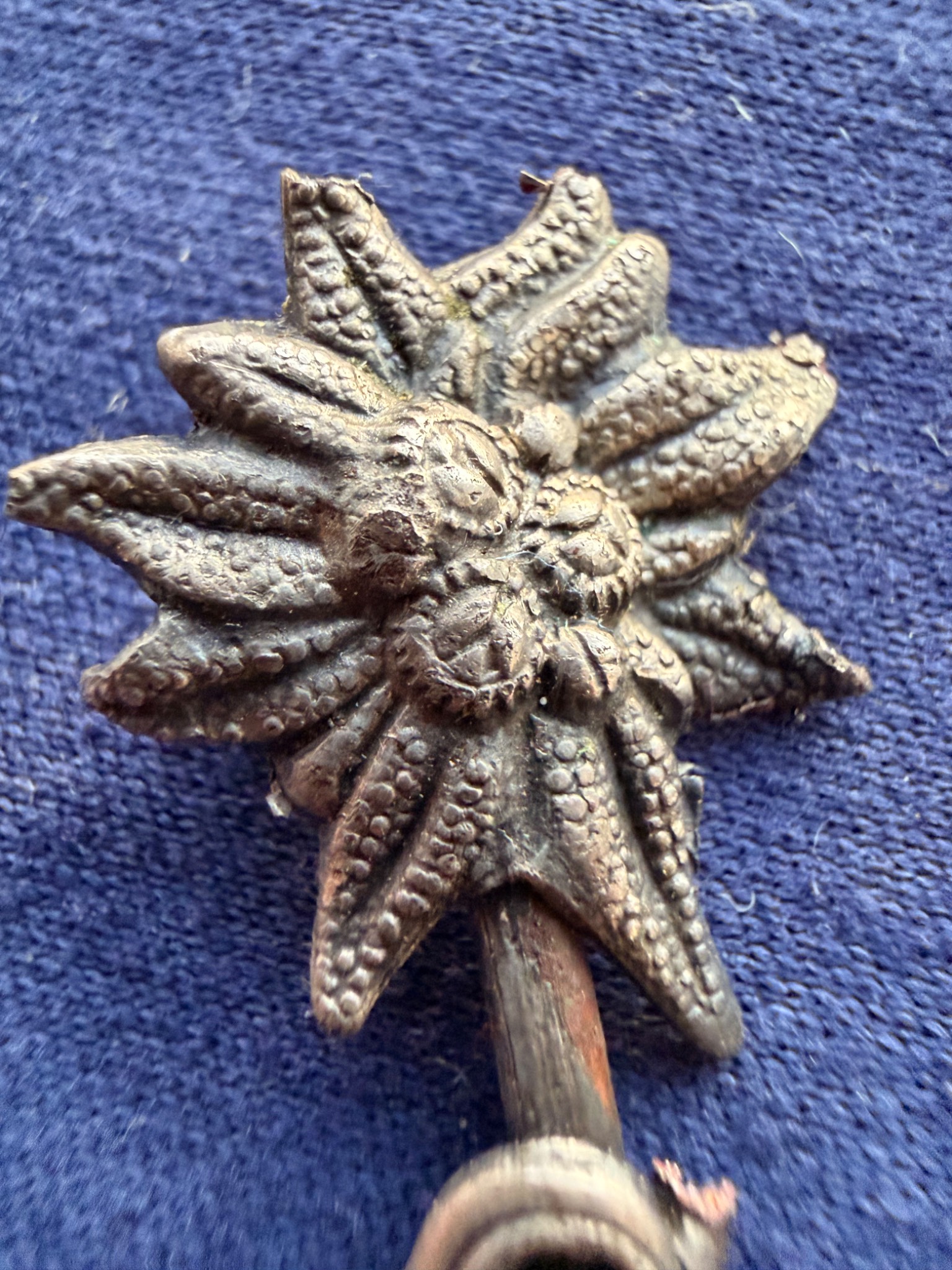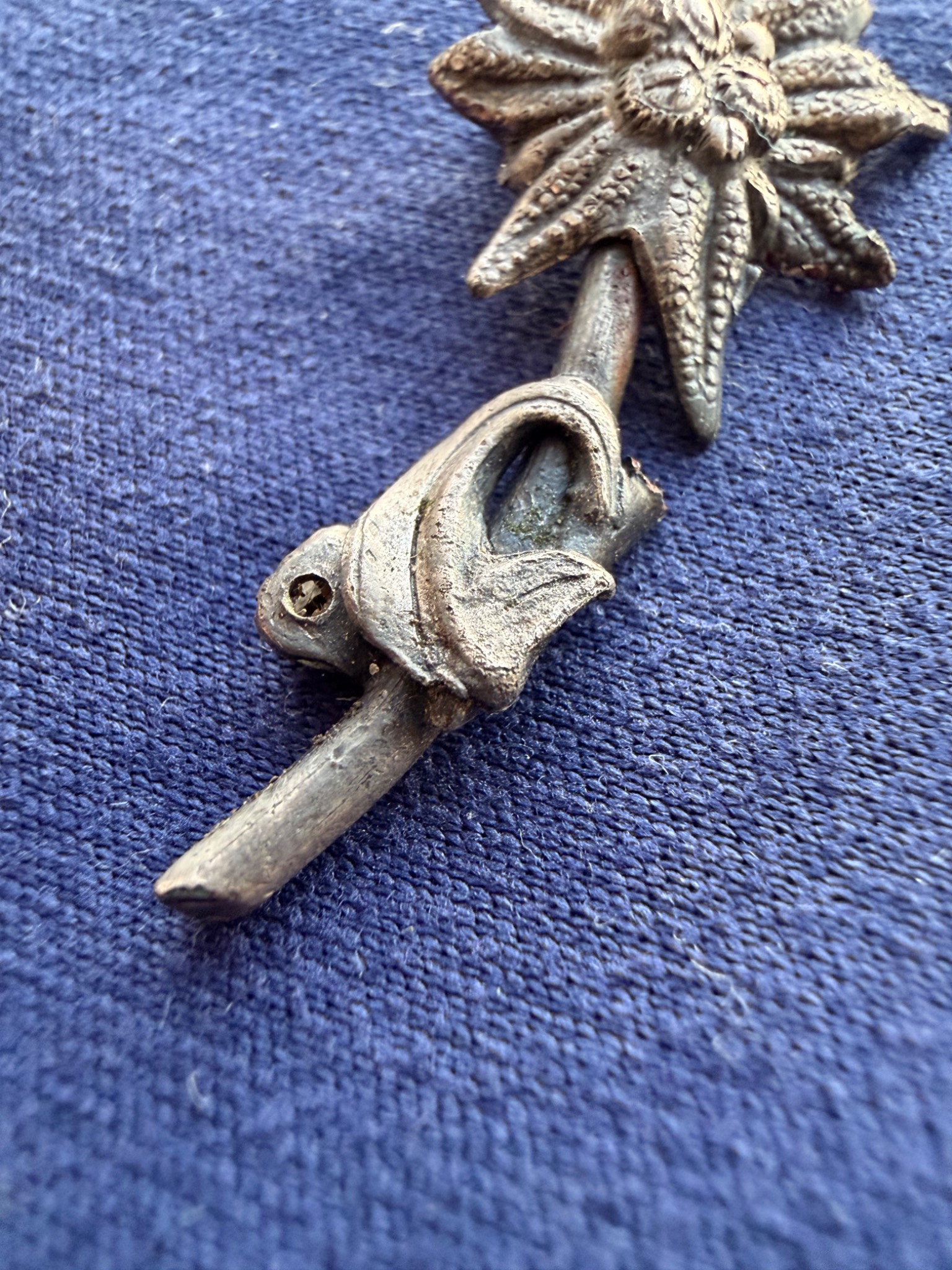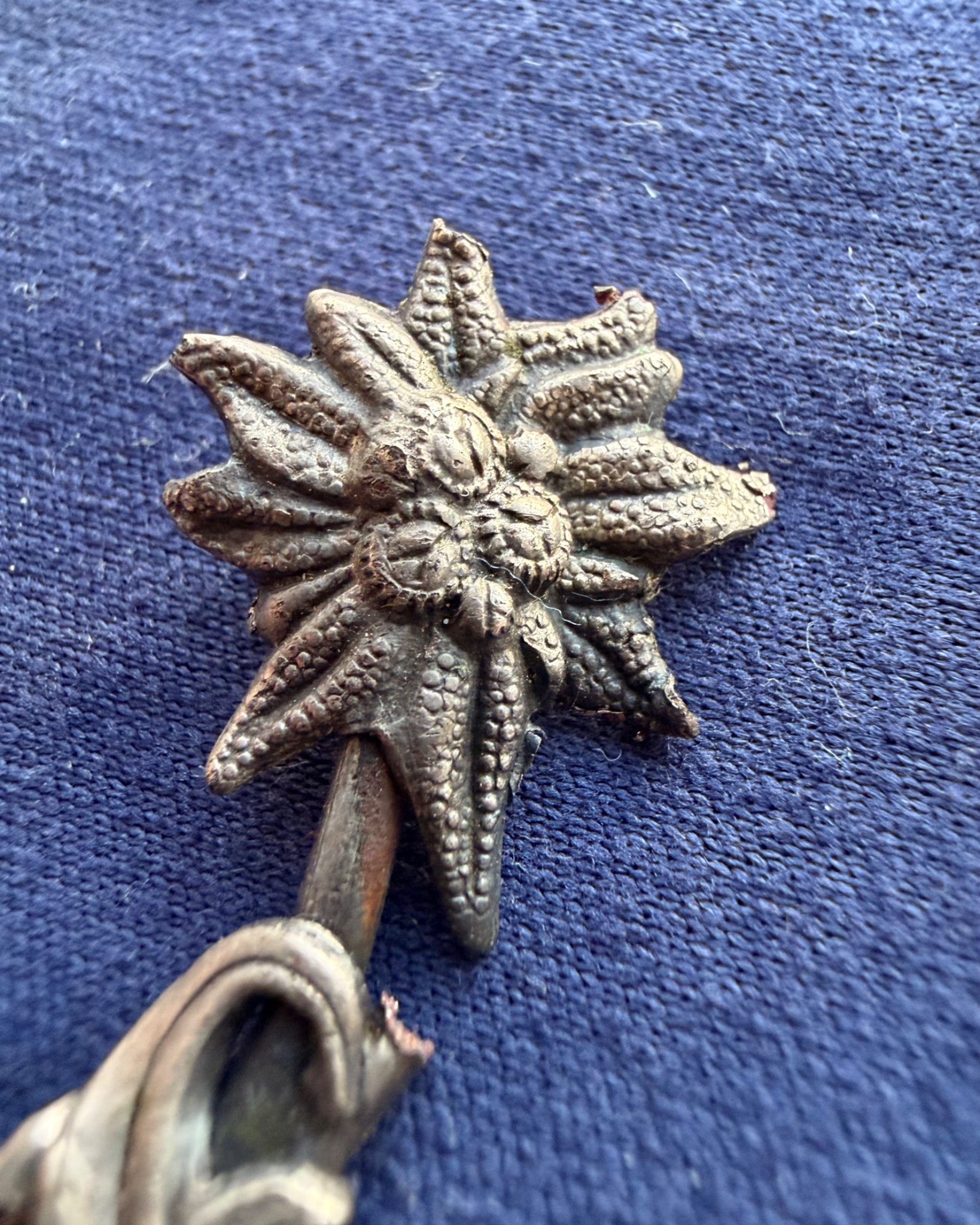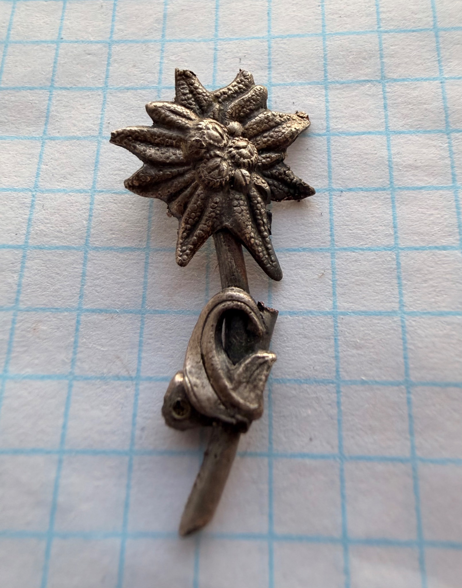 Квітка виконана зі срібла та має з внутрішньої сторони відповідні кріплення за зачіп під голку, тож ймовірно Едельвейс кріпився на одежу або ж Кепі.