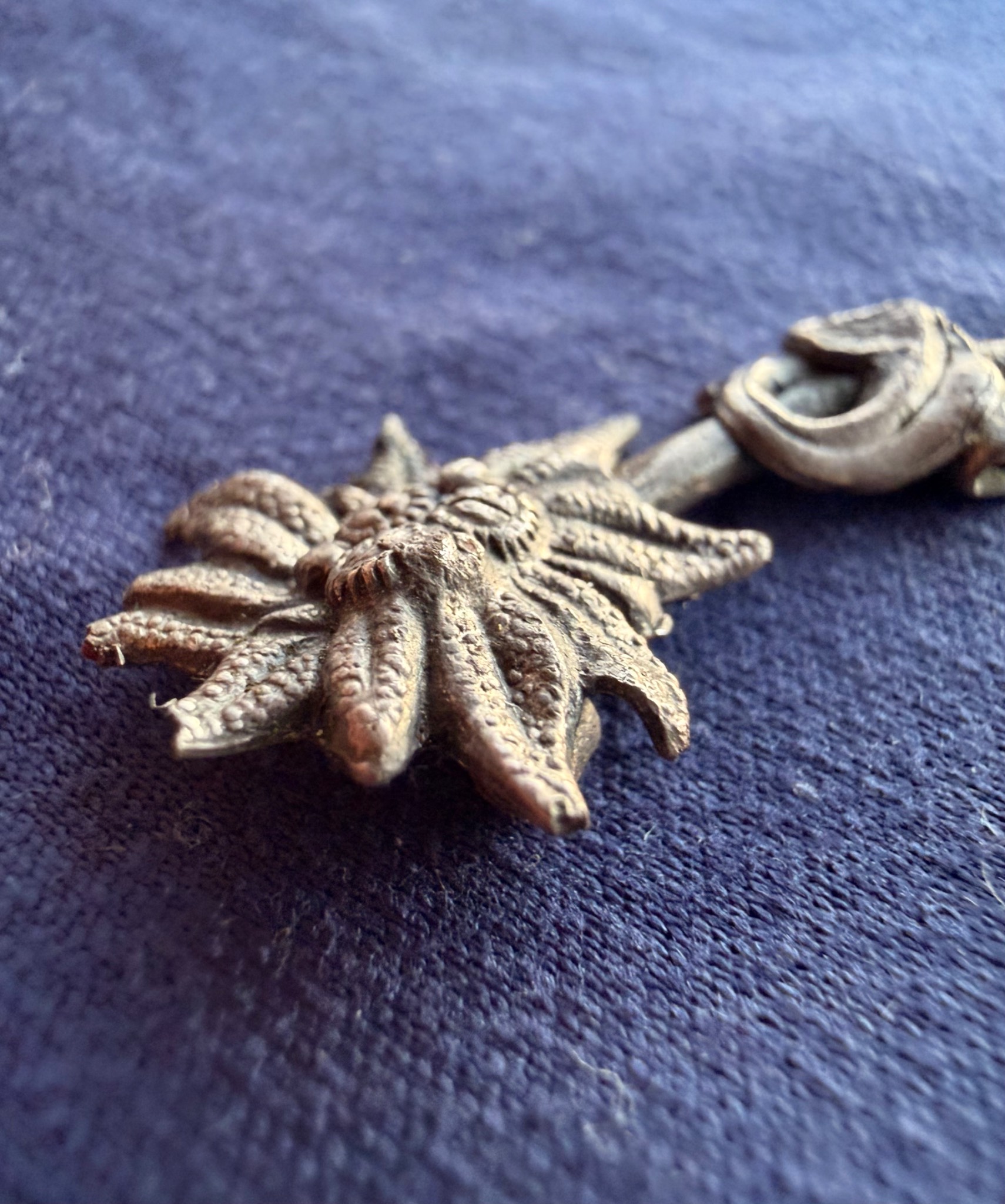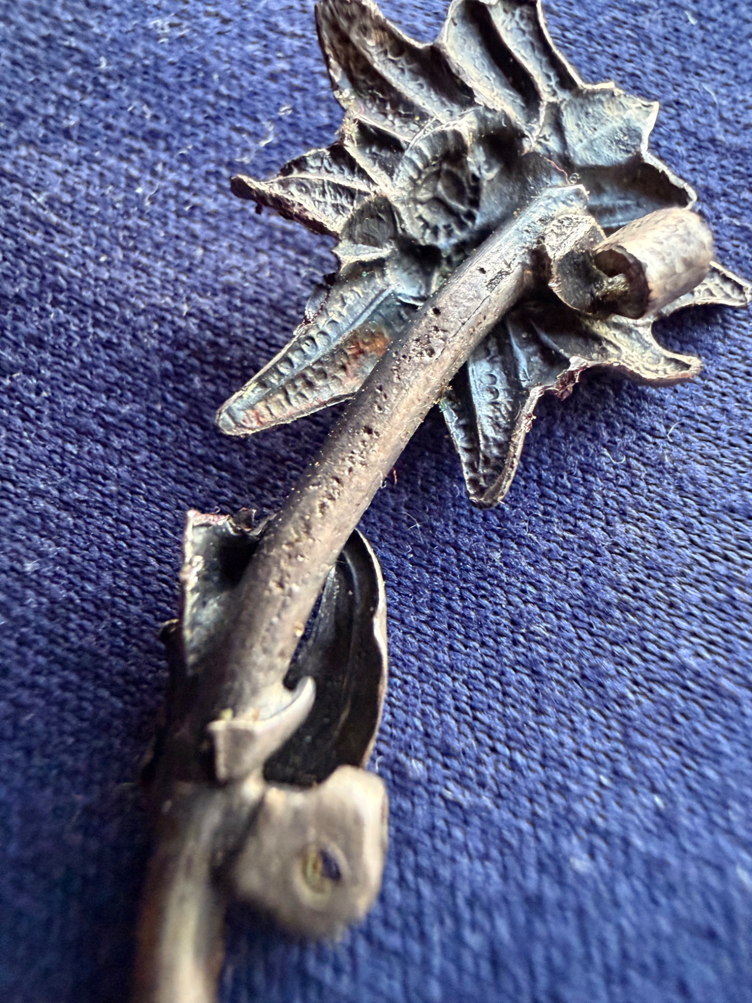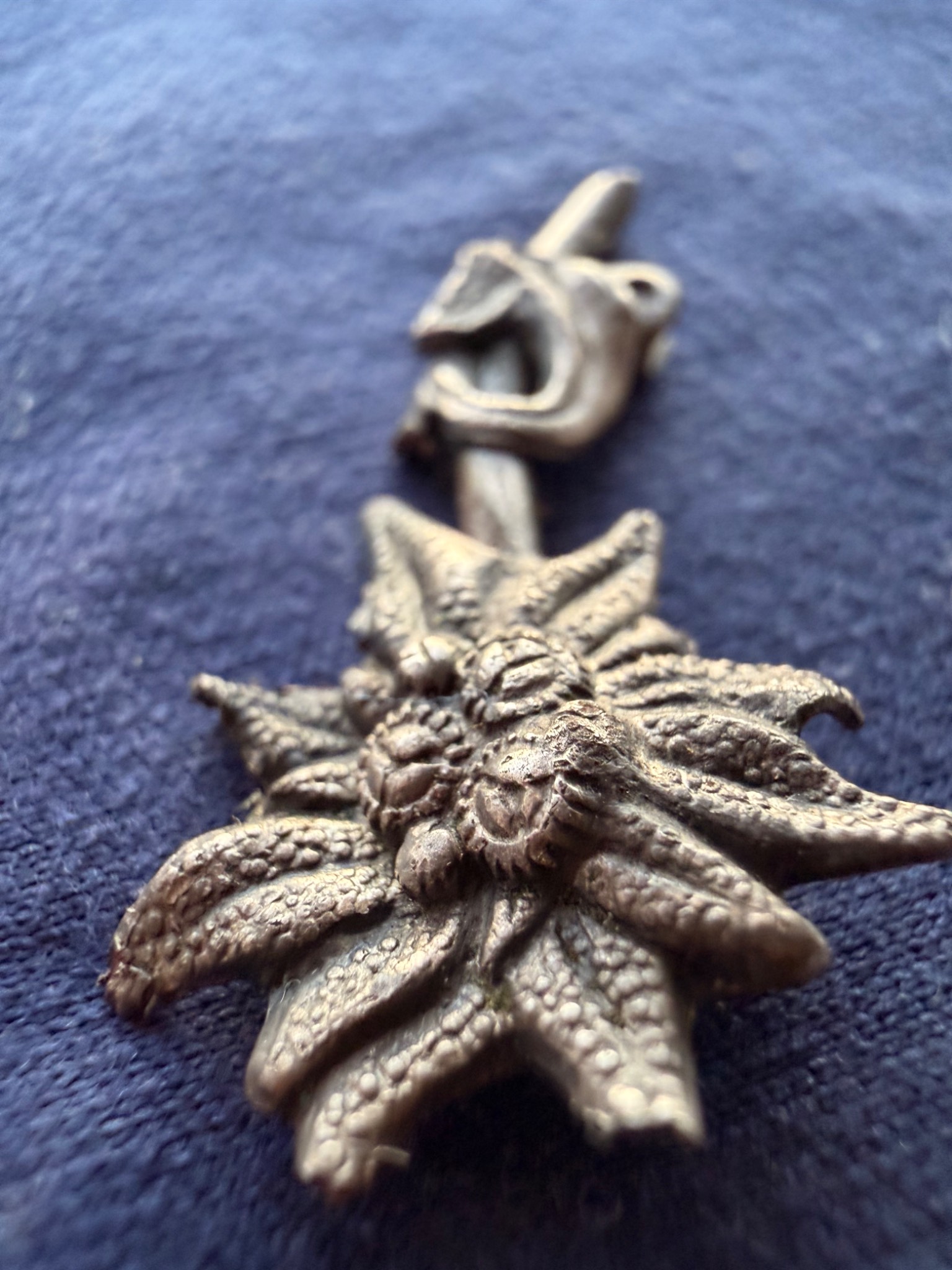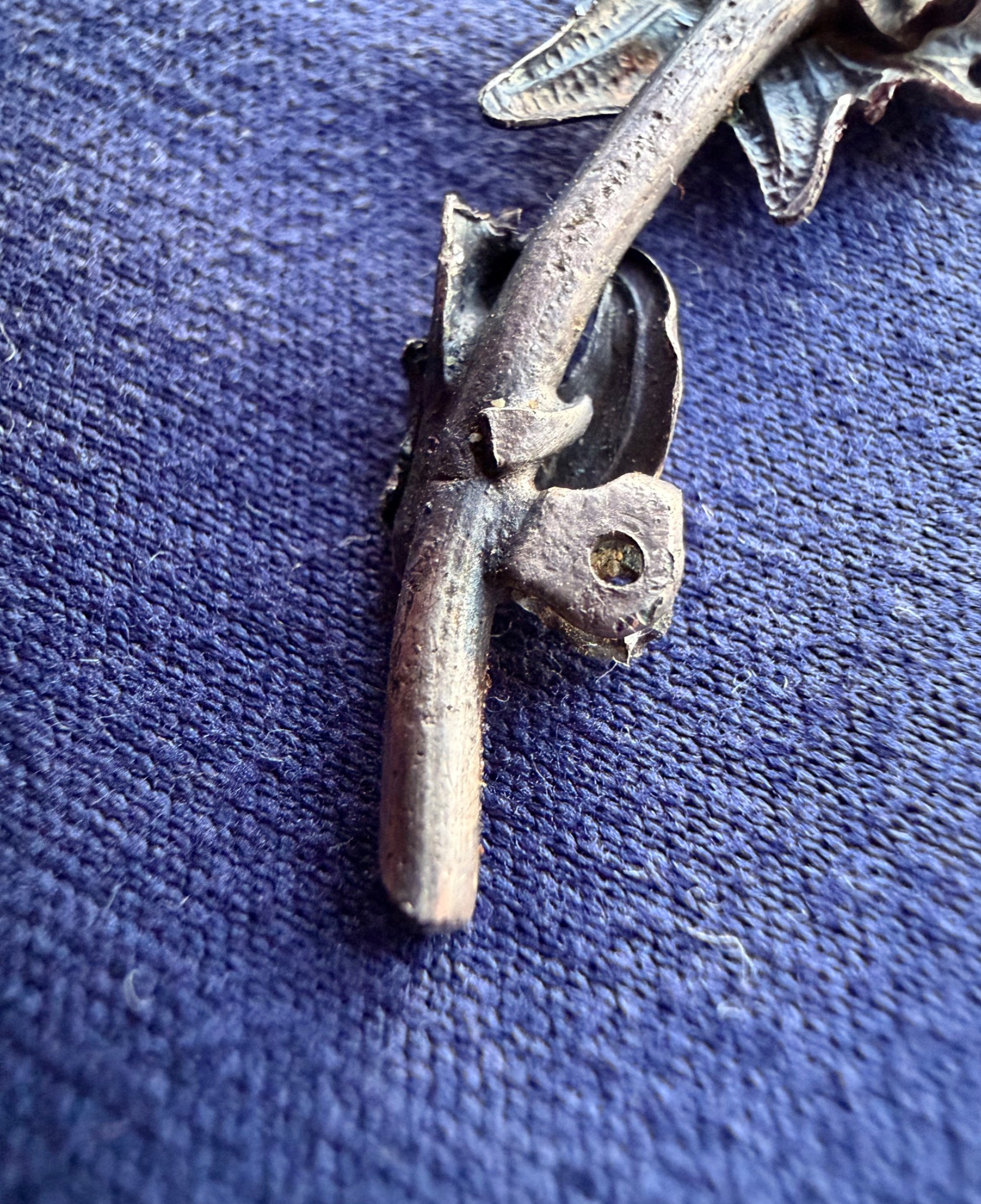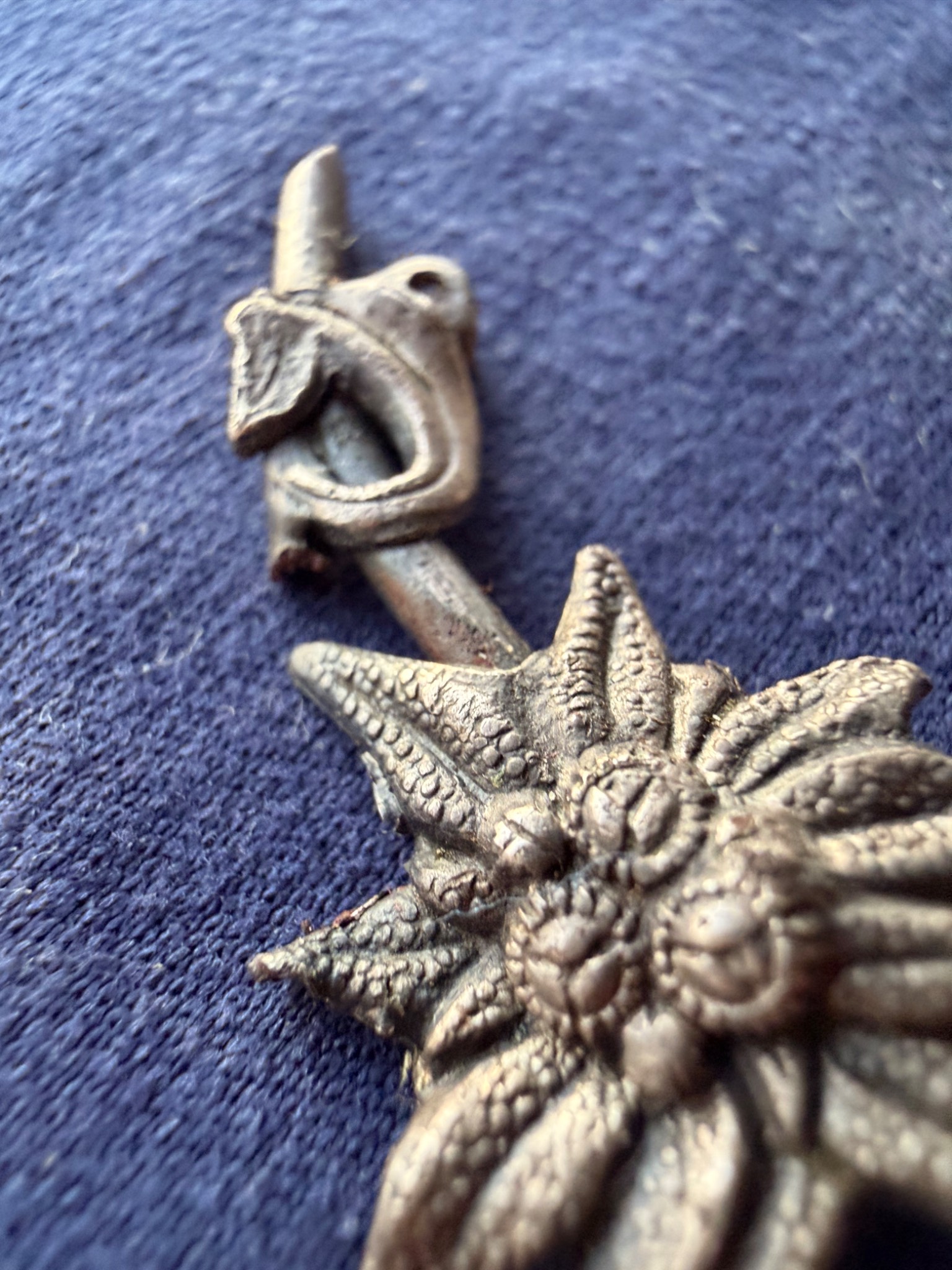 Квітка виконана зі срібла та має з внутрішньої сторони відповідні кріплення за зачіп під голку, тож ймовірно Едельвейс кріпився на одежу або ж Кепі.