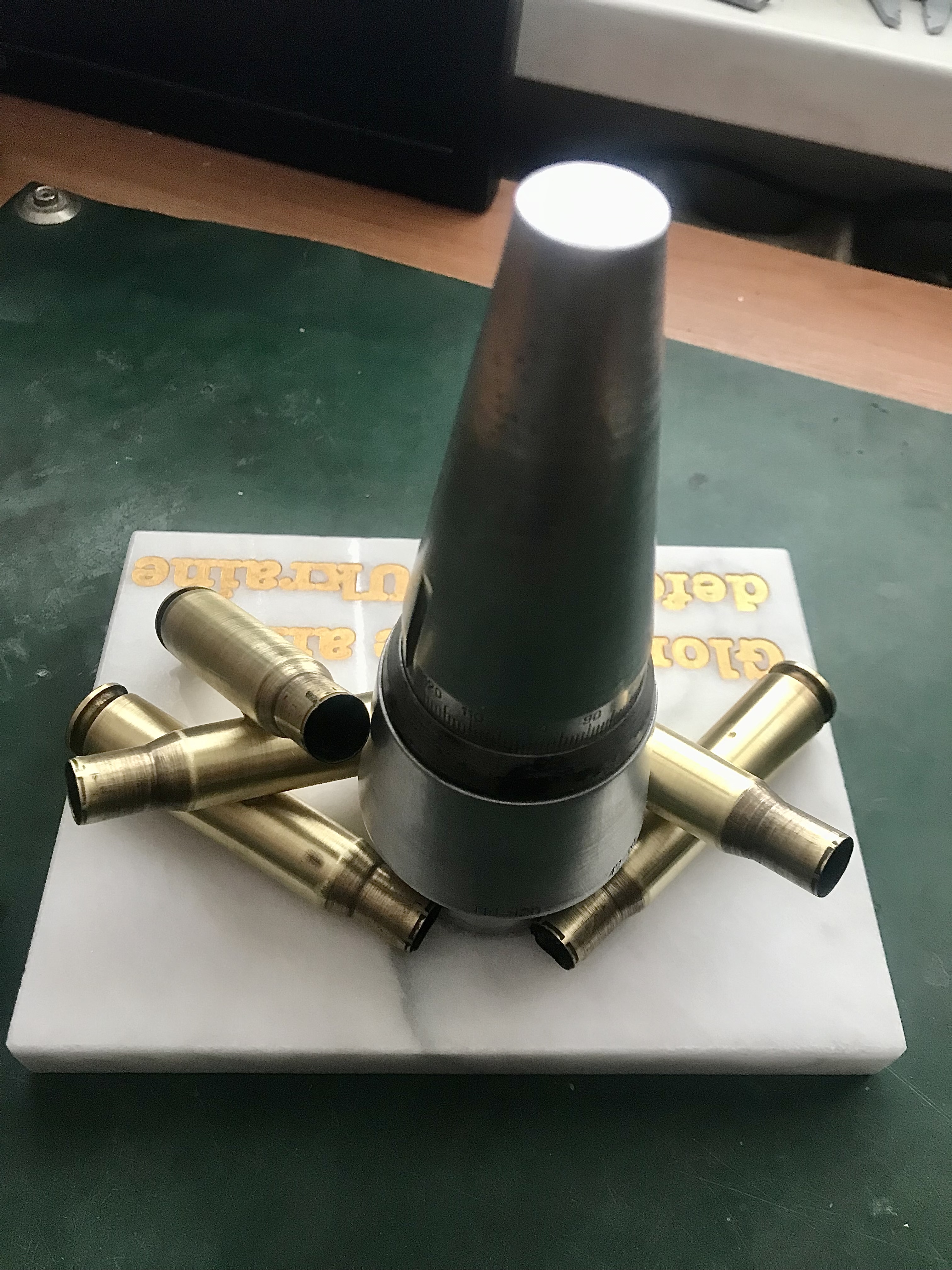 Стенд на подарок с трофеев войны, основа мраморная плита с гравировкой 200х150х20. Таймер с головной части ракеты «ураган», и крупнокалиберные гильзы.