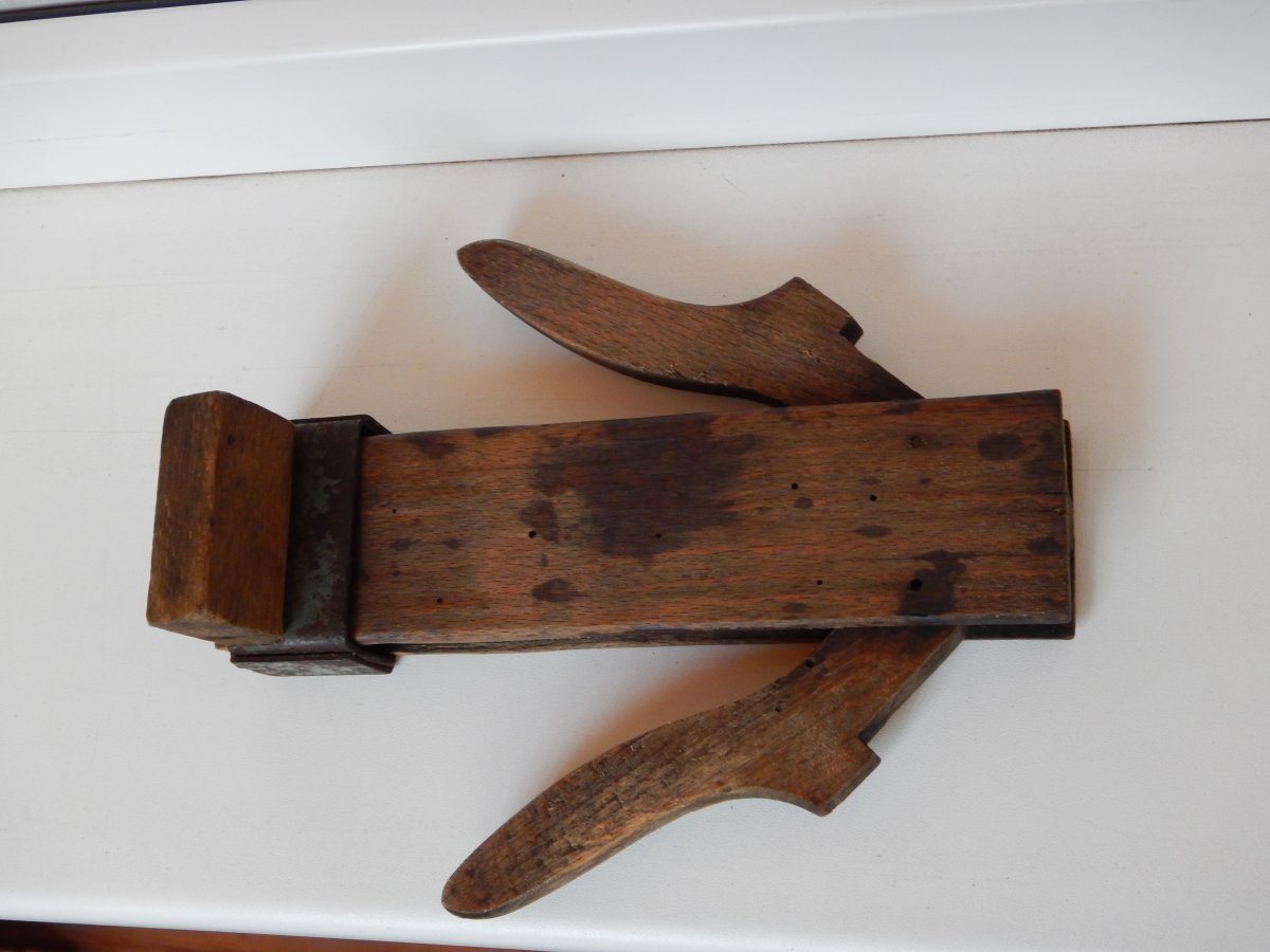 Вот такая приспособа для снятия сапог, разборная, можно носить с собой в ранце, состояние крепкое, рабочее, всё складывается/раскладывается без проблем, чердачная, на металлической части остатки краски цвета фельдграу. На крайних фото, для примера - две подобные немецкие приспособы, одна фабричная, другая копаная из блина (естественно, в лот не входят).